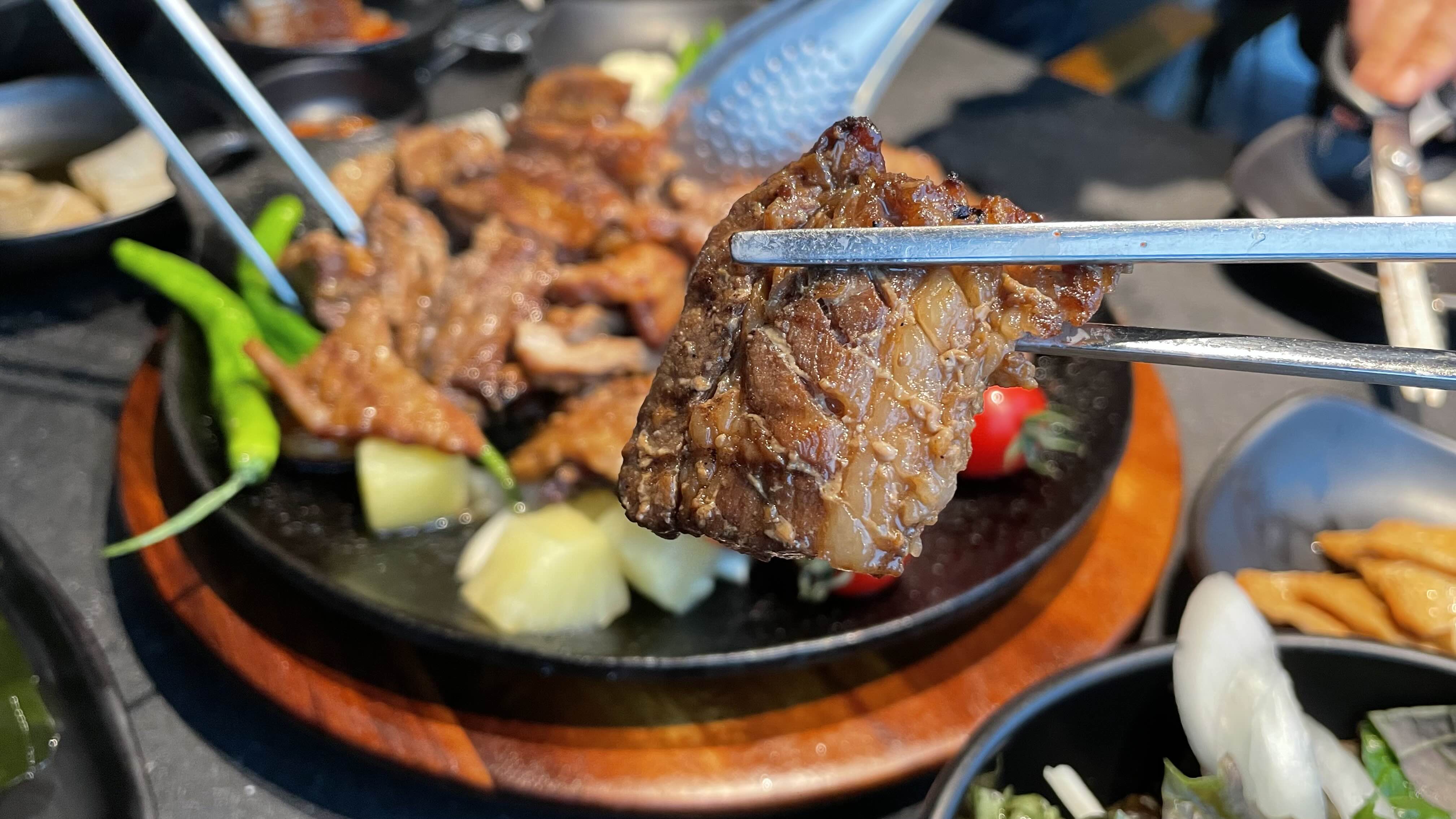 돼지갈비는 테이블에서 숯불에 구워먹는 방식이 아닌 완전히 조리되어 나옵니다.