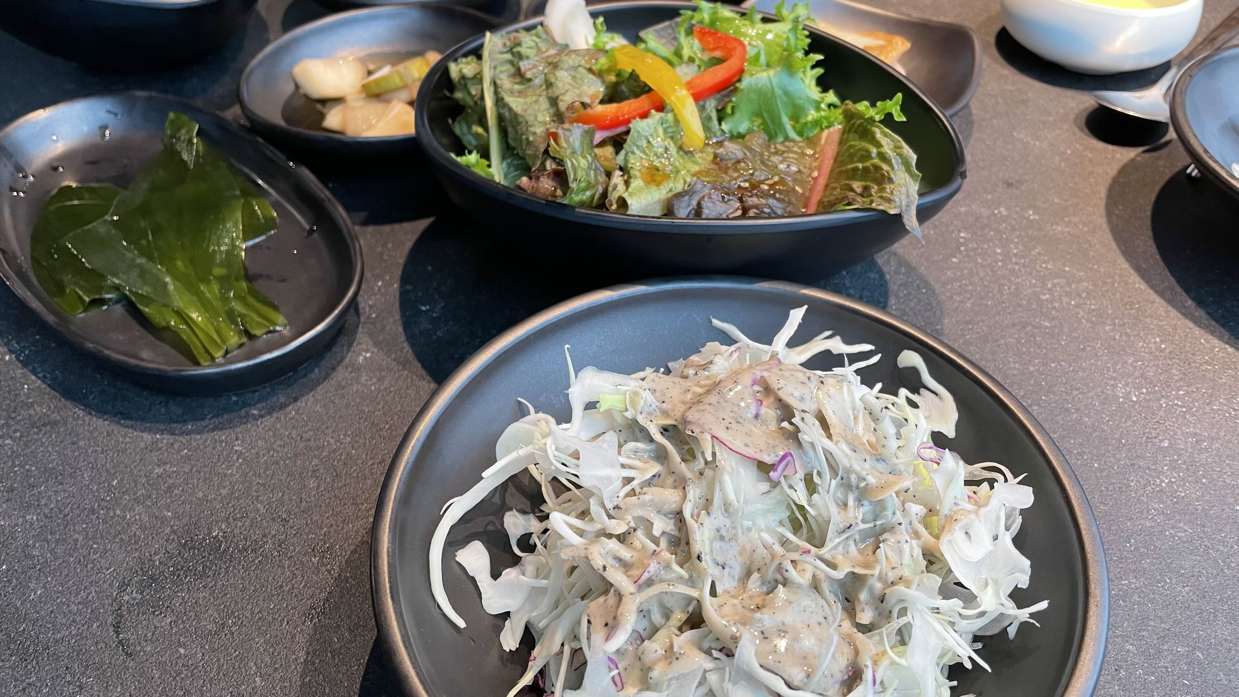 반찬은 어묵볶음, 앙배추 샐러드, 배추김치, 백김치, 명이나물, 양파 장아찌, 상추&치커리 샐러드 이렇게 나왔네요.