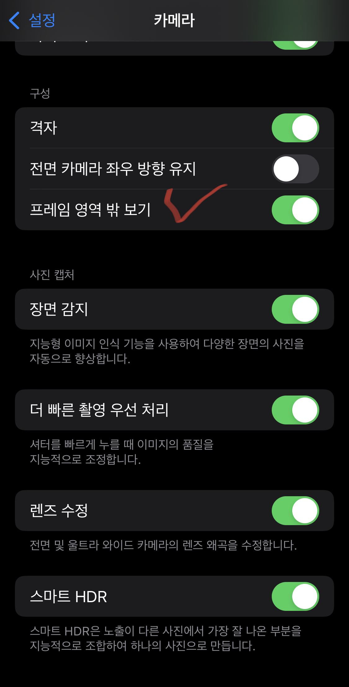 설정 > 카메라 > 프레임 영역 밖 보기 입니다.