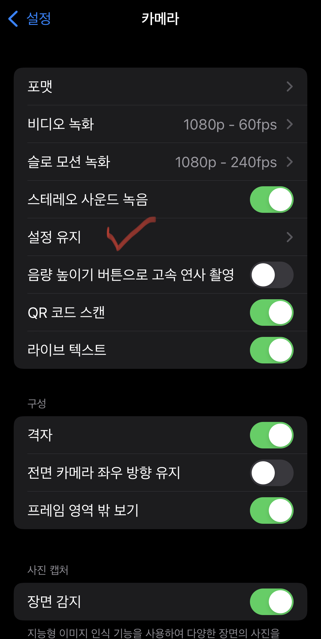 먼저 설정 > 카메라 > 설정유지 메뉴로 들어가 주세요.