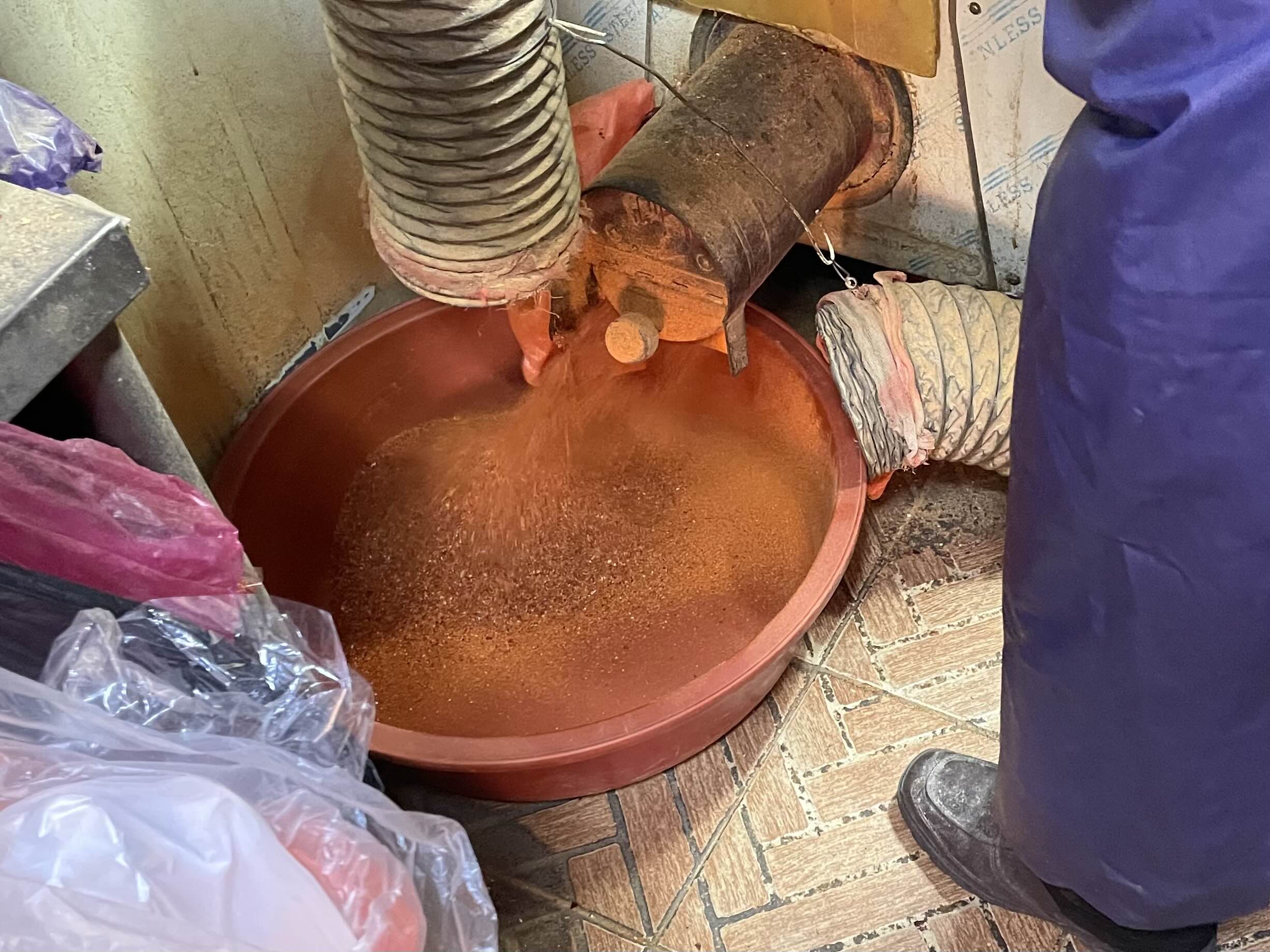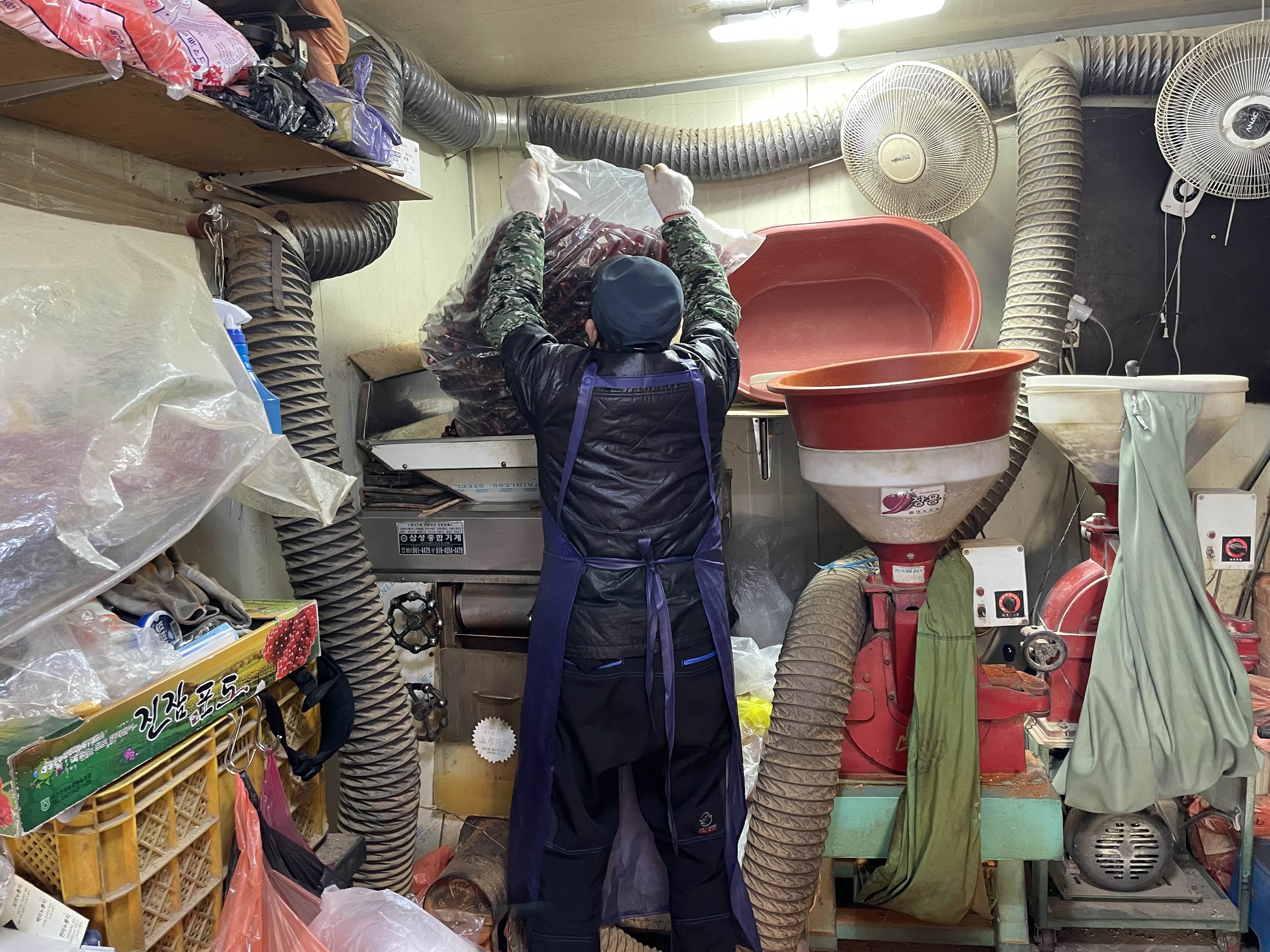 빨갛게 잘 말린 고추를 기계에 넣으시던 사장님께서 물을 좀 뿌려도 되냐고 물어보셨습니다.