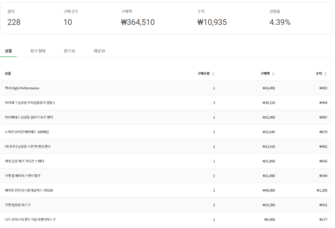 파트너스 홈페이지에서 상품 링크 및 수익 그리고 어떤상품을 구매했는지 등등을 확인할 수 있습니다.