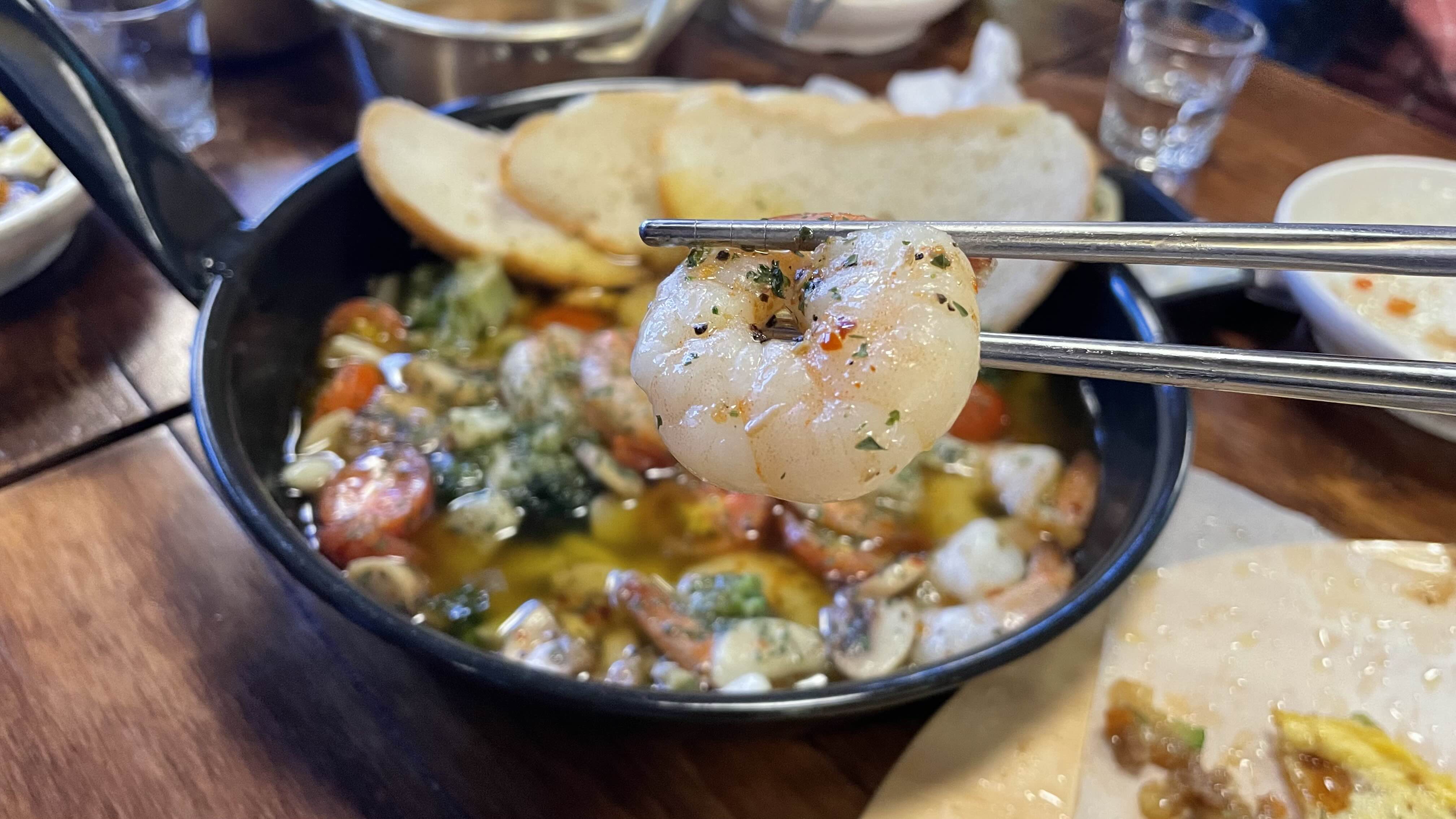 올리브오일 가득한 팬에 새우가 들어간 스페인 요리로,