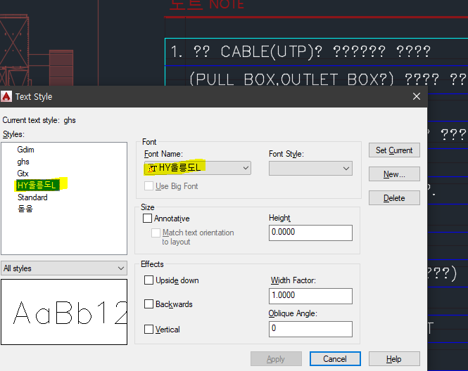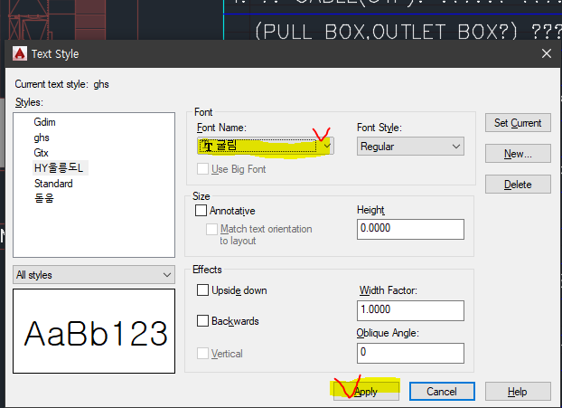 누락된 폰트를 구할 수 없는 상황이라면 도면 상의 한글을 내 컴퓨터에 설치된 폰트로 변경해 줍니다.
