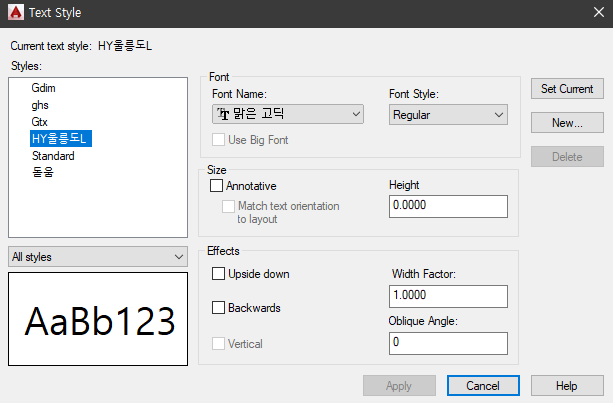 Style 명령으로 폰트 설정창을 띄워 보면 Style 의 Font 가 모두 맑은 고딕으로 변경된 것을 확인할 수 있습니다.