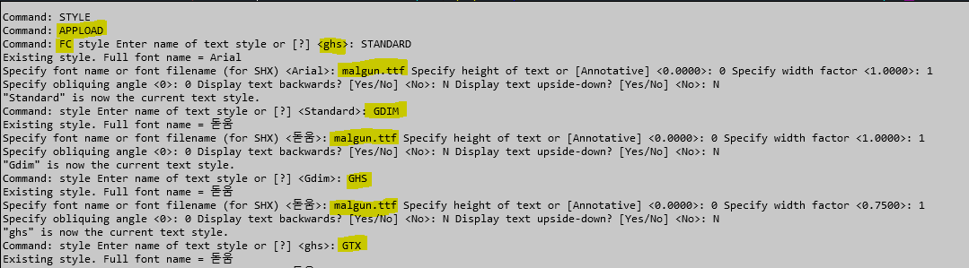 도면 내 Style 의 Font 를 malgun.ttf (맑은고딕) 으로 모두 변경하는 명령이 실행됩니다.