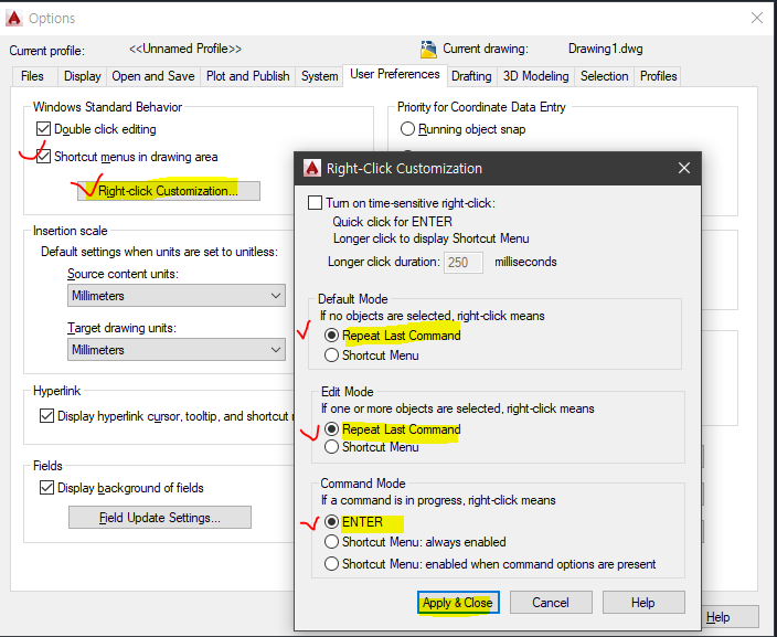 Right-click Customization..을 눌러서 우클릭에 대한 설정을 "Repeat Last Command" 로 변경하고,
