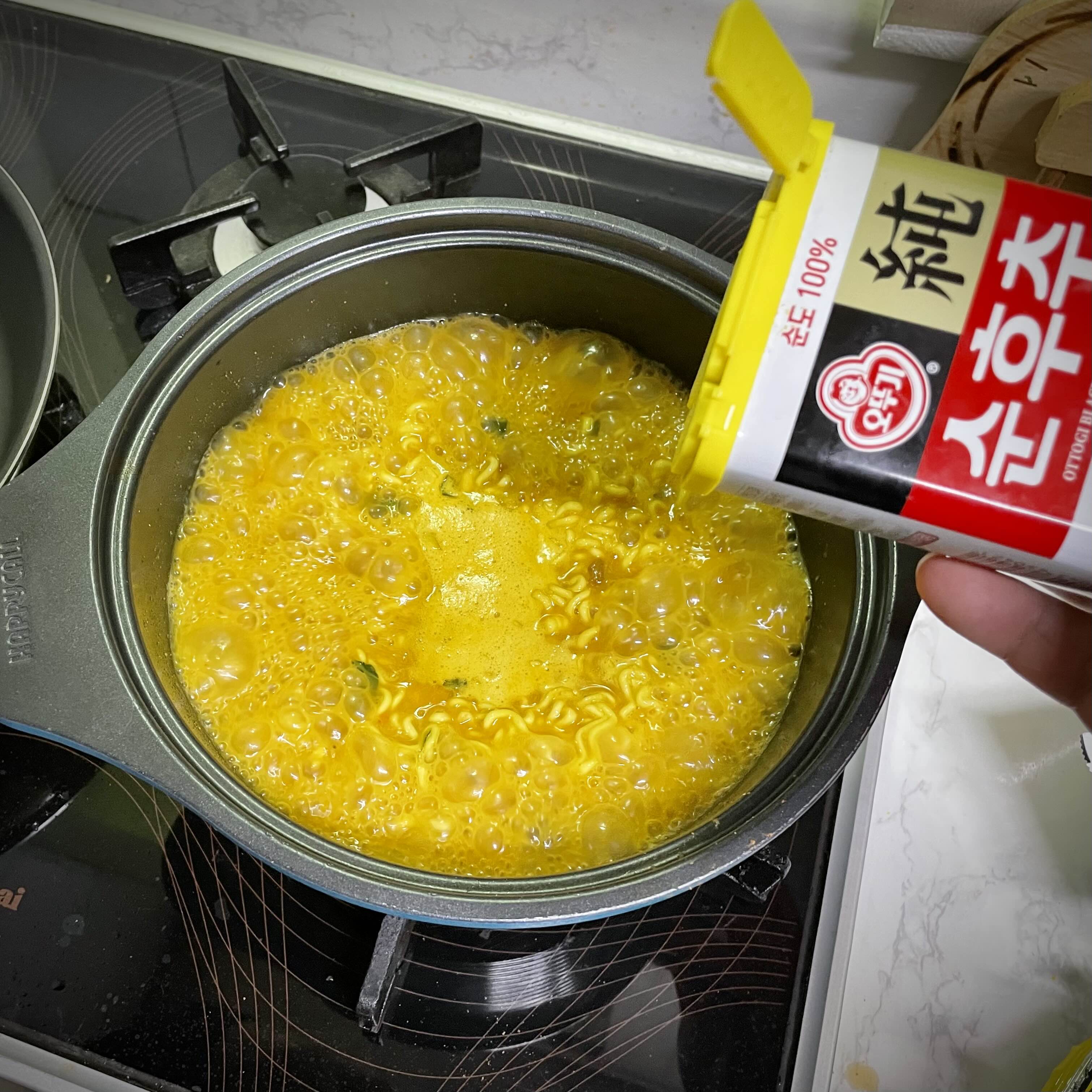 1. 라면 1개 기준 물 3컵을 건더기스프를 넣고 끓여줍니다.