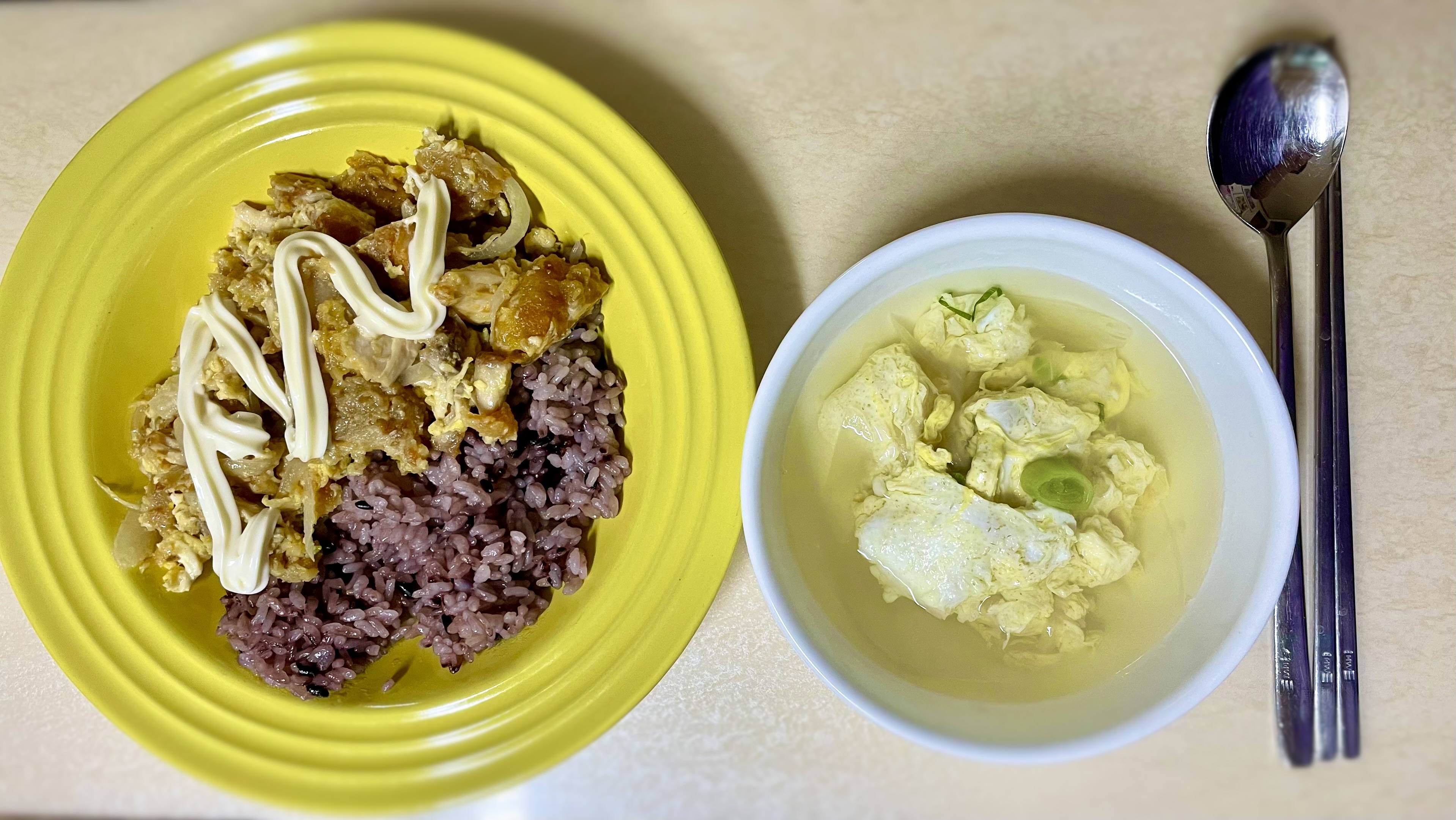 뚝딱 만든 달걀국과 남은치킨으로 만든 치킨마요덮밥으로 주말 아침을 간단히 해결했답니다.