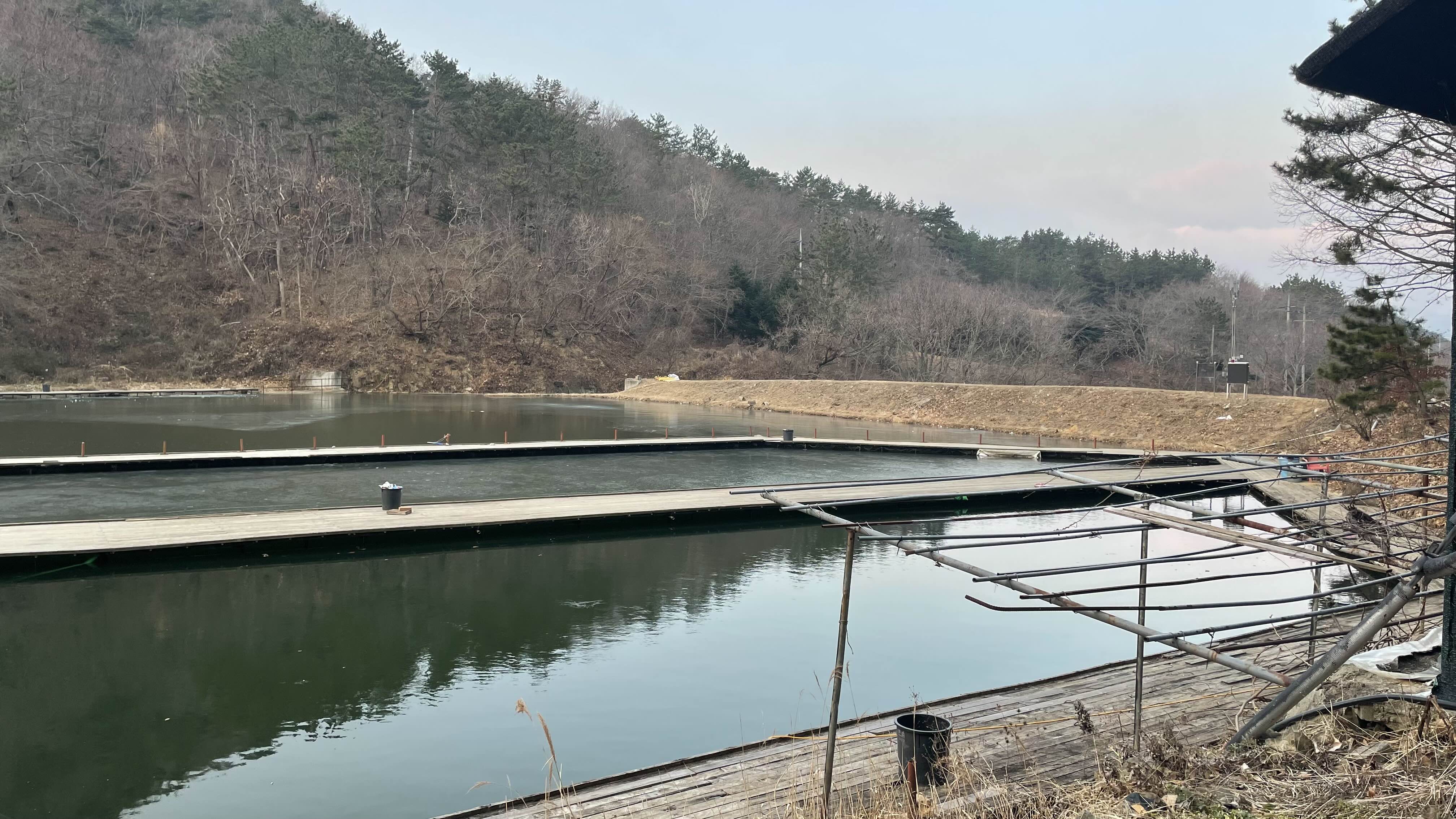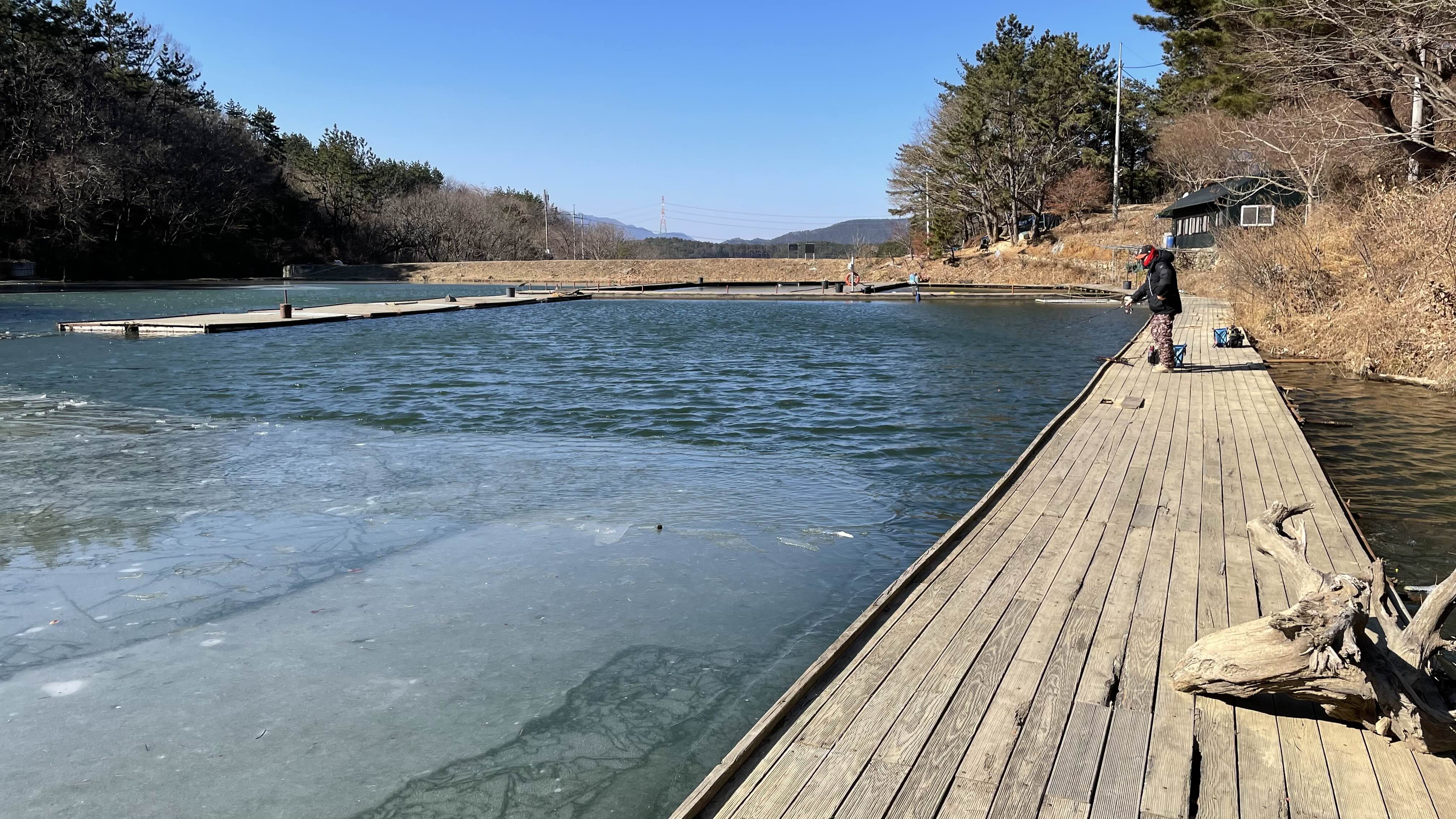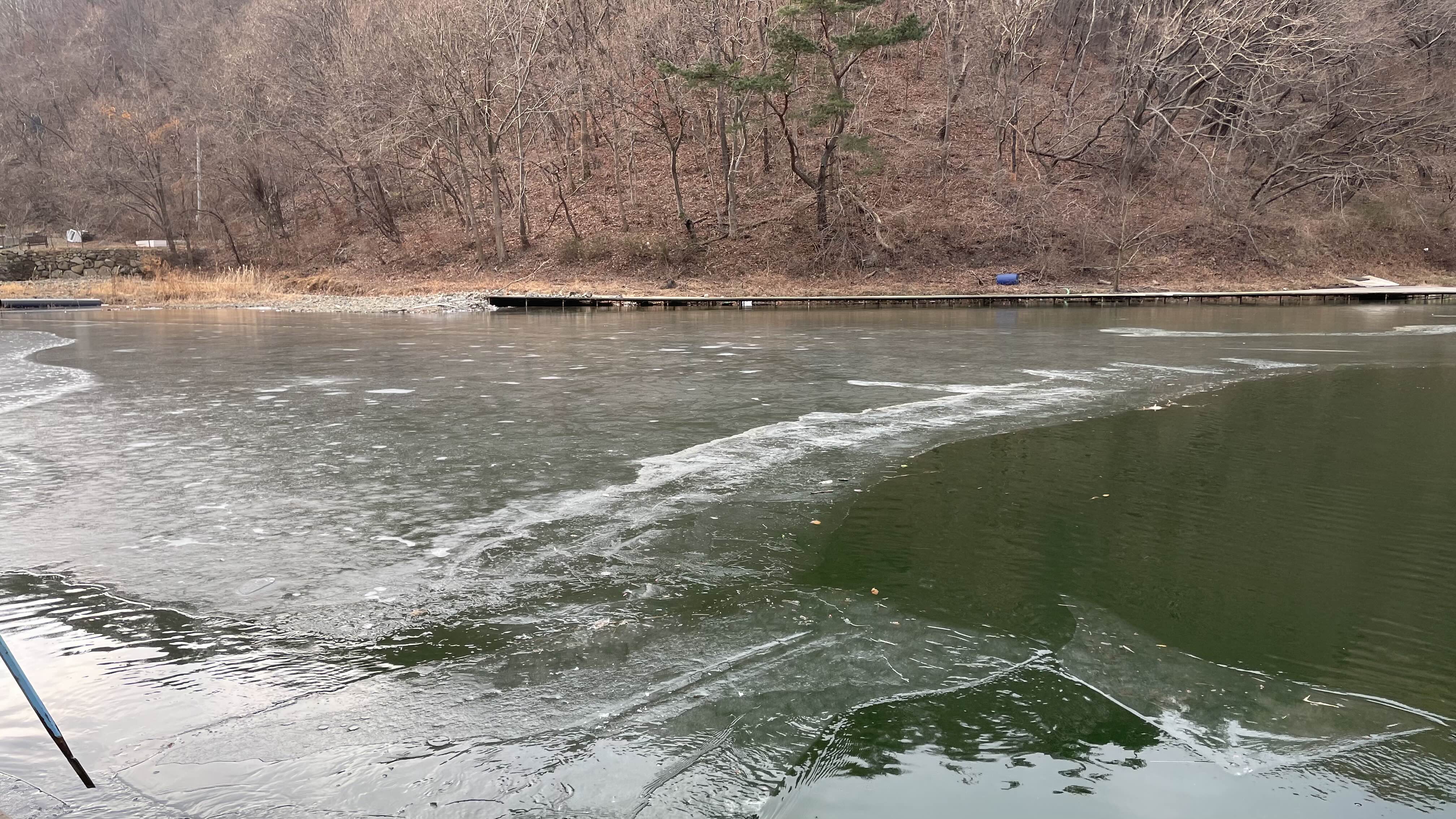 낚시터 상류에는 아직 얼음이 얼어 있습니다.