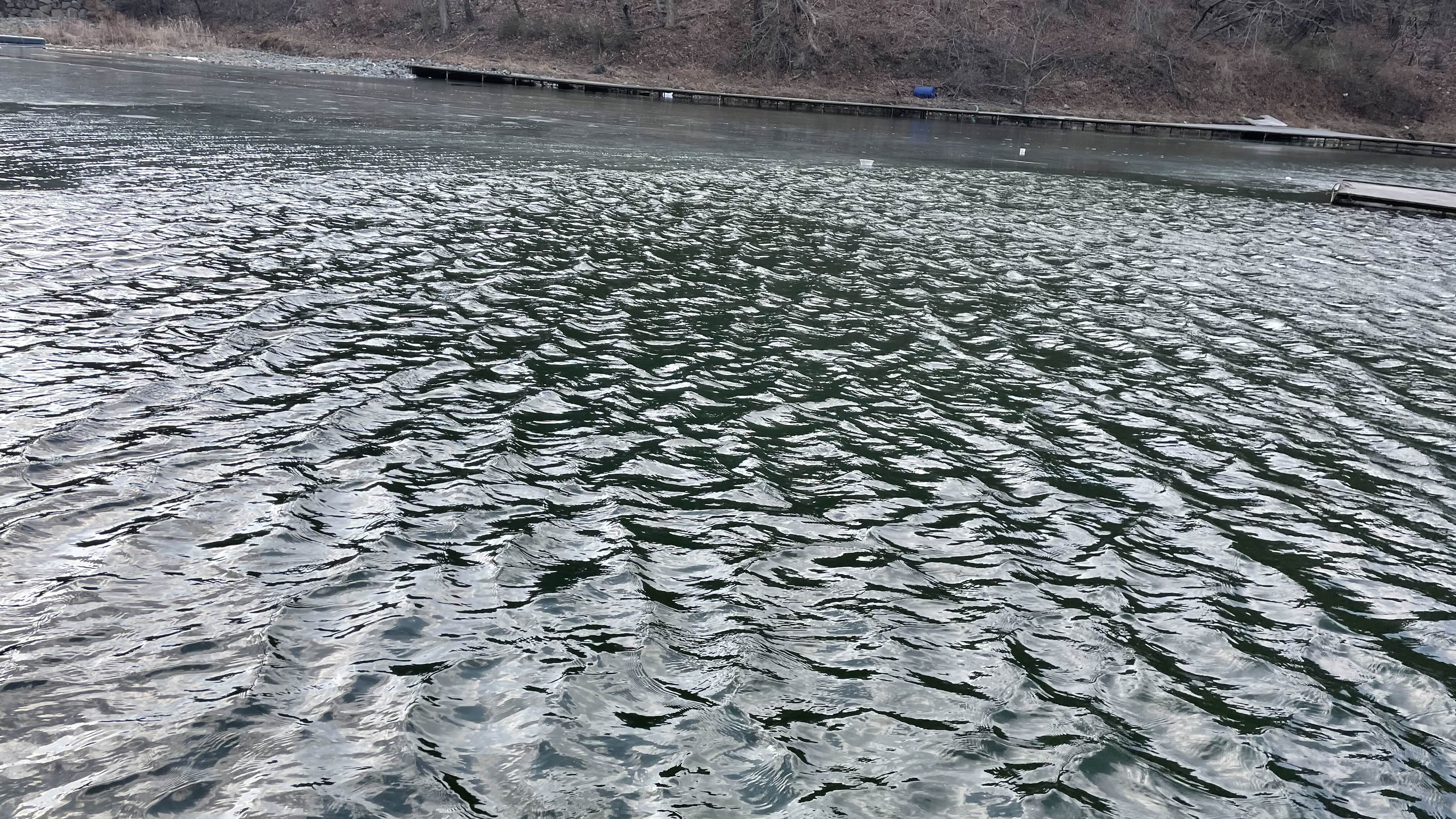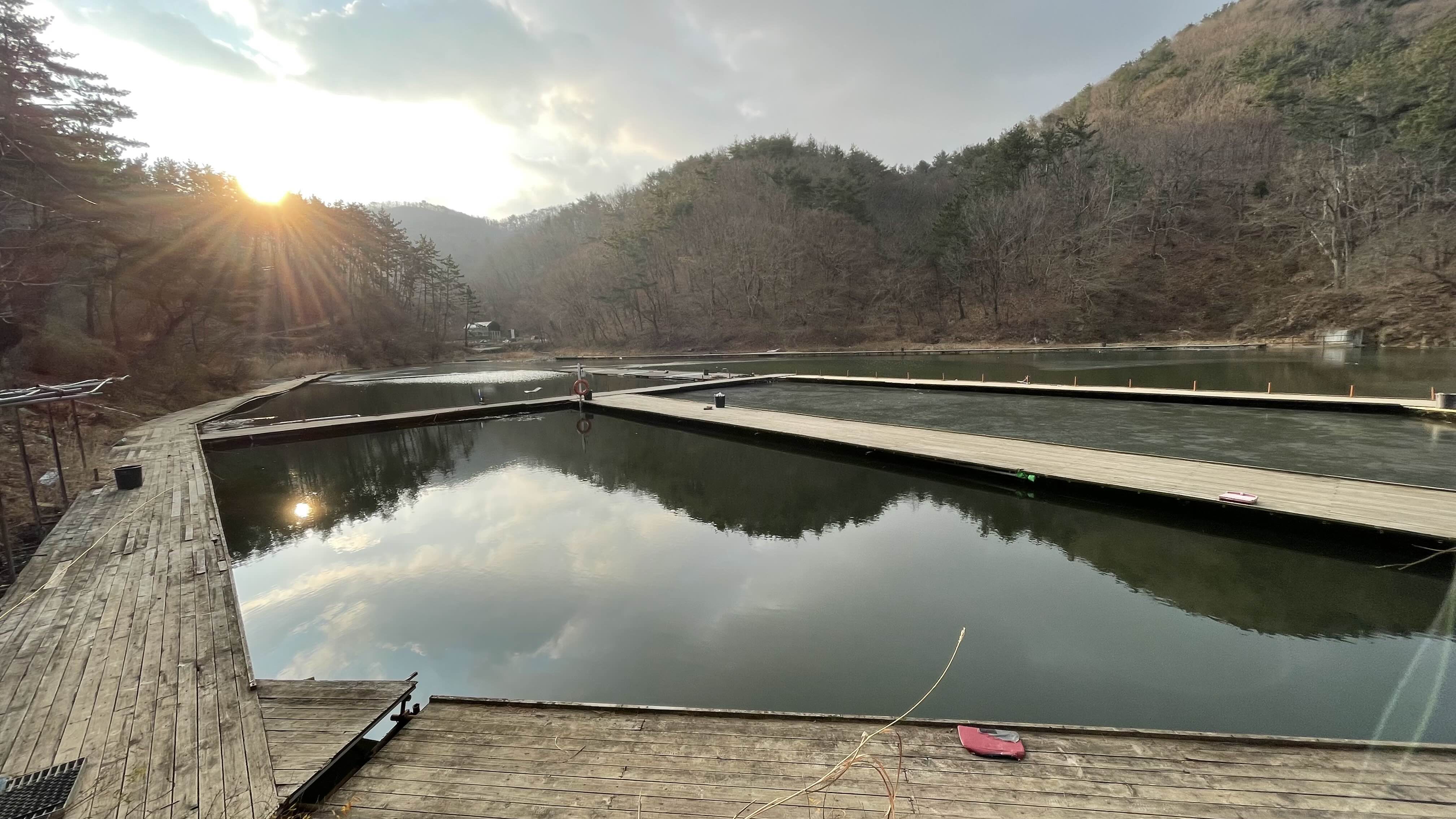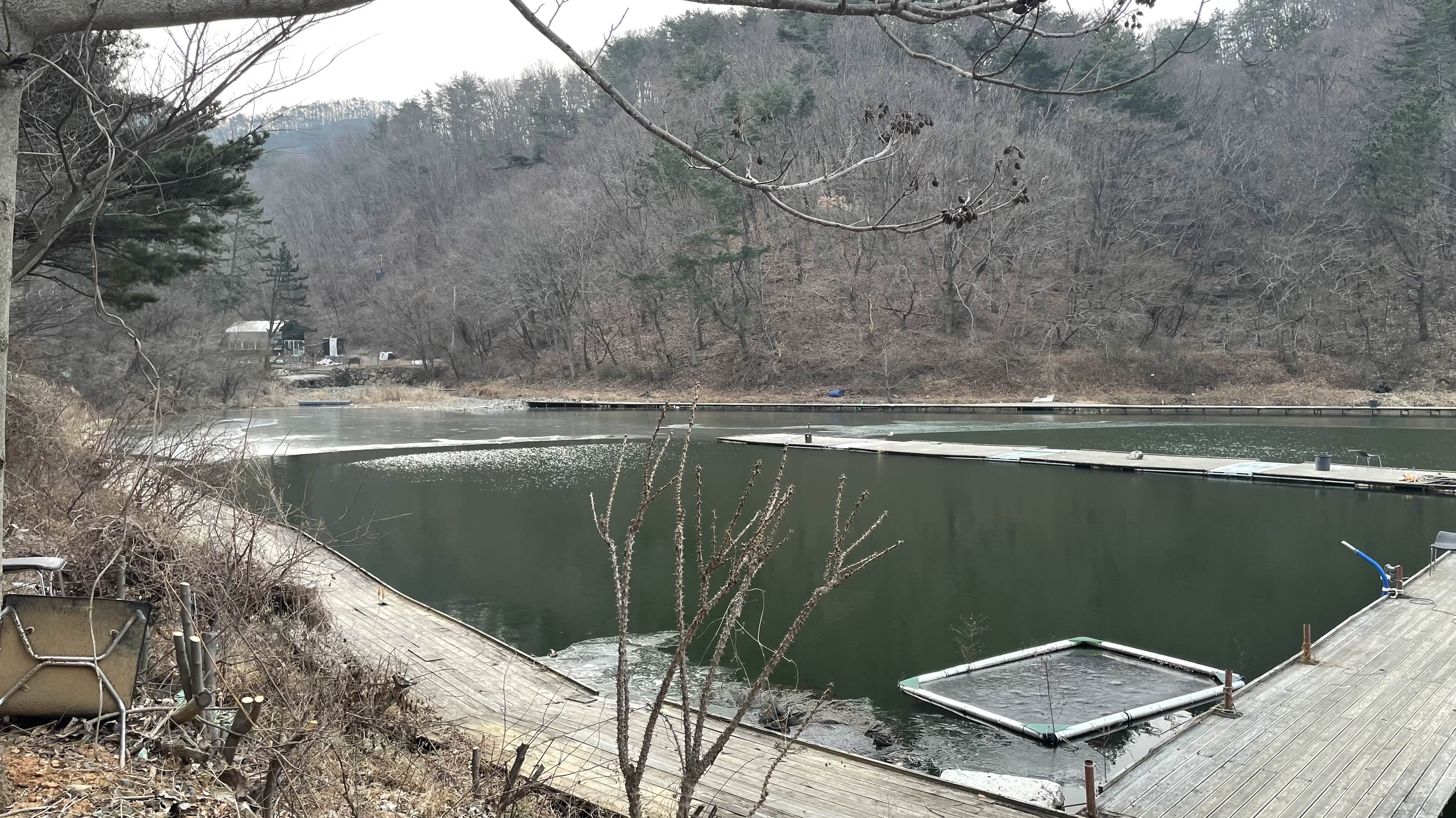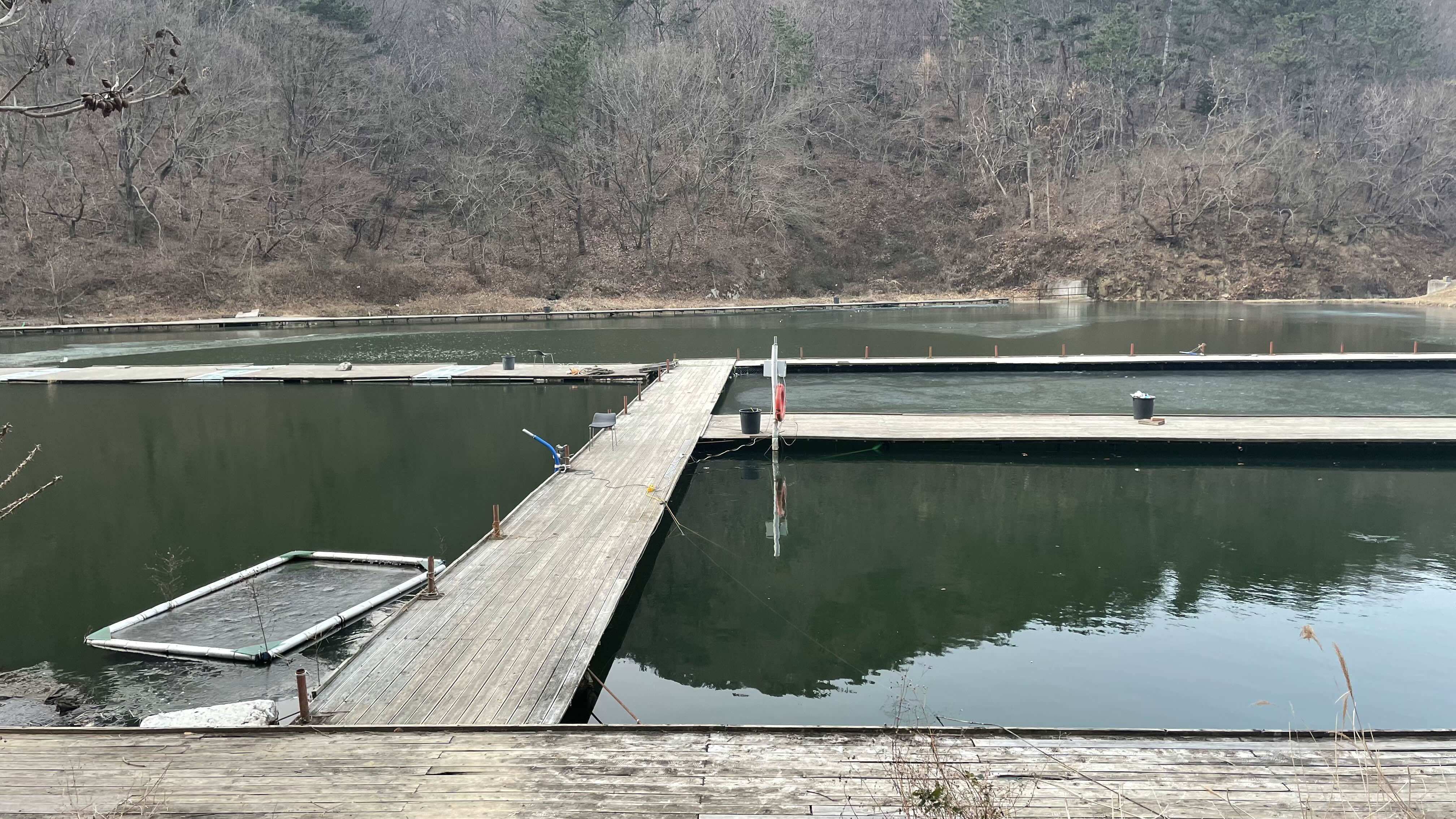 낚시터 상류에는 아직 얼음이 얼어 있습니다.