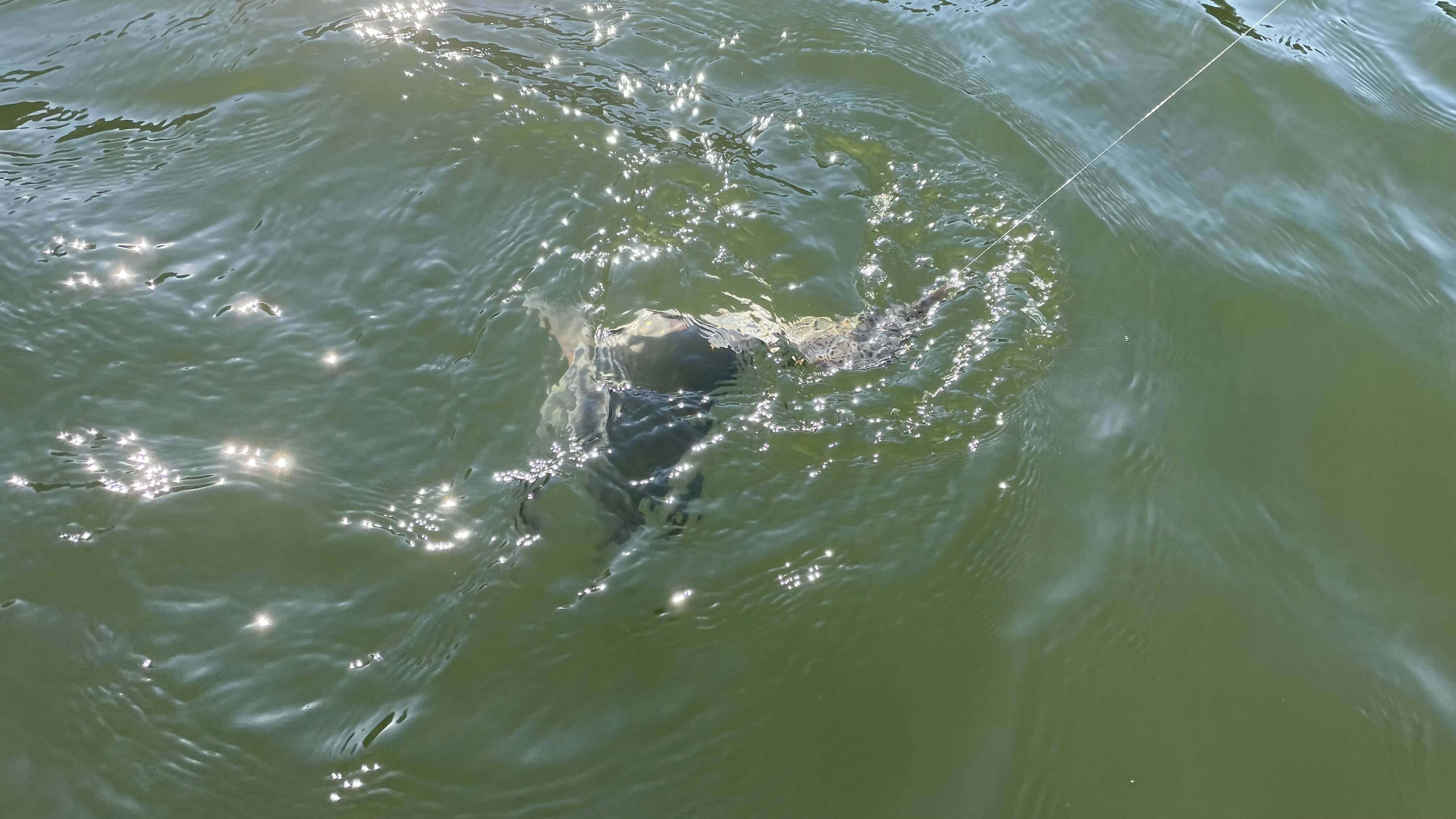 바늘이 꼬리 지느러미에 걸렸습니다.