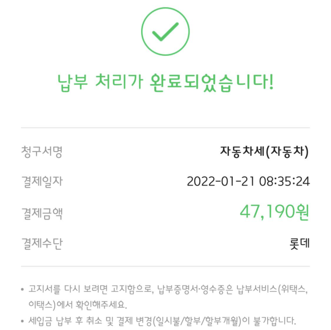 결제금액을 확인한 다음 원하는 결제방법으로 결제를 진행해 주시면 자동차세 납부가 완료됩니다.