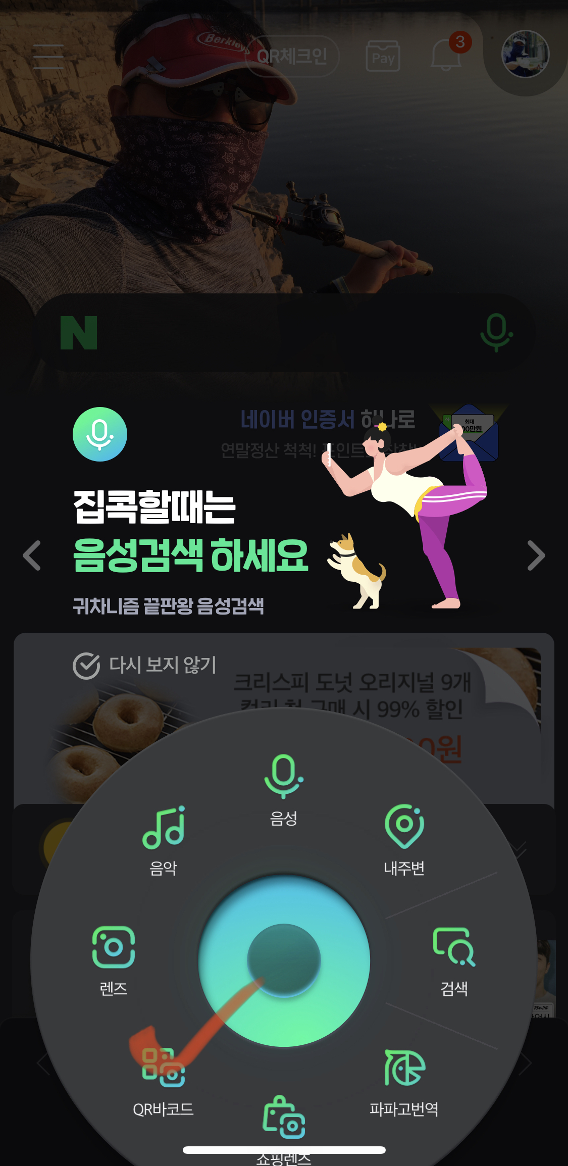 네이버 앱 실행 후 하단 동그란 버튼 클릭하면 다양한 메뉴가 뜨잖아요.