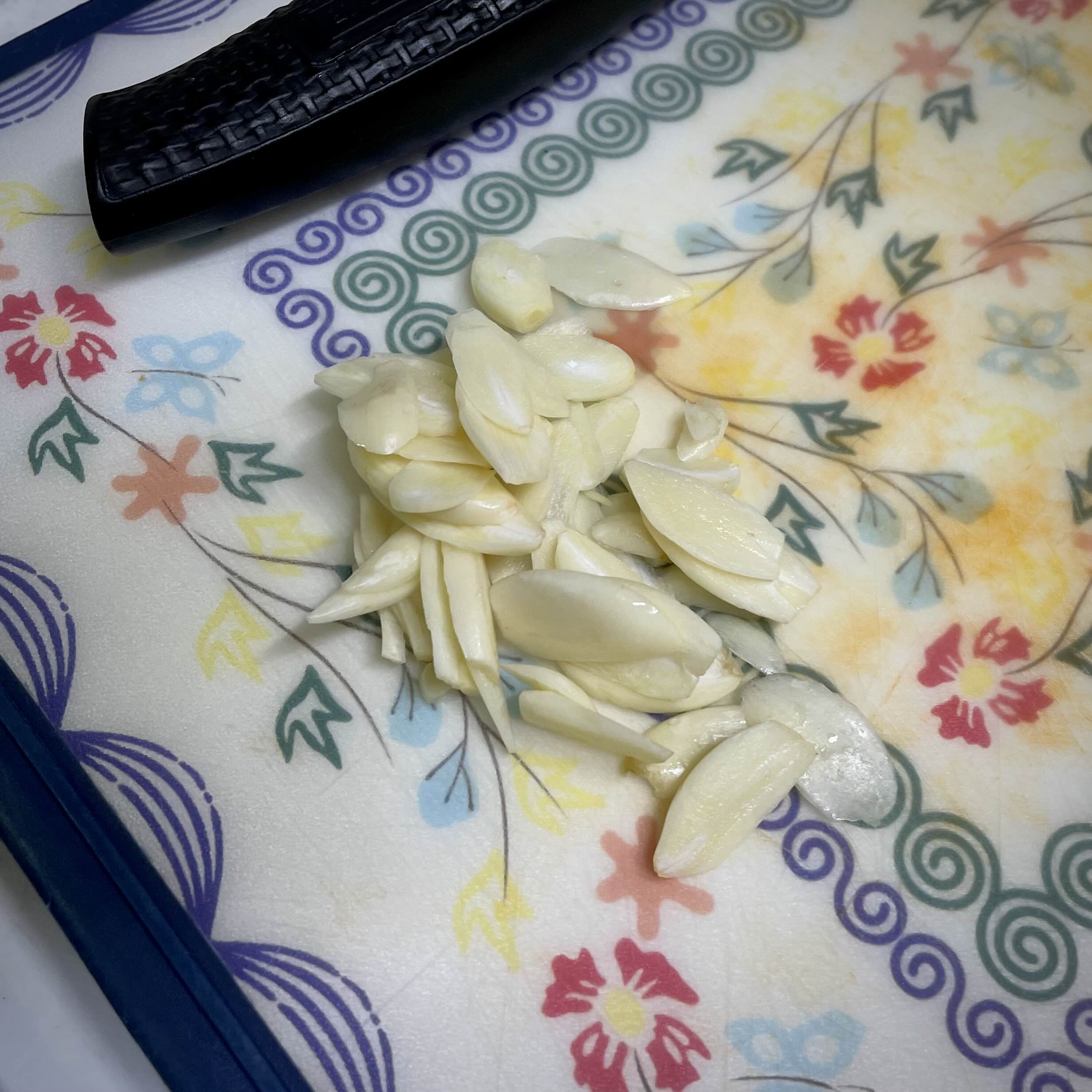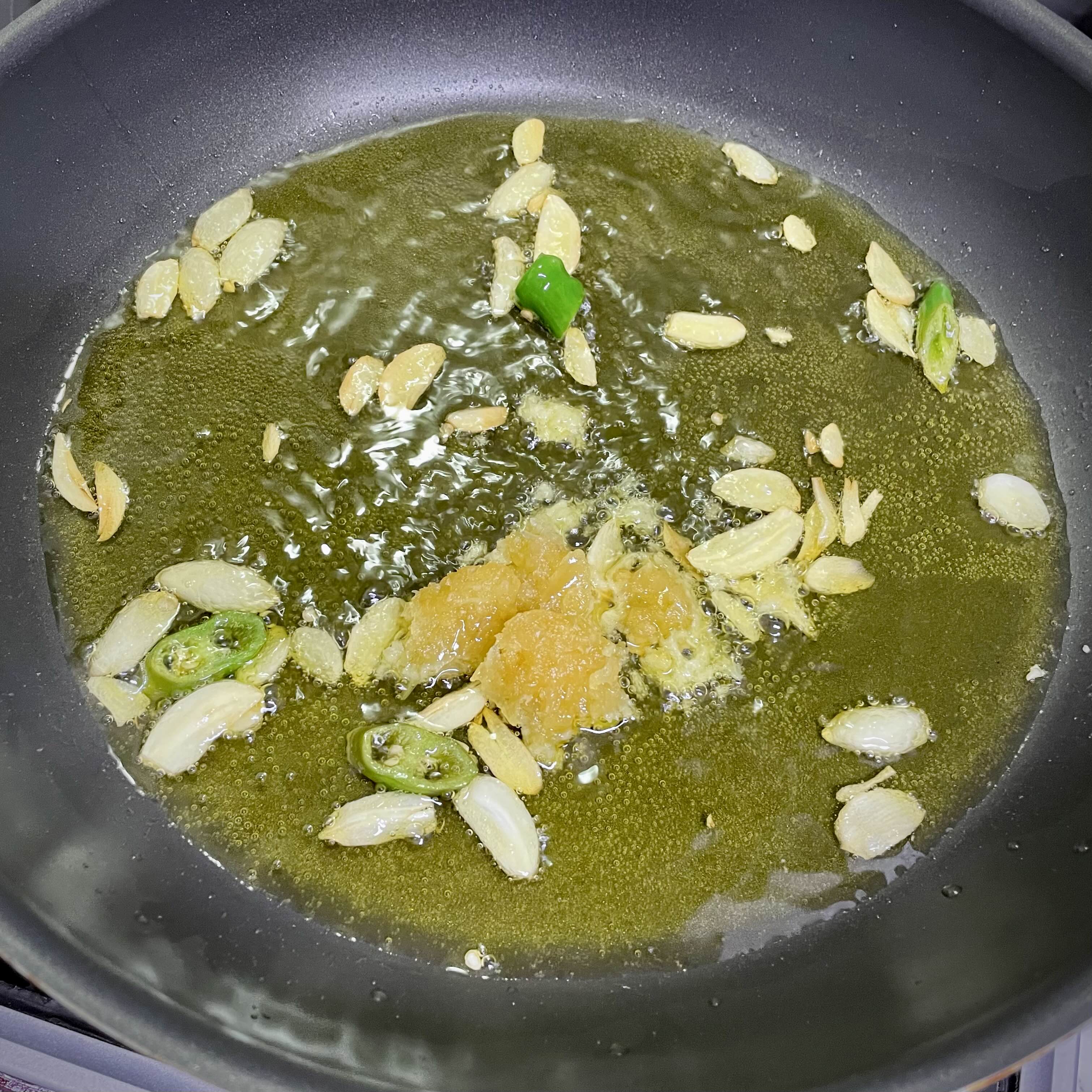 마늘 4개를 얇게 편으로 썰어서 팬에 넣고 살살 익혀 줍니다.