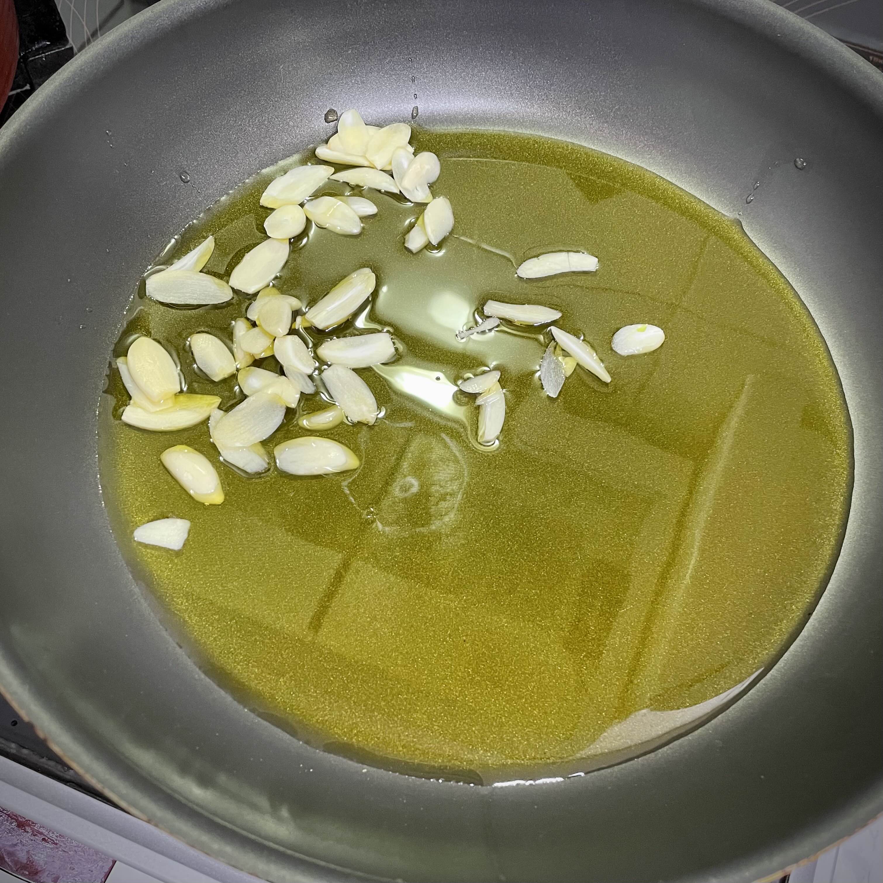 면이 삶아지는 동안 약불로 올리브오일(10)에 편마늘(6개) 넣어서 살살 볶다가