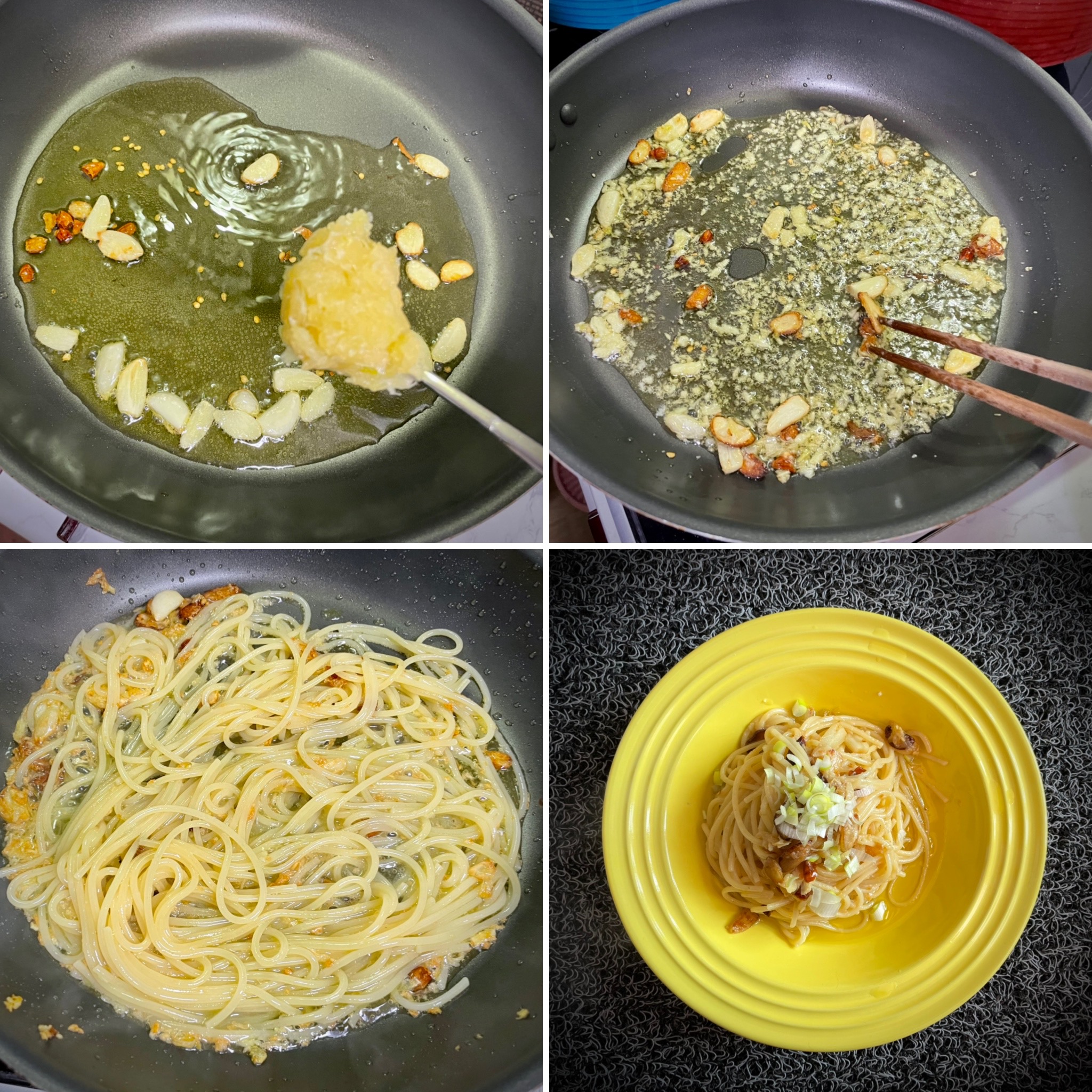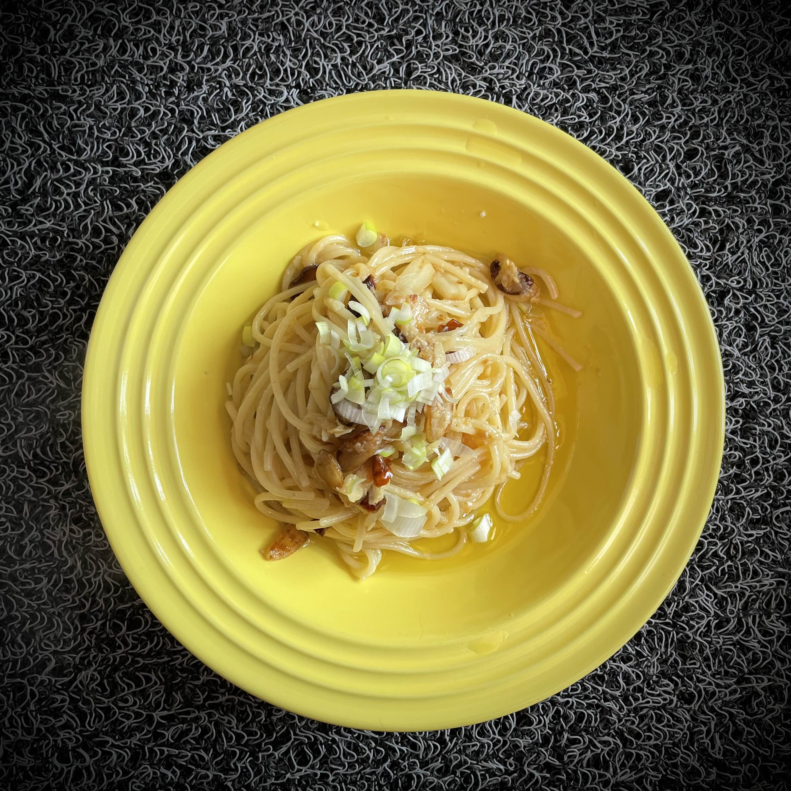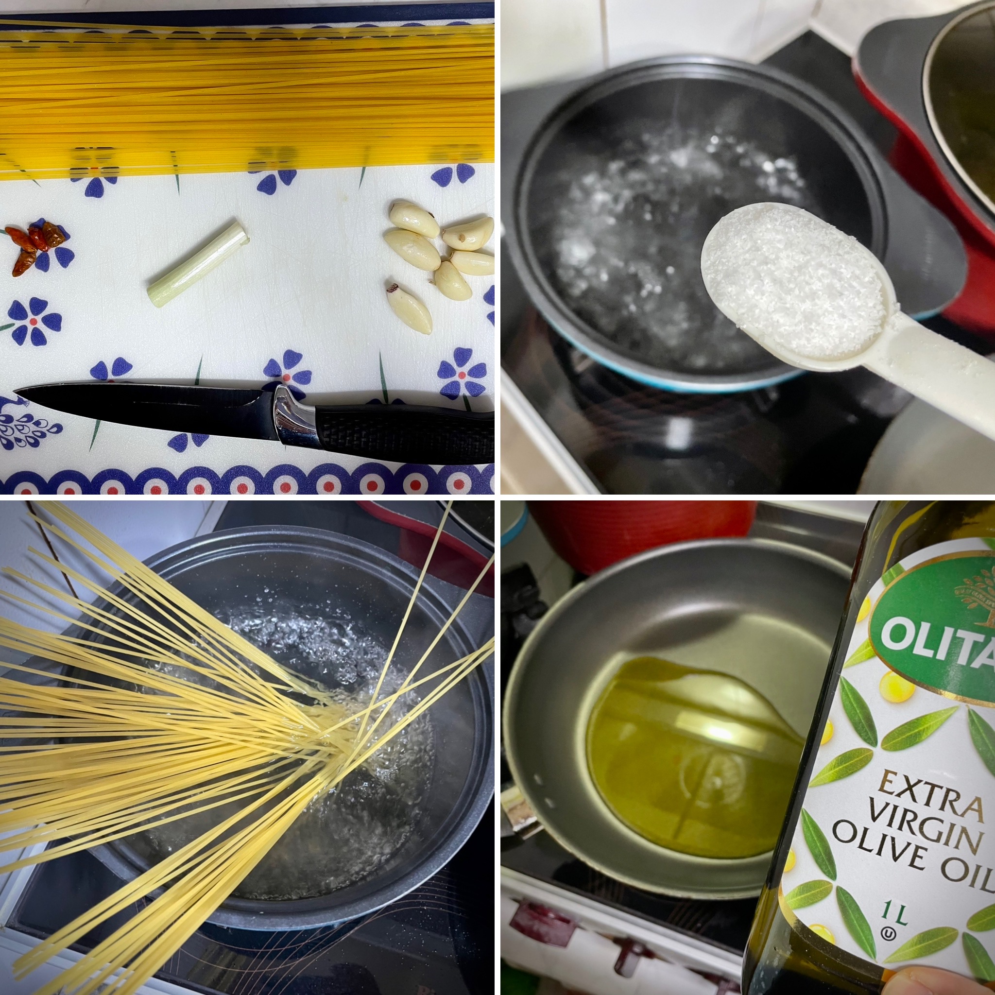 - 필수재료 : 스파게티면(1.5인분), 마늘(4개), 간마늘(2큰술), 페퍼론치노 or 청양고추(4개)