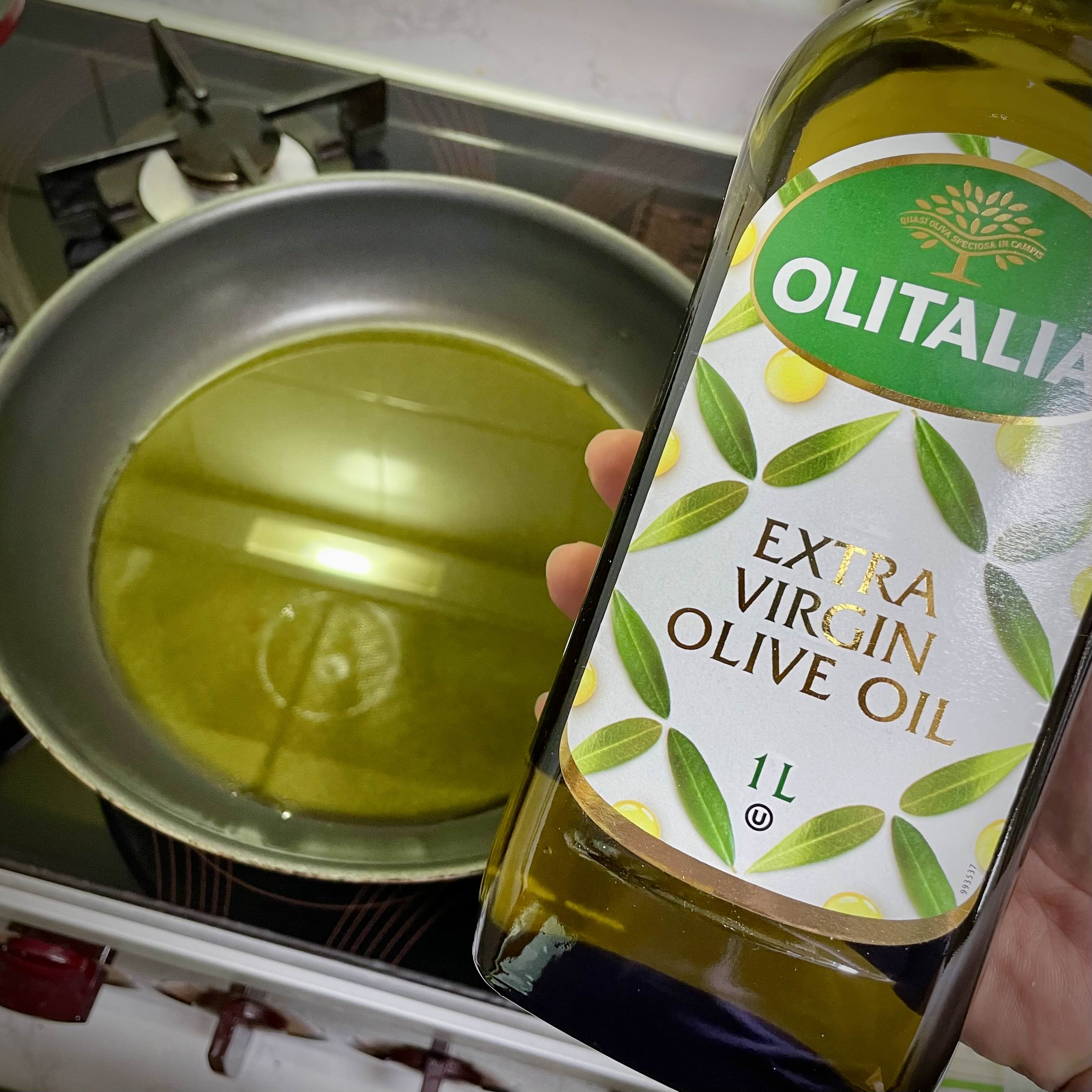 면이 삶아지는 동안 팬에 올리브오일을 약 15큰술 따르고 약불로 달궈줍니다.