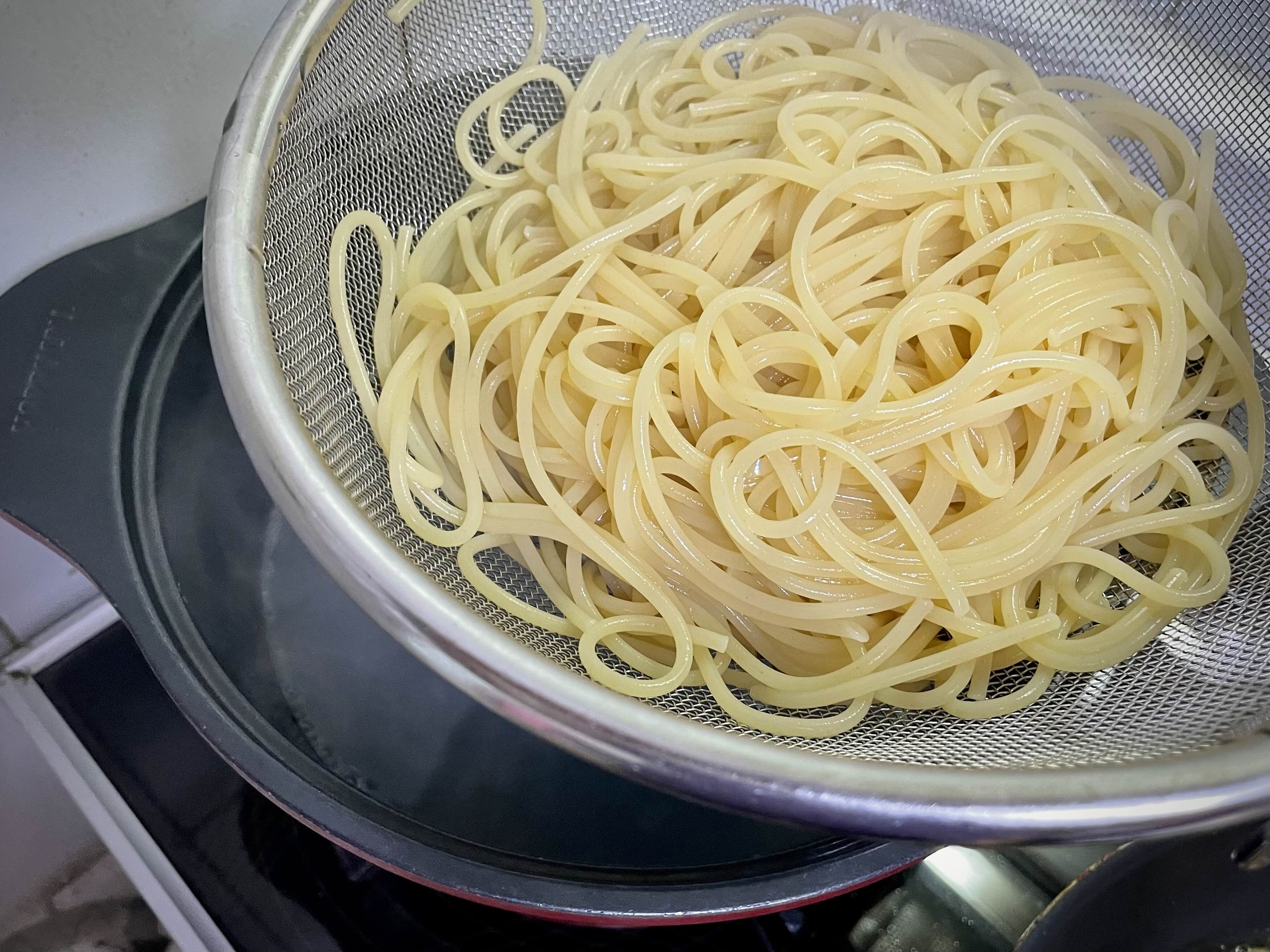 스파게티면은 한 가닥 먹어보시고 익었다면 건져서 물기가 있는 채로 팬에 넣어 줍니다.
