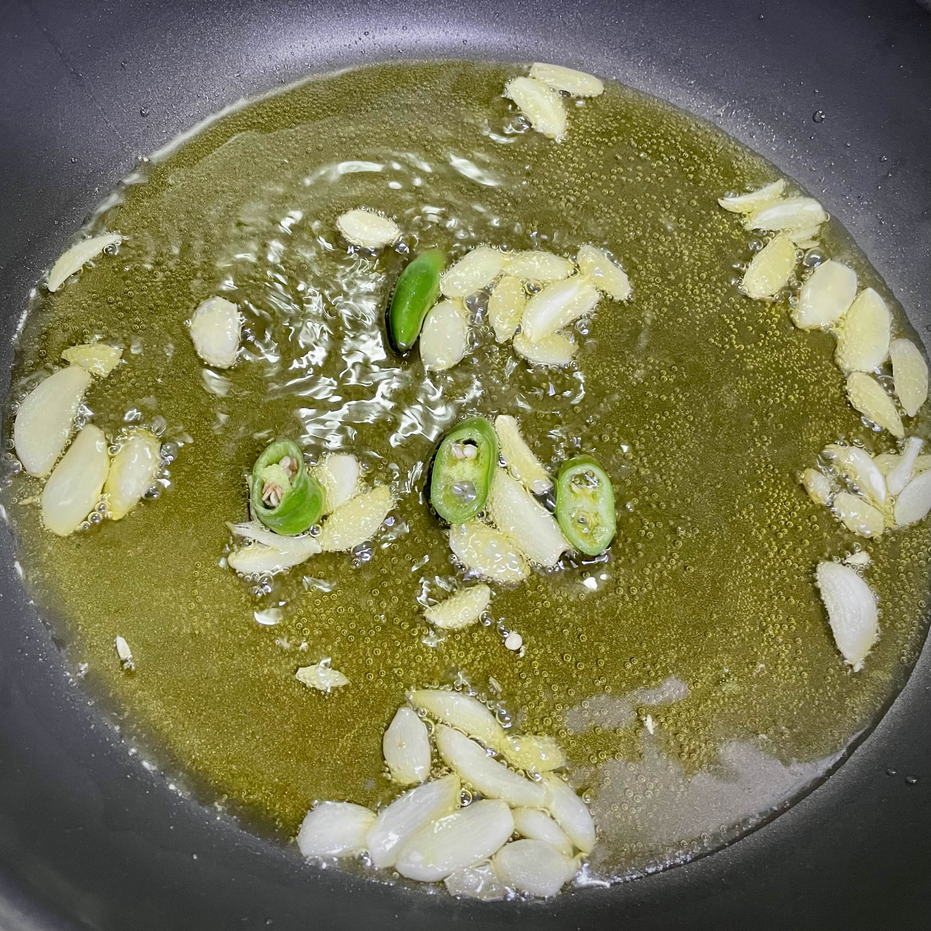 마늘향이 솔솔 나기 시작하면 페퍼론치노(4개) 반으로 분질러서 넣고,