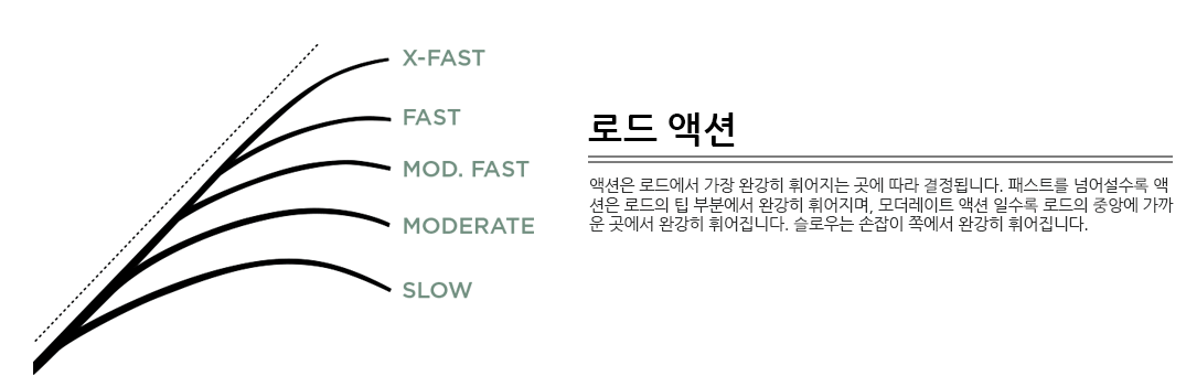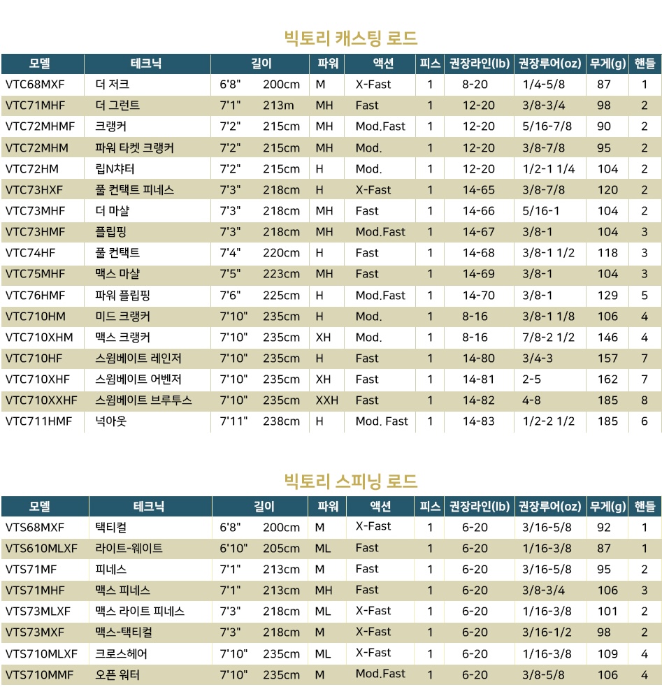 파워 기준 M~XXH 까지 17개의 베이트 로드와 ML~MH까지 8개의 스피닝 로드