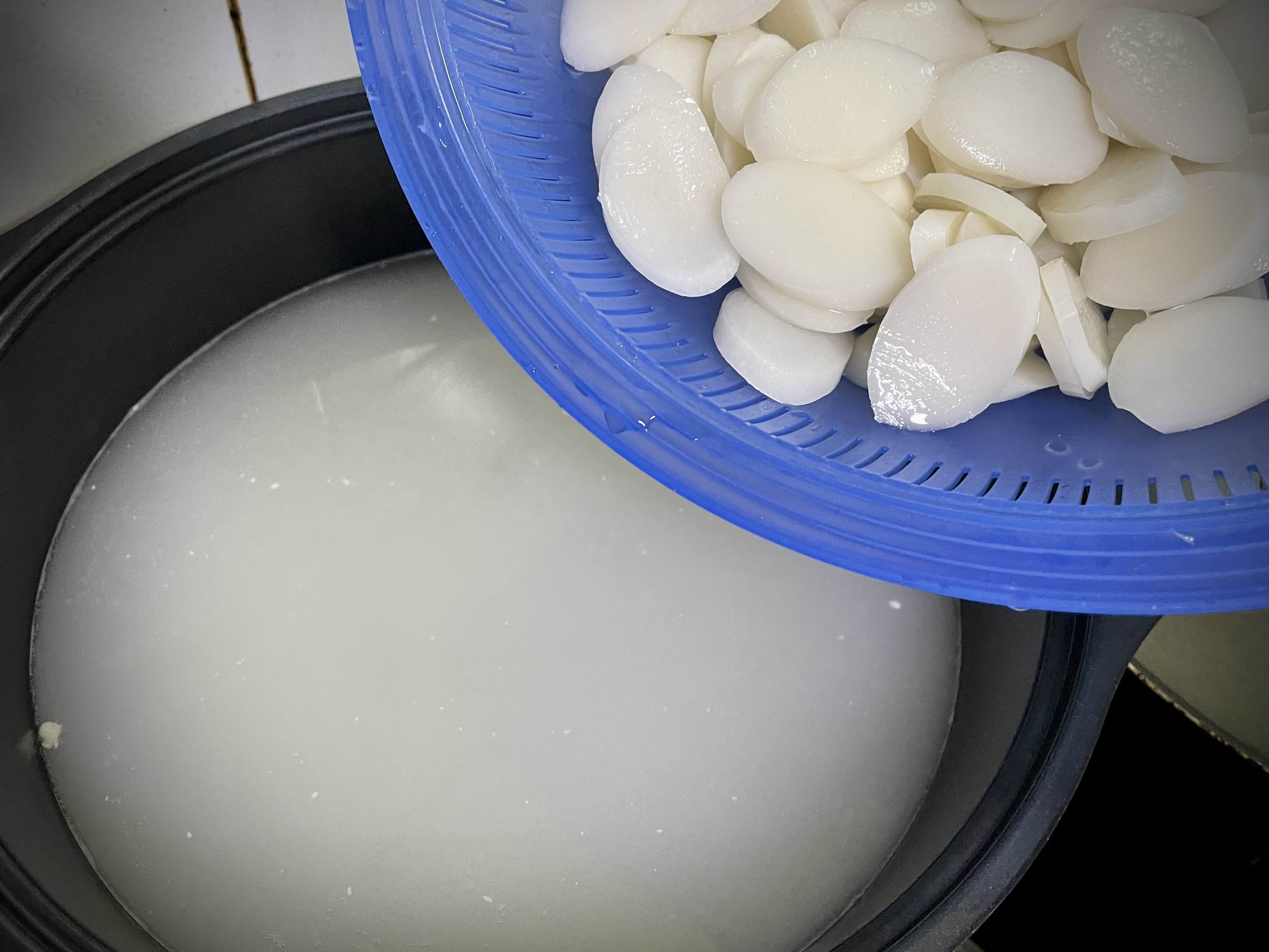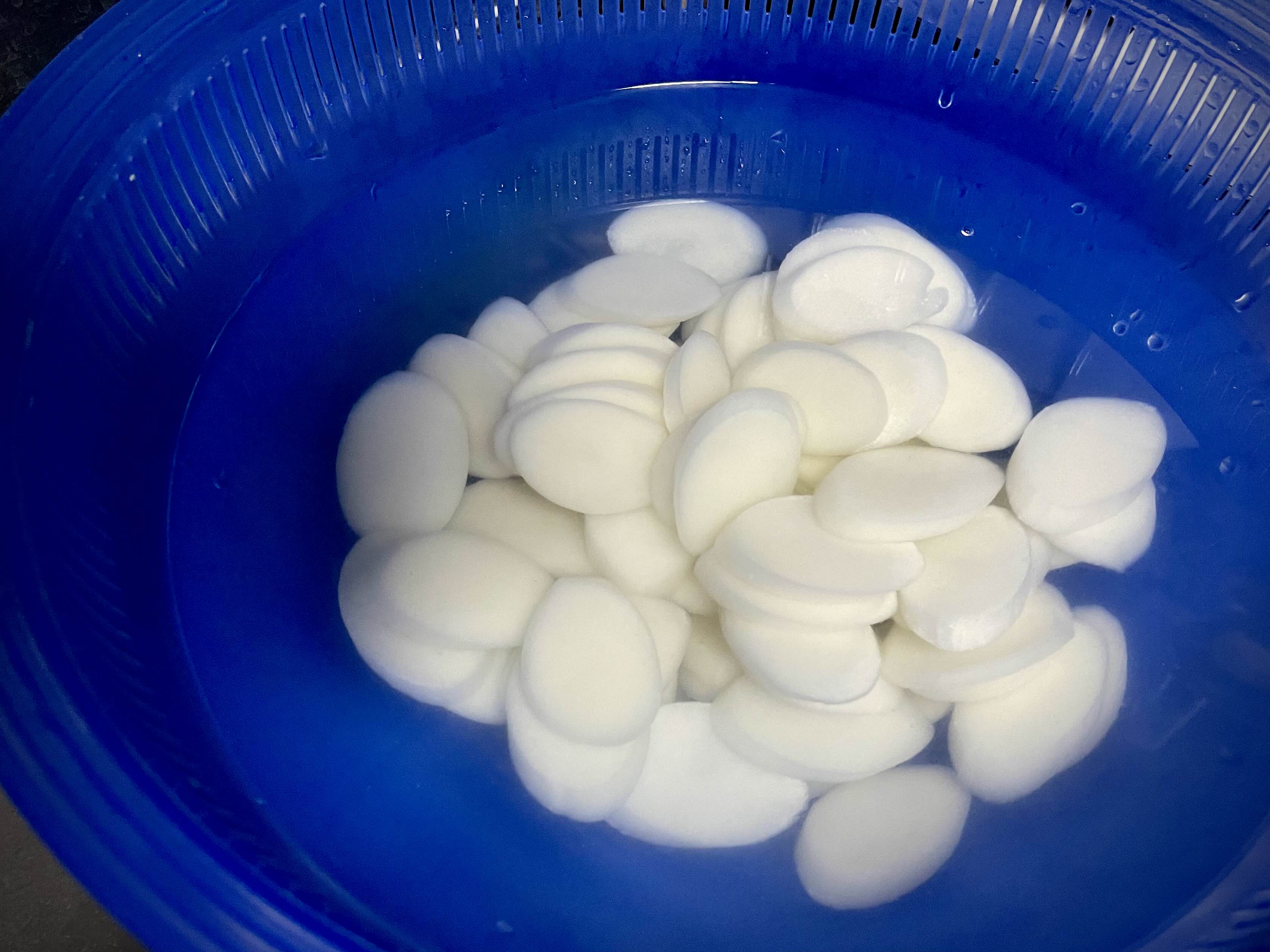 떡국떡은 흐르는 물에 살짝 씻어서 물에 불려두세요.