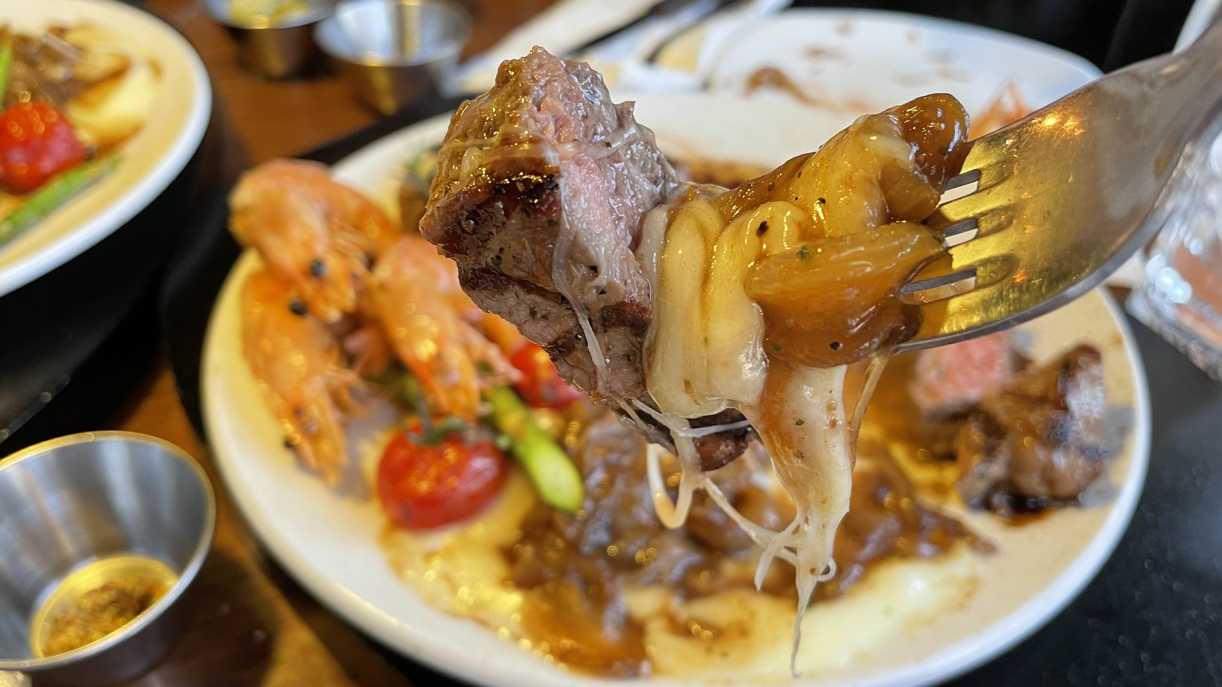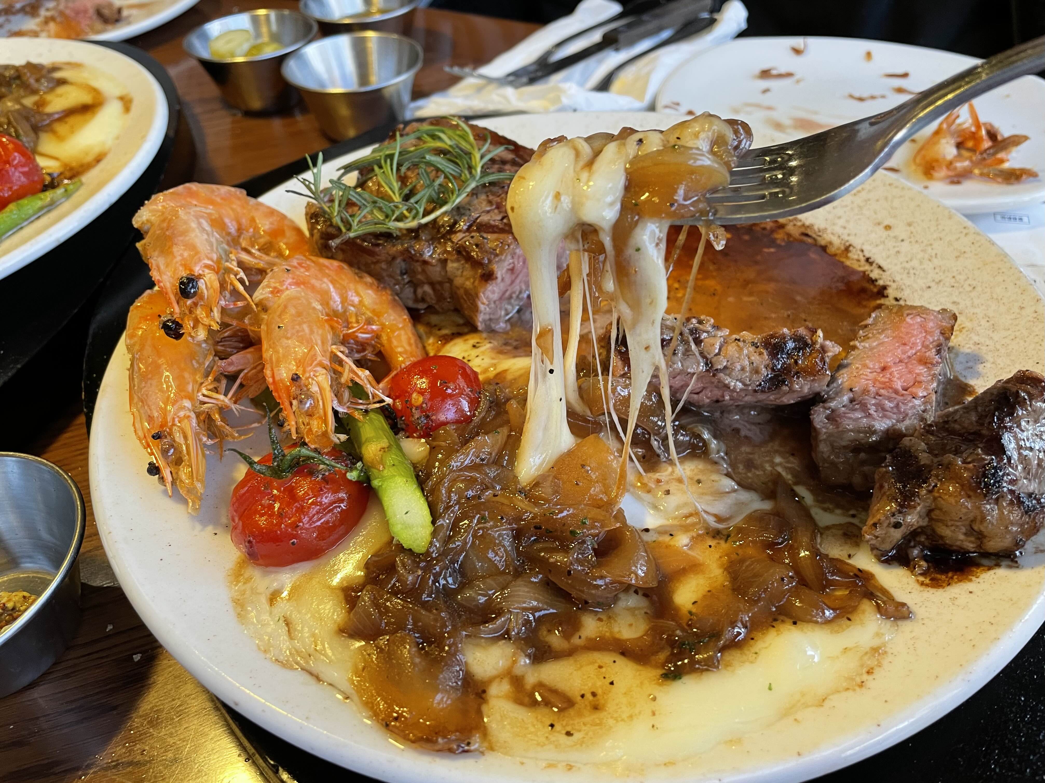 채끝등심 스테이크에는 새우 3마리와 방토2개, 아스파라거스2가닥, 그리고 치즈와 양파를 조리해서 함께 나옵니다.