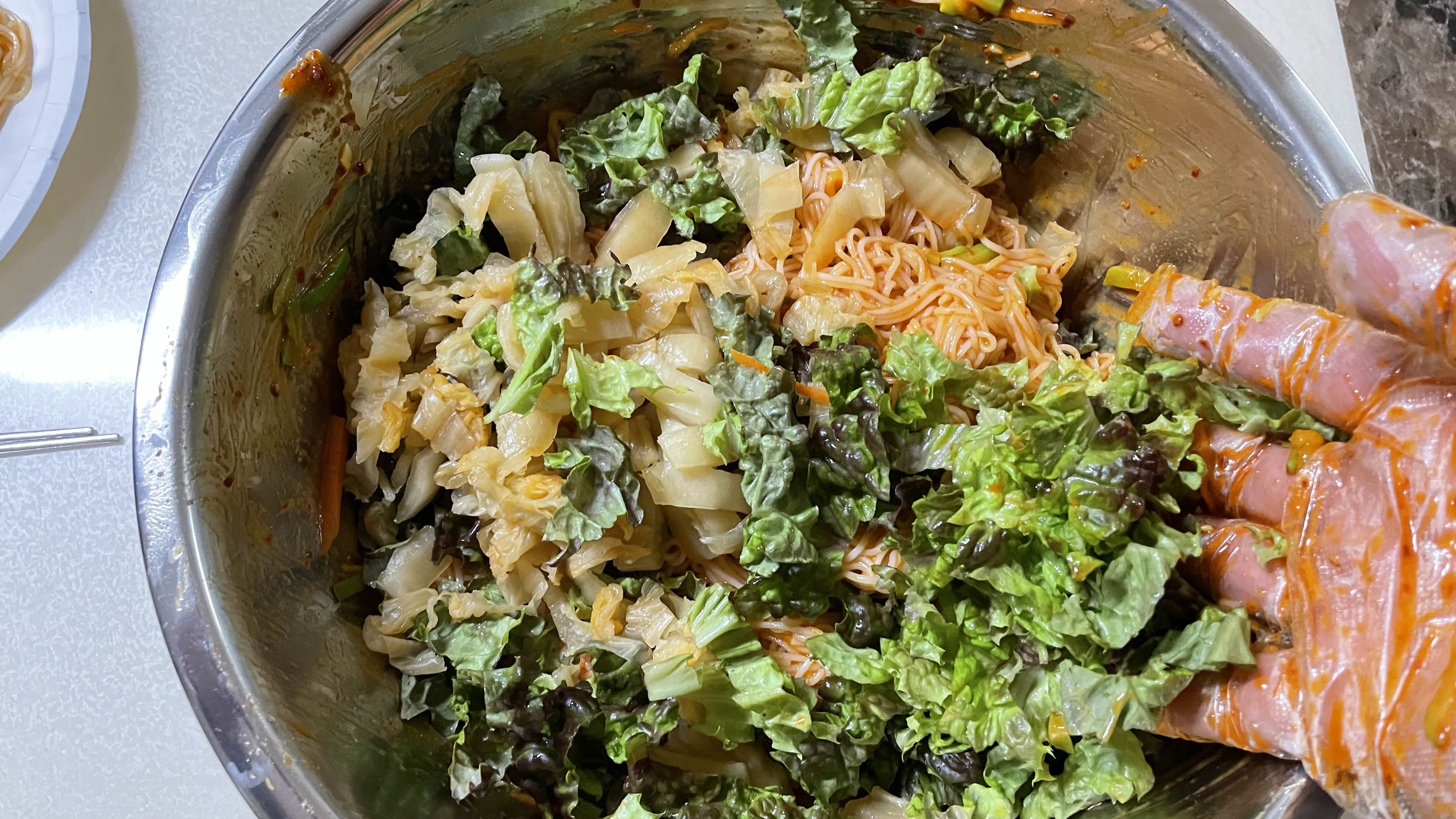 어느 정도 비벼지면 준비해 둔 씻은 김치와 상추 넣고 마저 비벼줍니다.