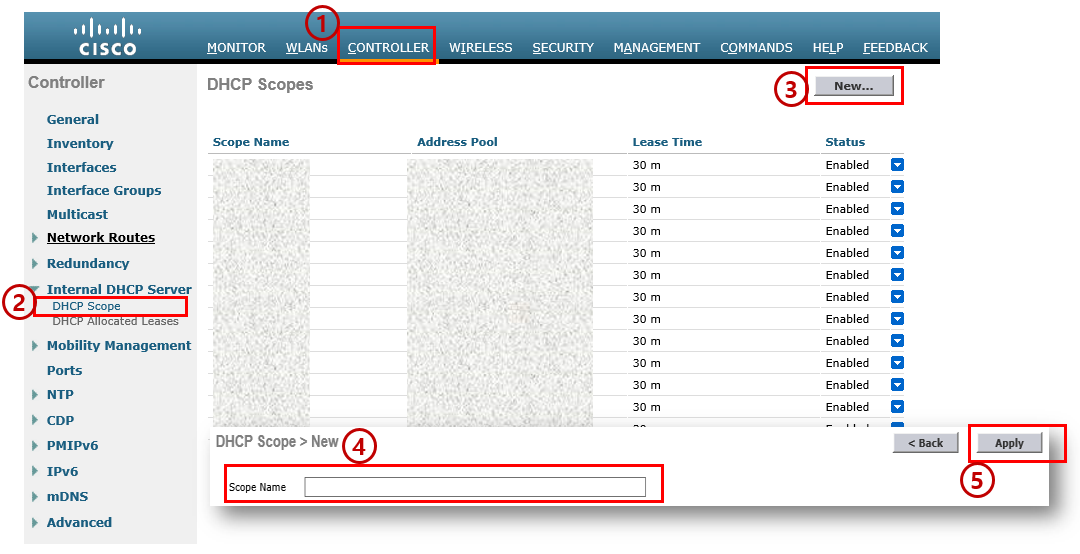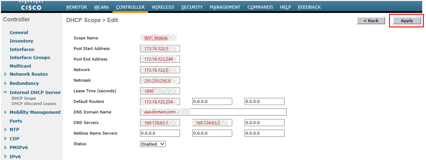 CONTROLLER > Internal DHCP Server > DHCP Scope