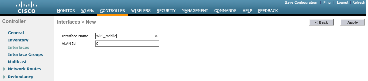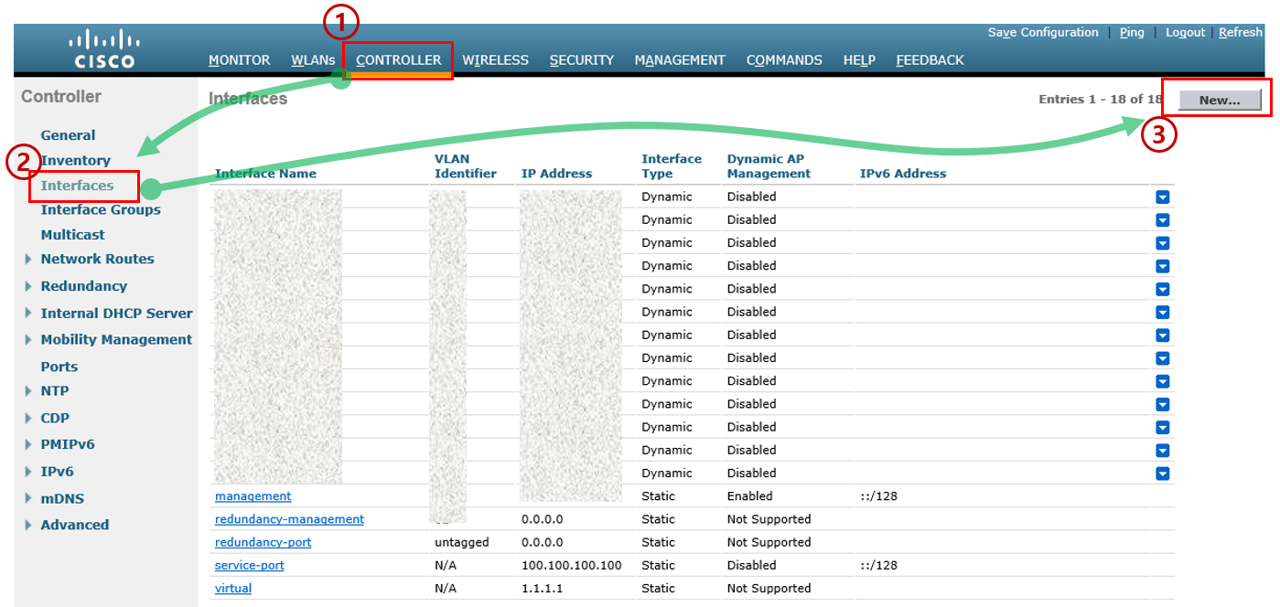 먼저 WLC 상단 CONTROLLER 탭으로 이동하여 interface 를 생성해 줍니다.