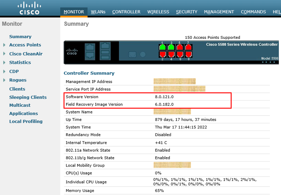 사용 중인 무선랜컨트롤러 모델은 WLC5508 이며, SW Ver. 8.0.121.0 이고, Field Recovery Ver. 6.0.182.0 을 사용 중입니다.