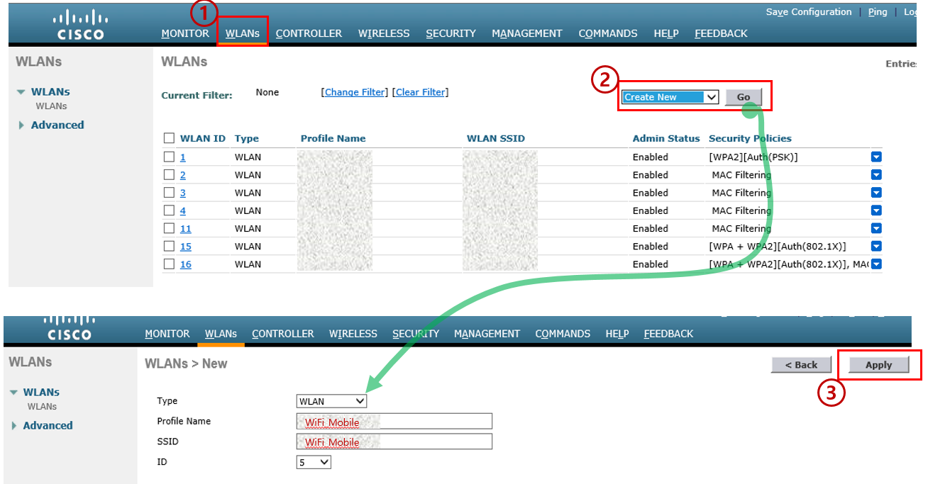 WLC의 설정 방식을 보면 New 버튼을 만들어서 모든 설정을 다 한 다음 Apply 하는 게 아니고,