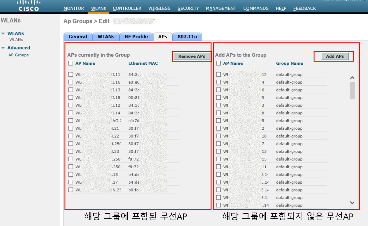 AP Groups 의 APs 탭에서는 해당 그룹에 소속시킬 무선 AP를 지정할 수 있습니다.