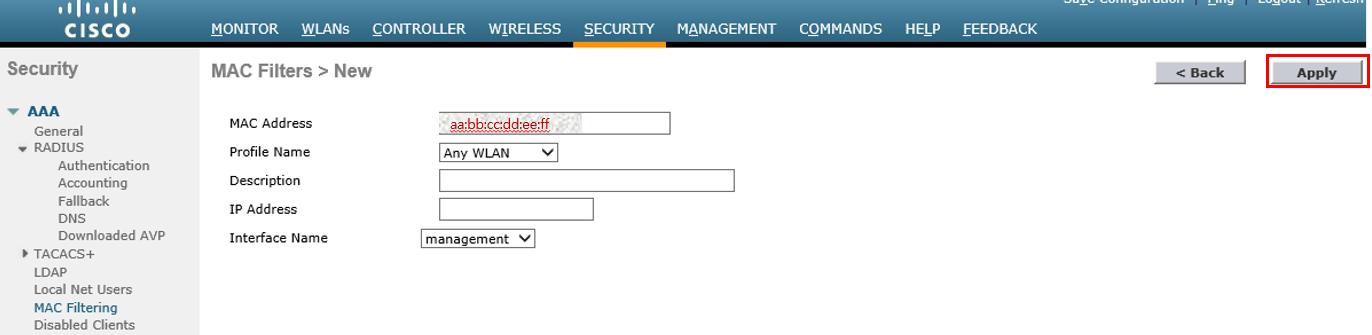 Interface Name 역시 특정 Interface 에만 사용하도록 지정하거나 management로 설정해서 모든 MAC Filtering 이 적용된 SSID에서 인증이 되도록 설정 가능합니다.