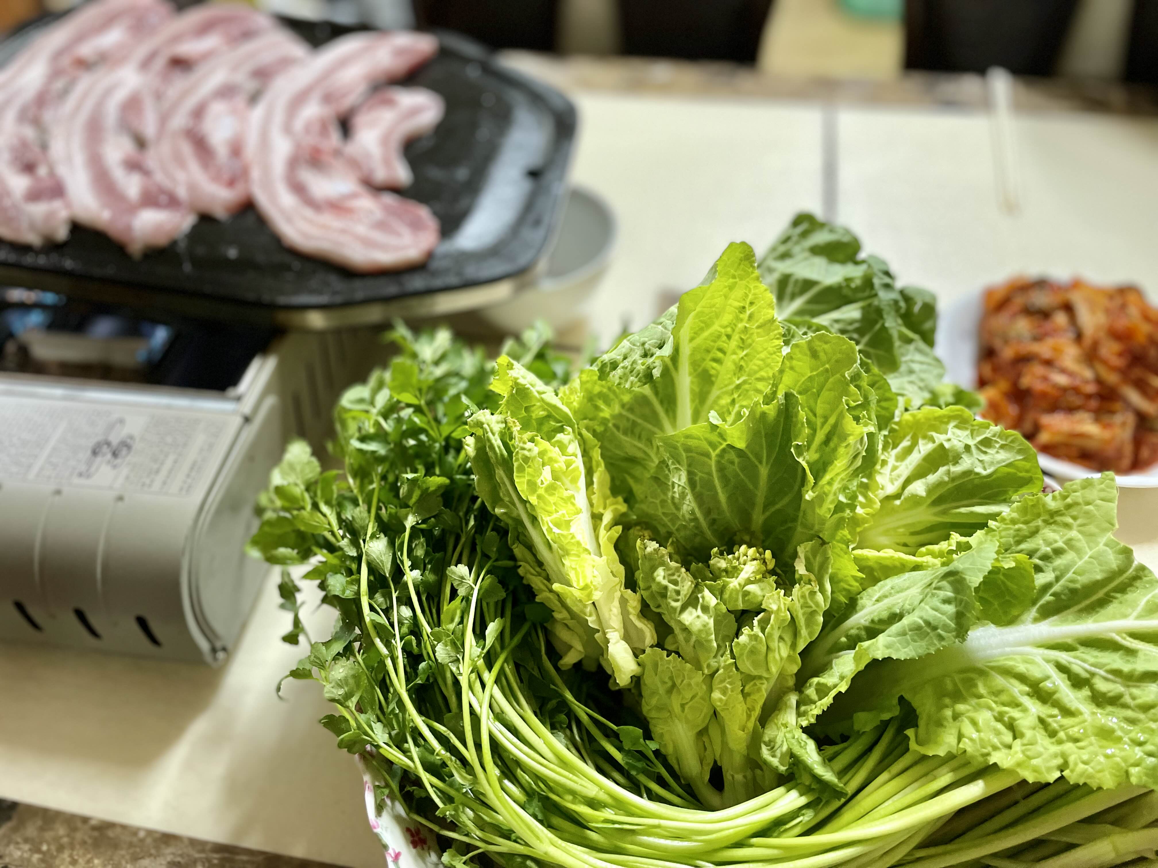 장모님께서 주신 봄동과 청정 한재 미나리가 주인공이고 삼겹살은 조연입니다.
