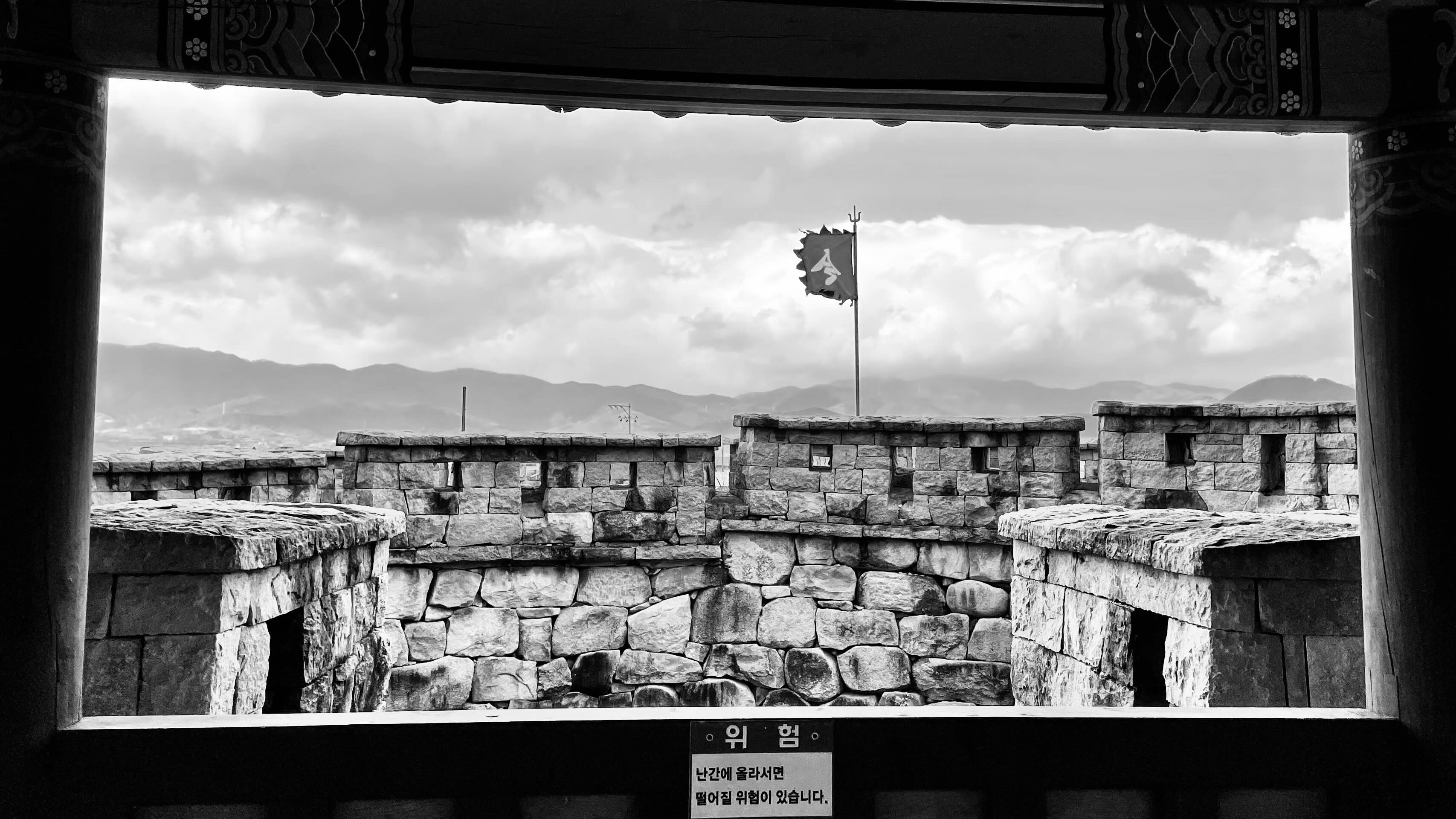 북문루 2층 의자에 앉아 정면을 바라보니 옹성의 모습과 멀리 산능선이 마치 한폭의 그림같습니다.