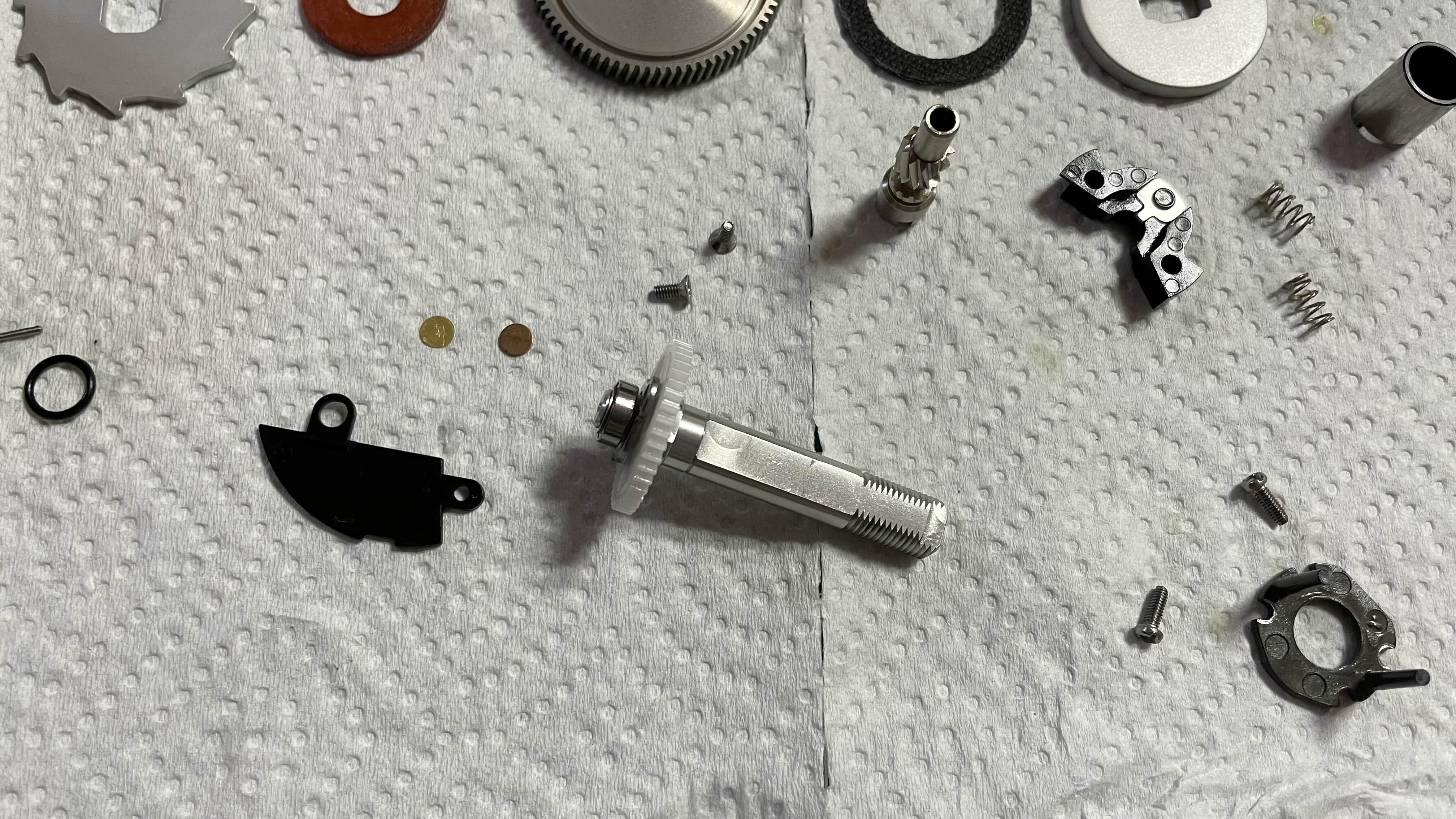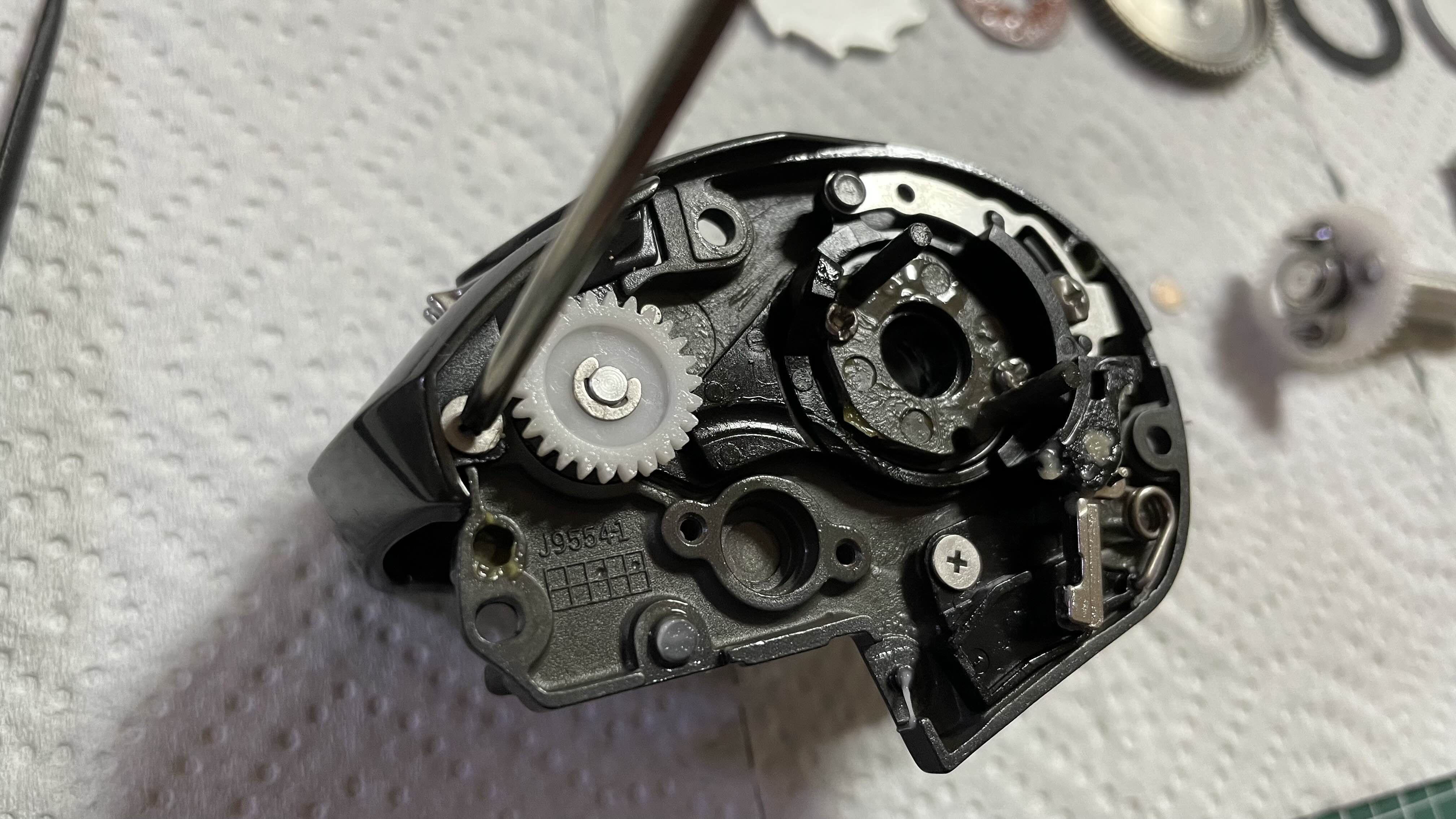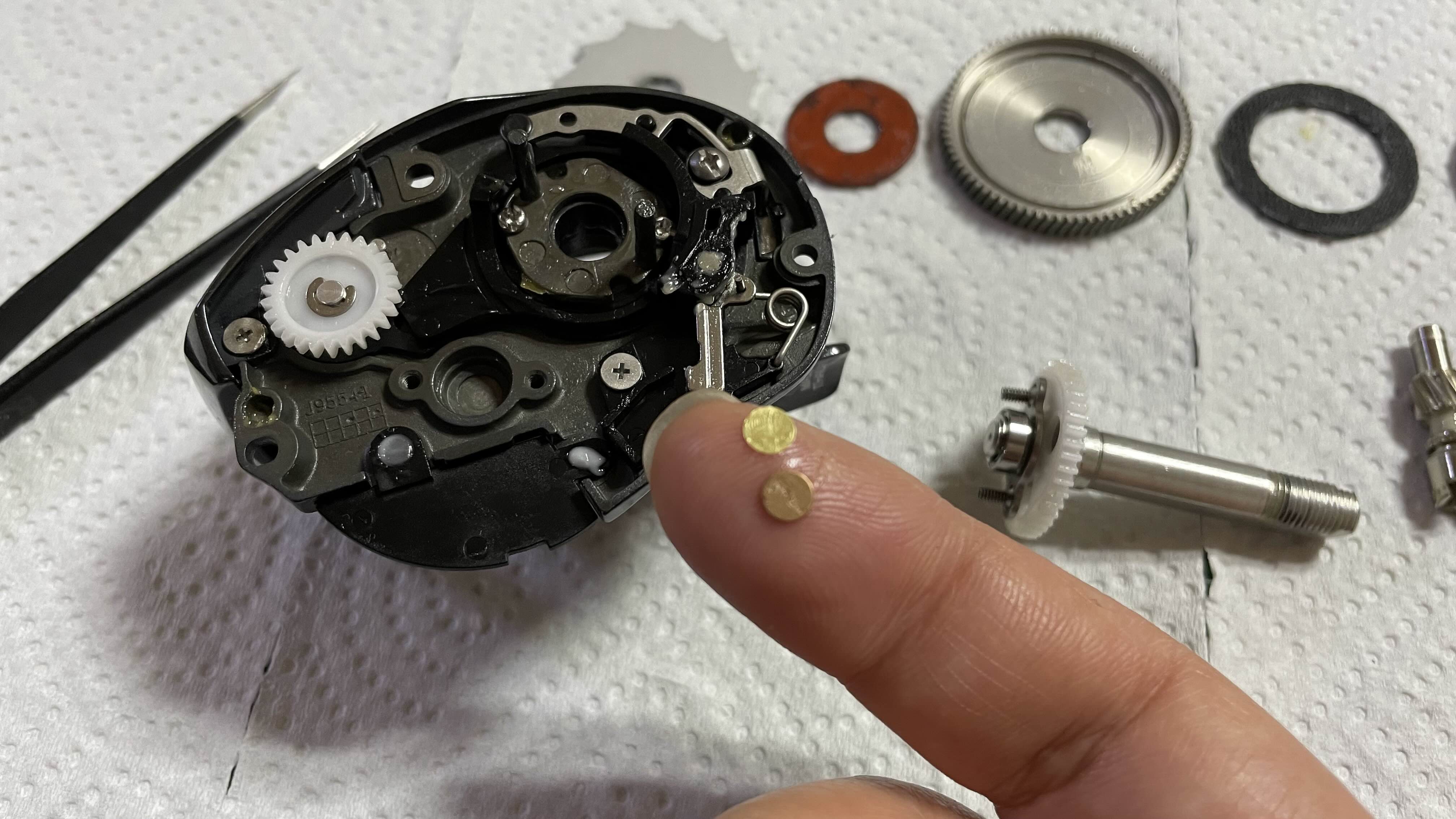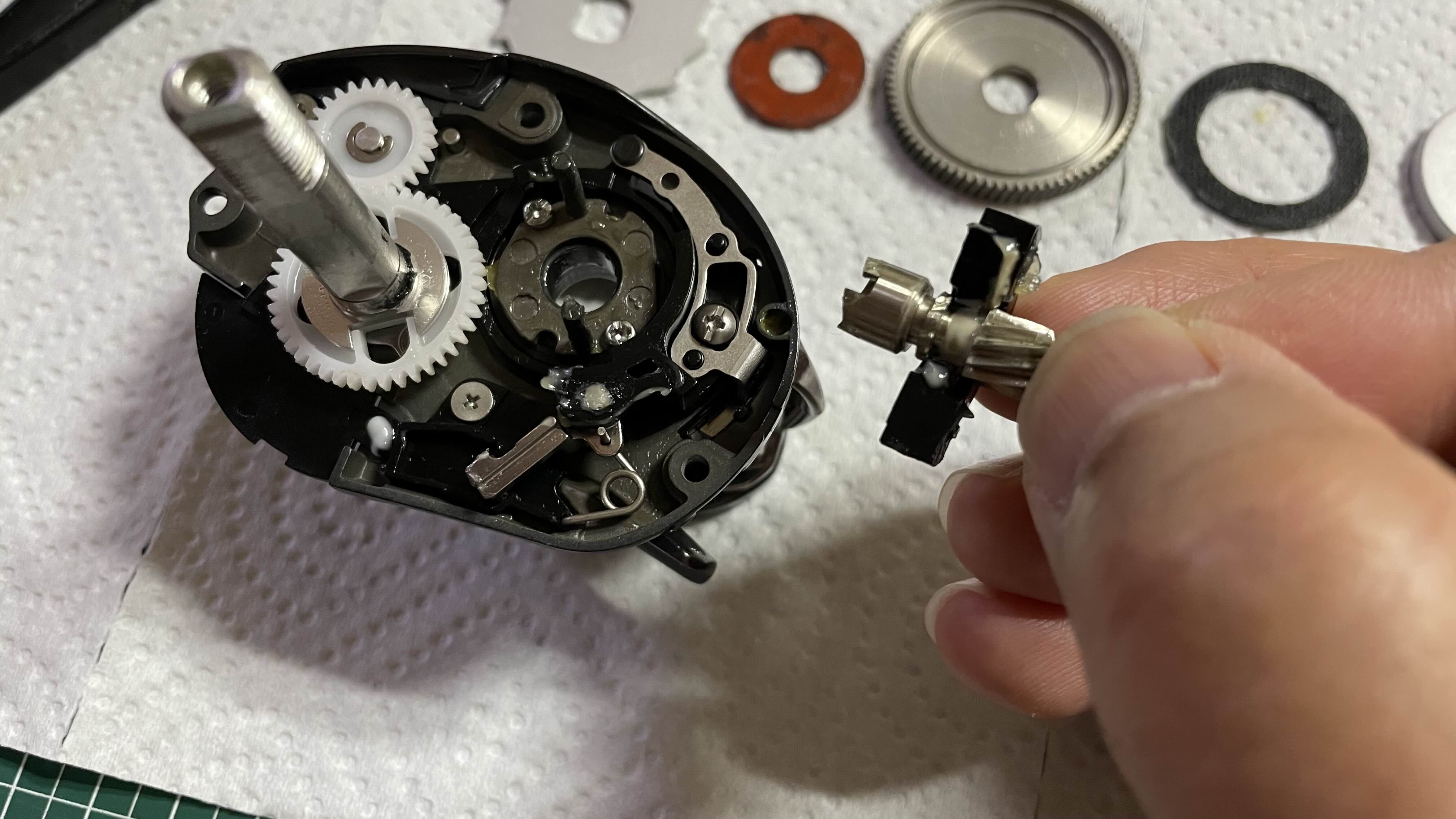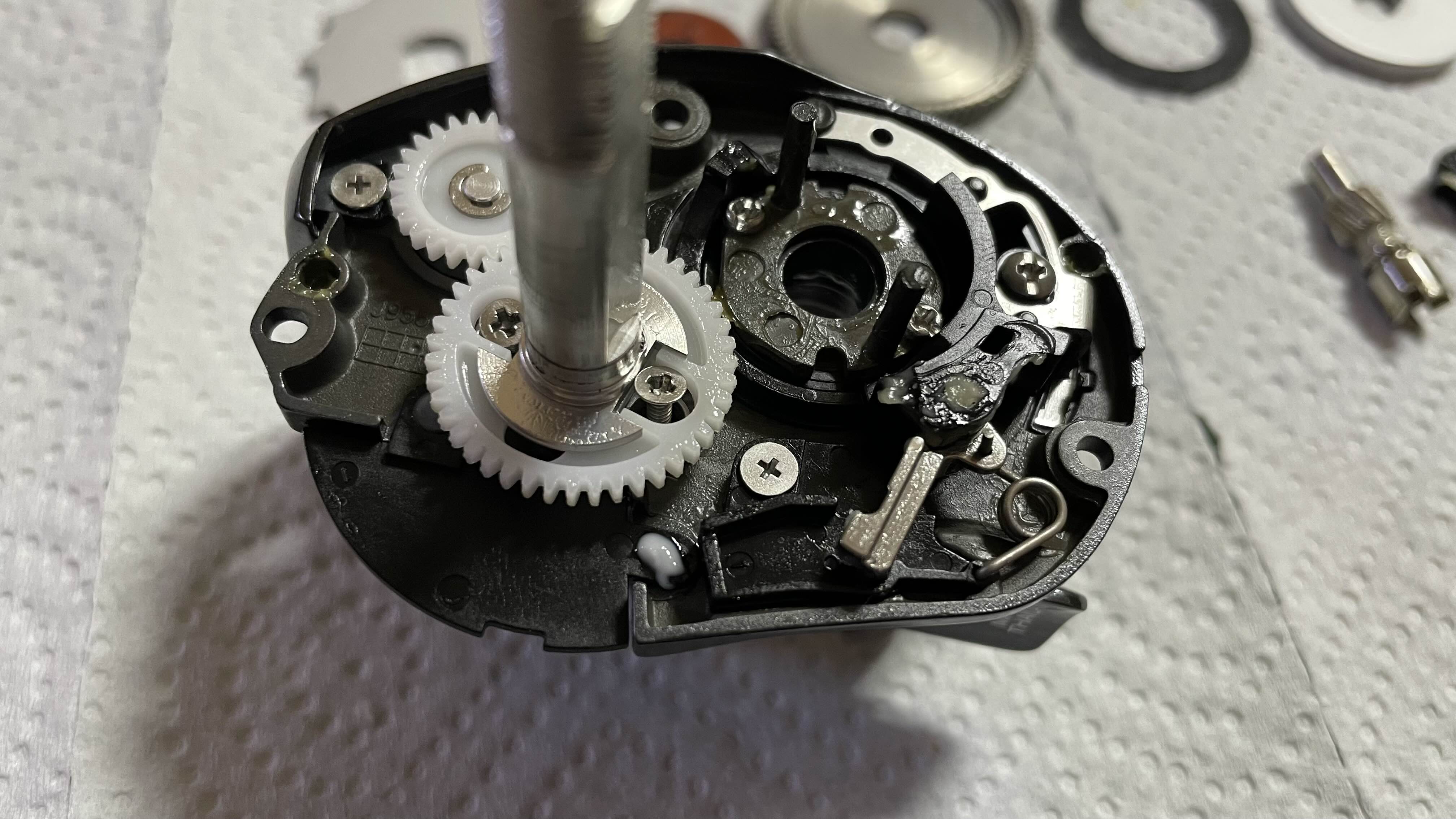 스풀 축이 들어가서 돌아가도록 해주는 피니언 기어는 위에 작은 스프링 두개를 빼고,
