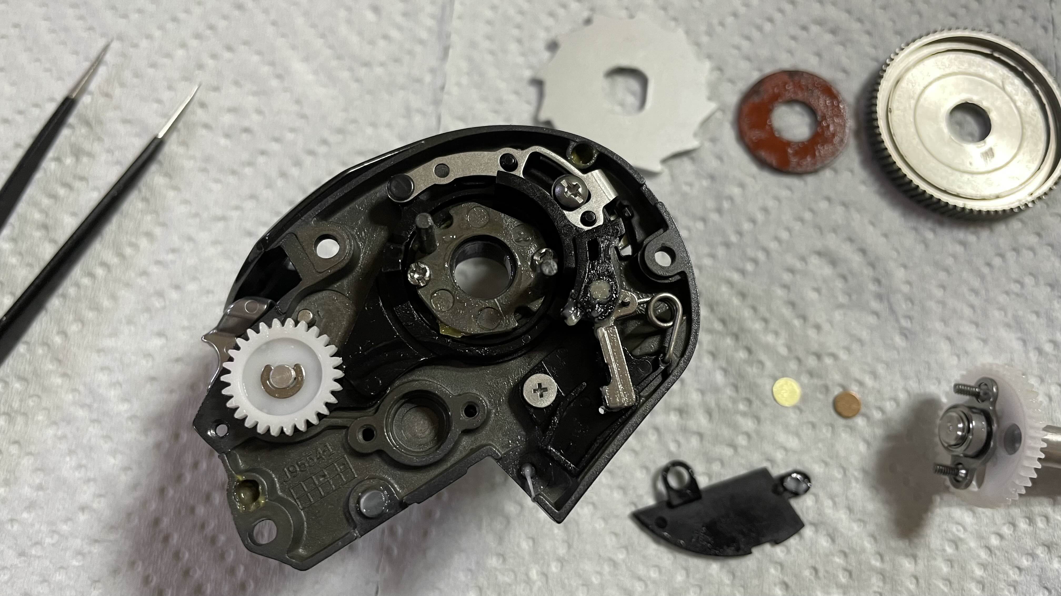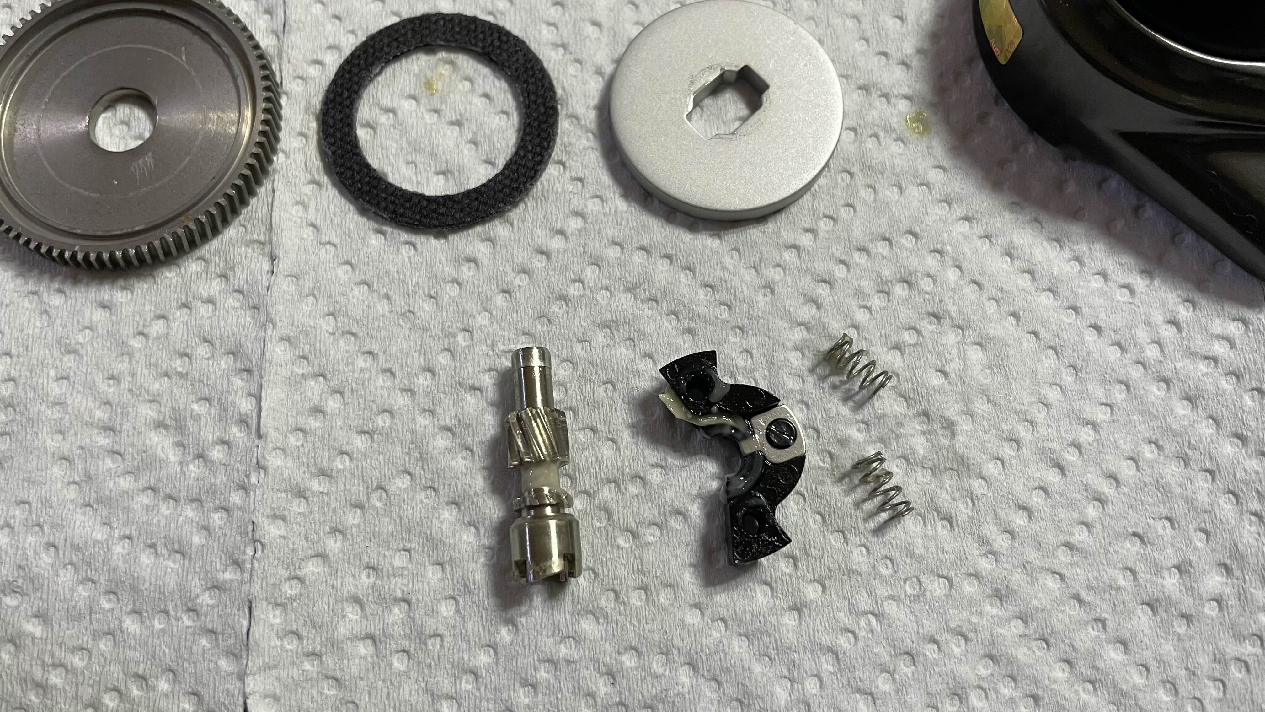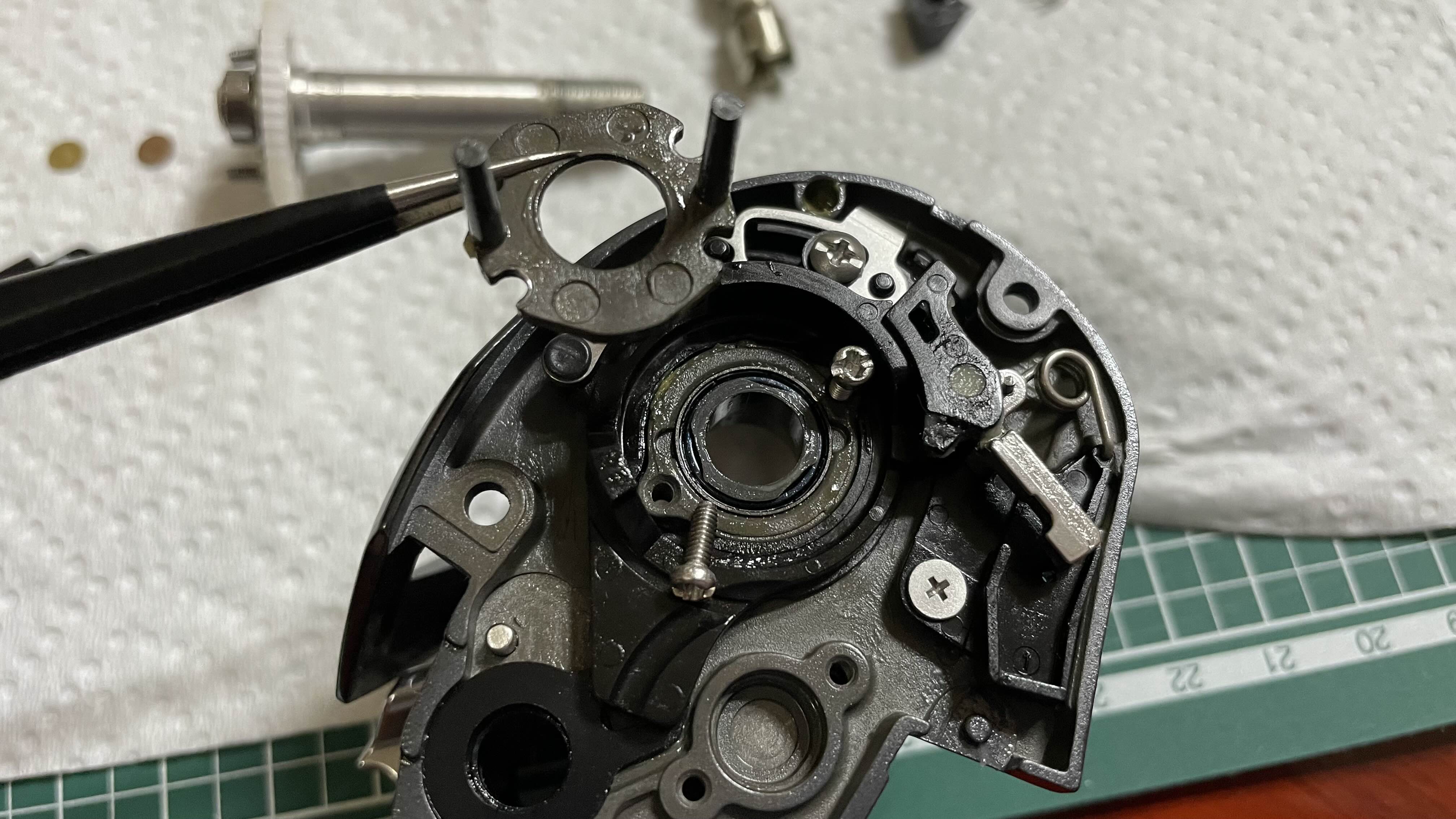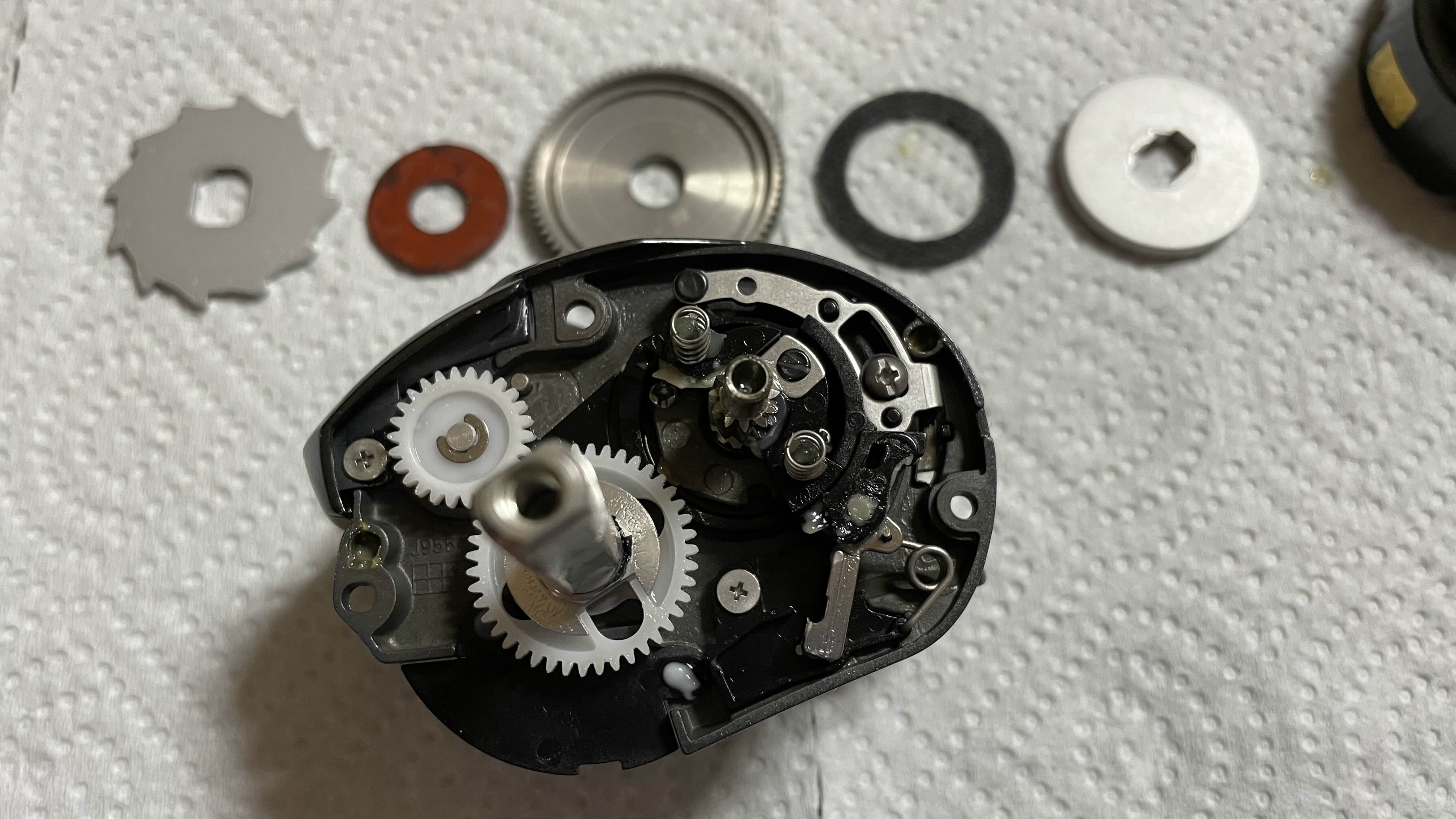 스풀 축이 들어가서 돌아가도록 해주는 피니언 기어는 위에 작은 스프링 두개를 빼고,