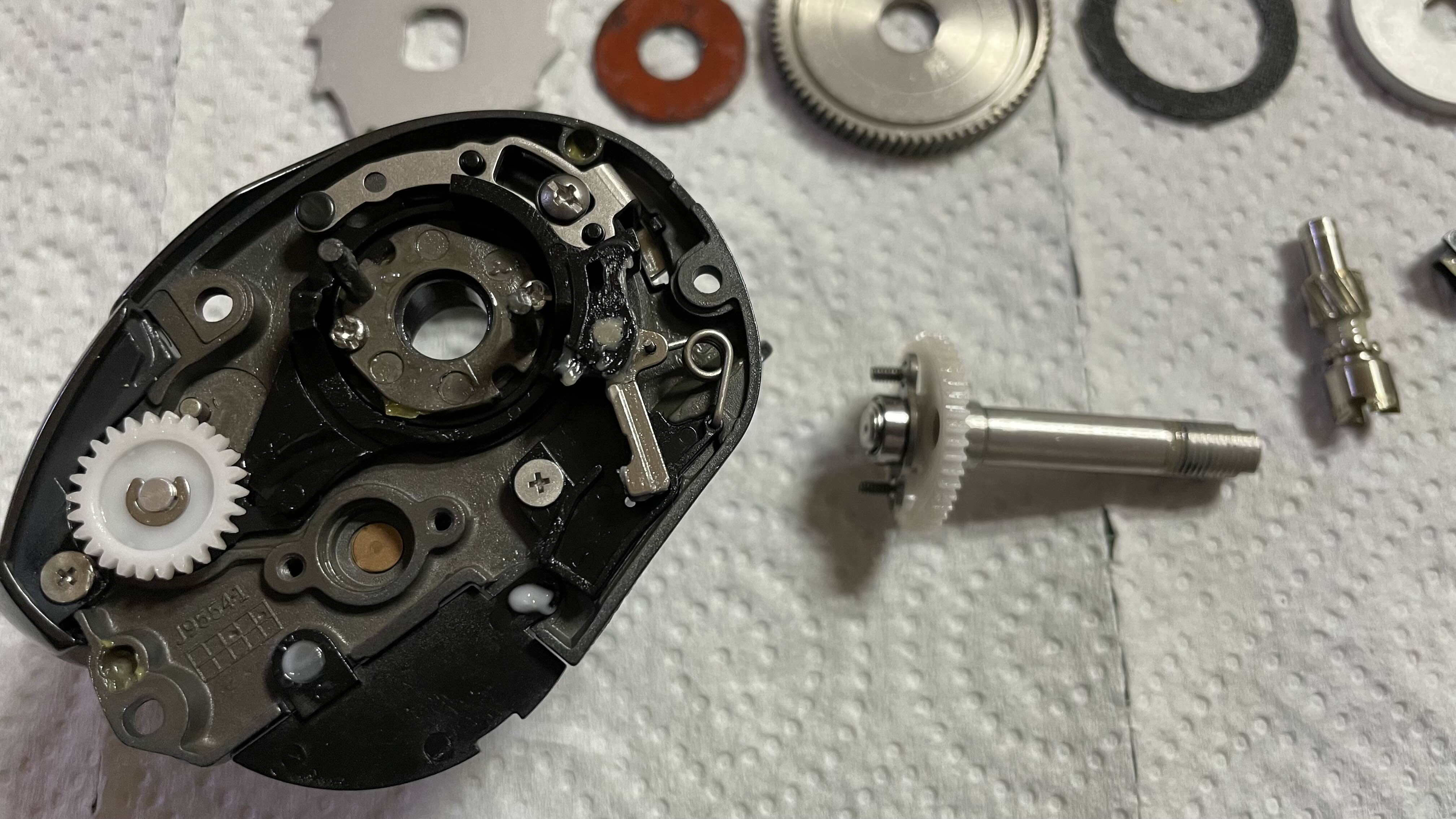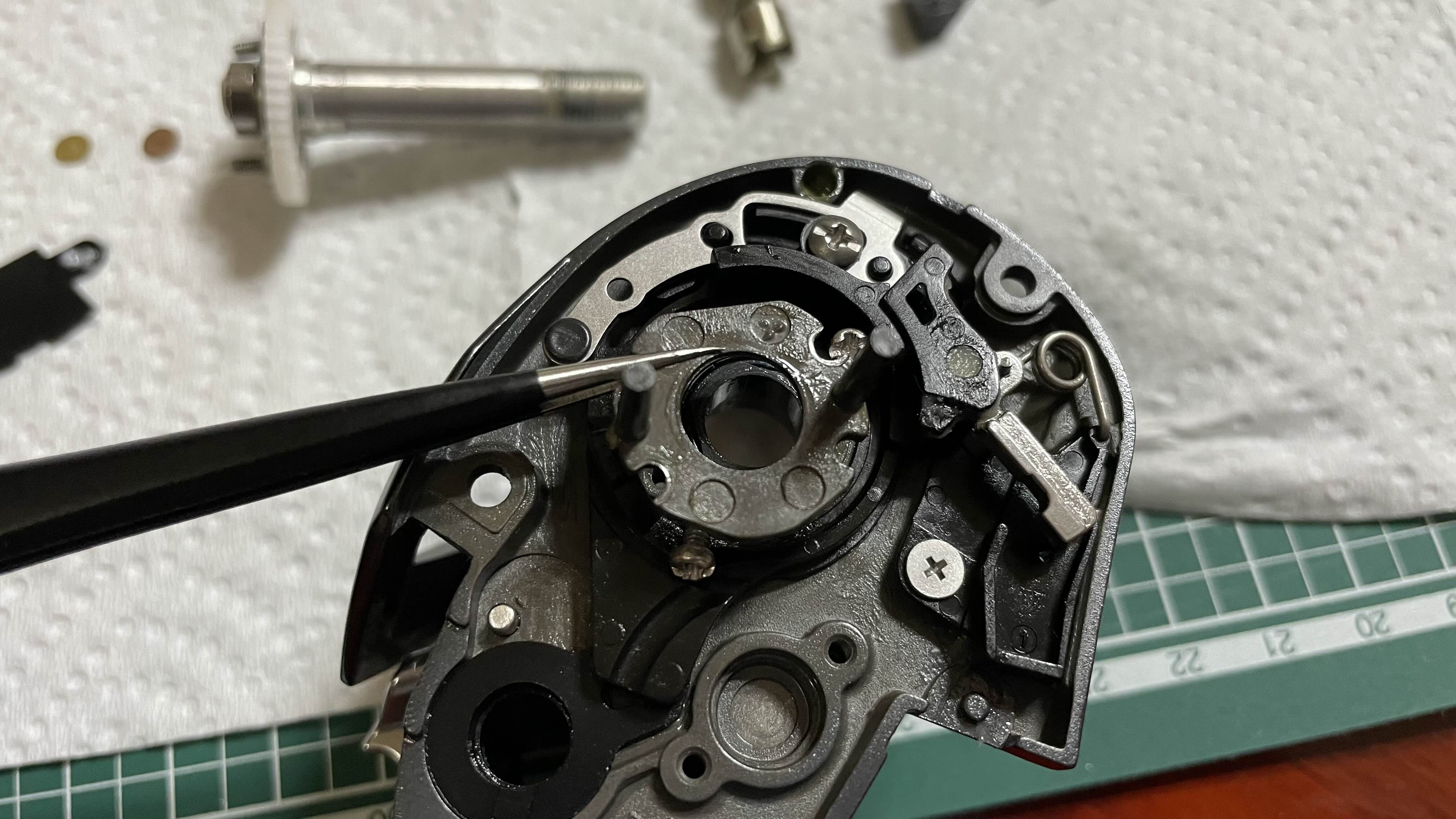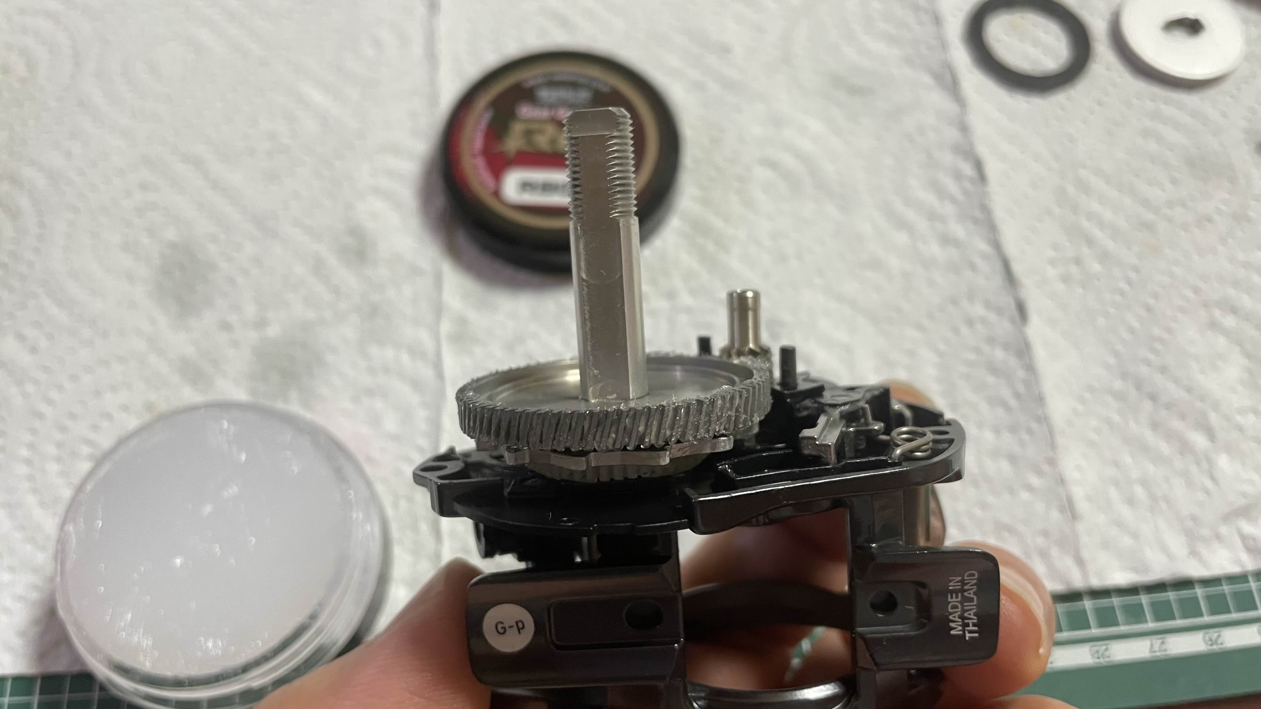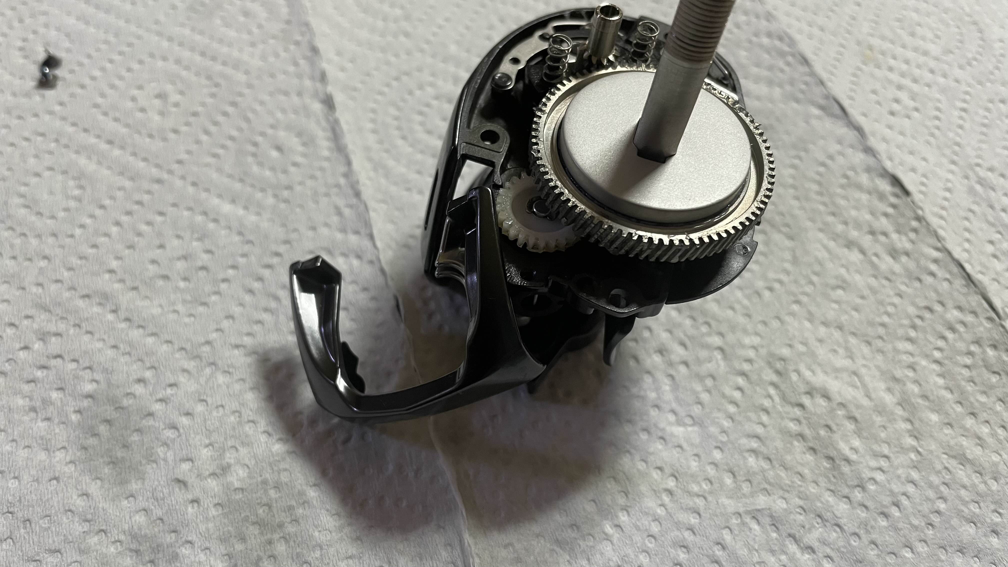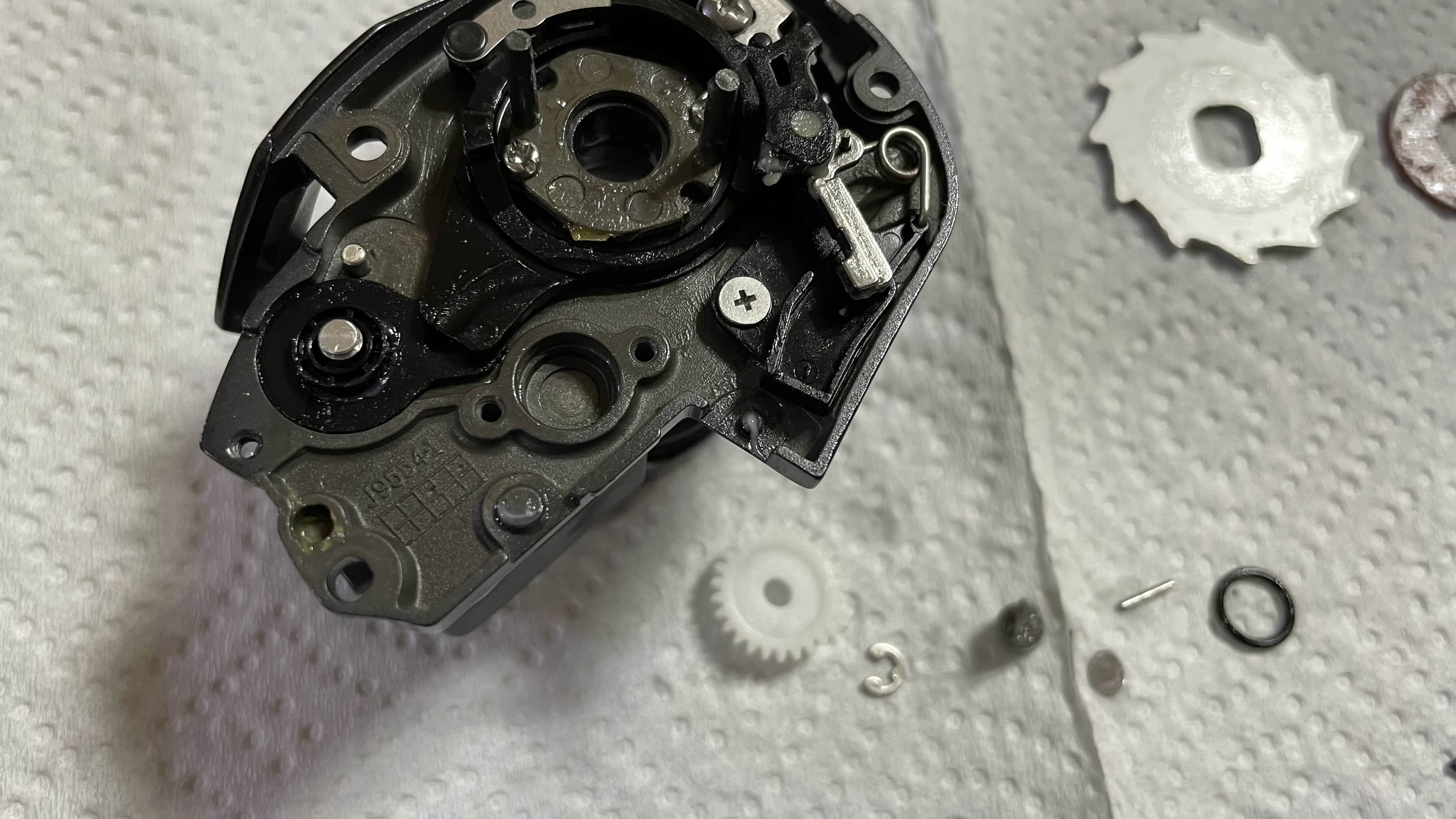 스풀 축이 들어가서 돌아가도록 해주는 피니언 기어는 위에 작은 스프링 두개를 빼고,
