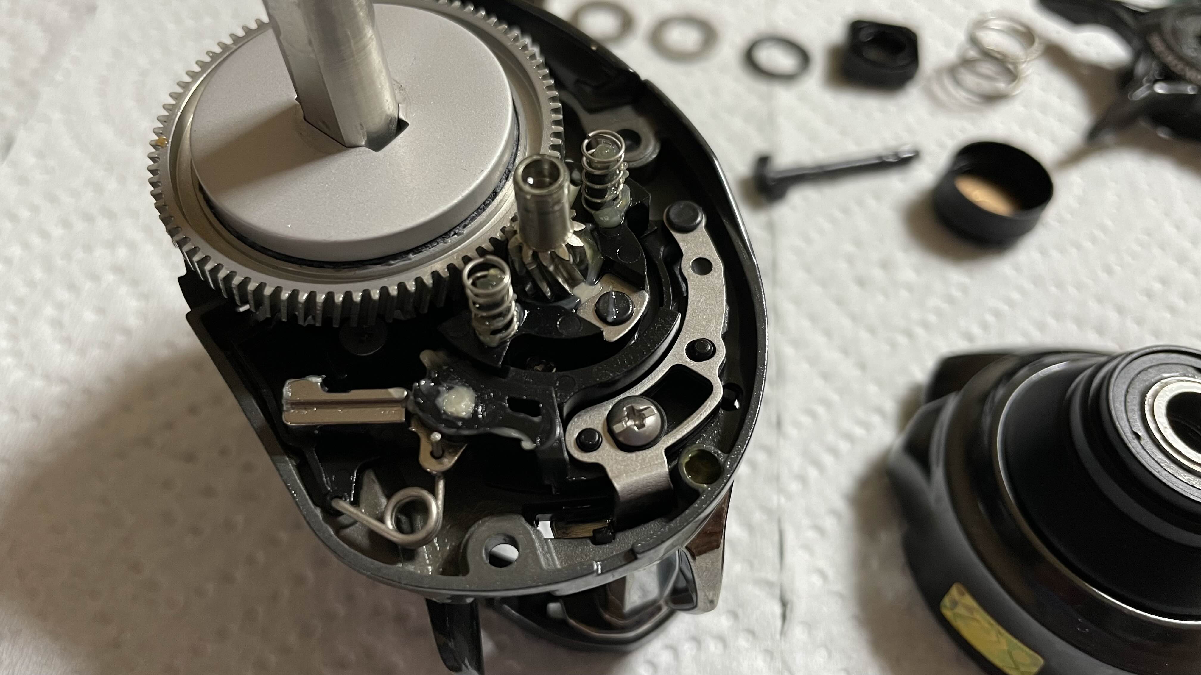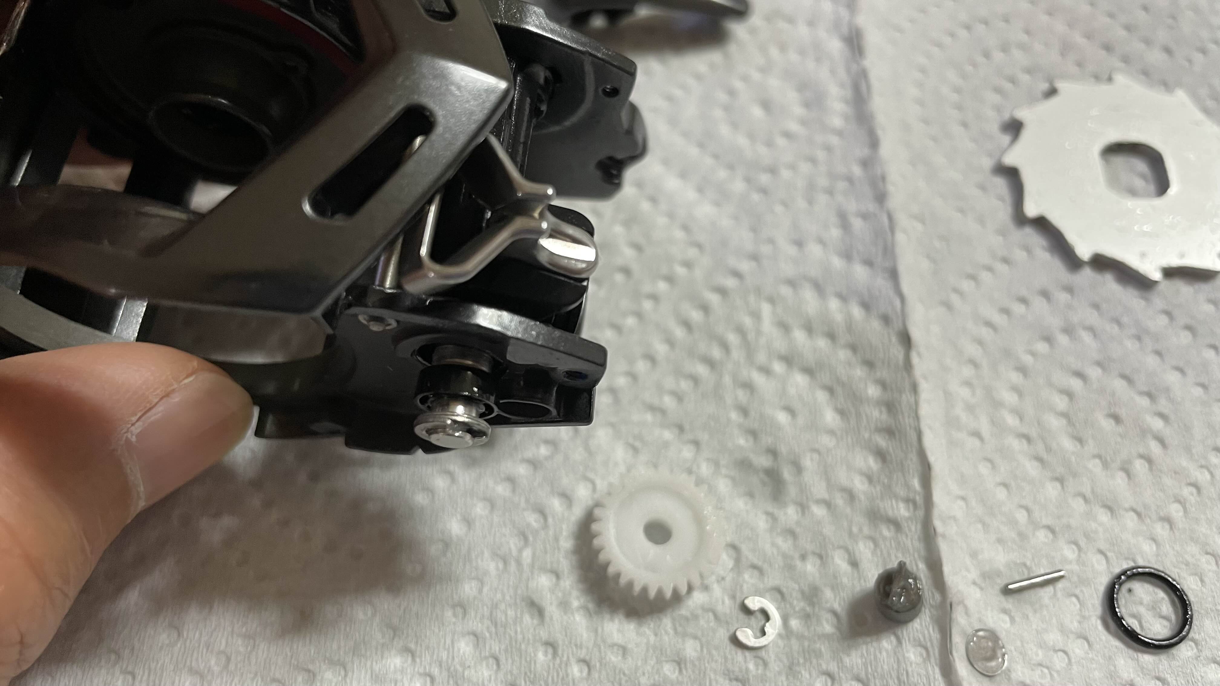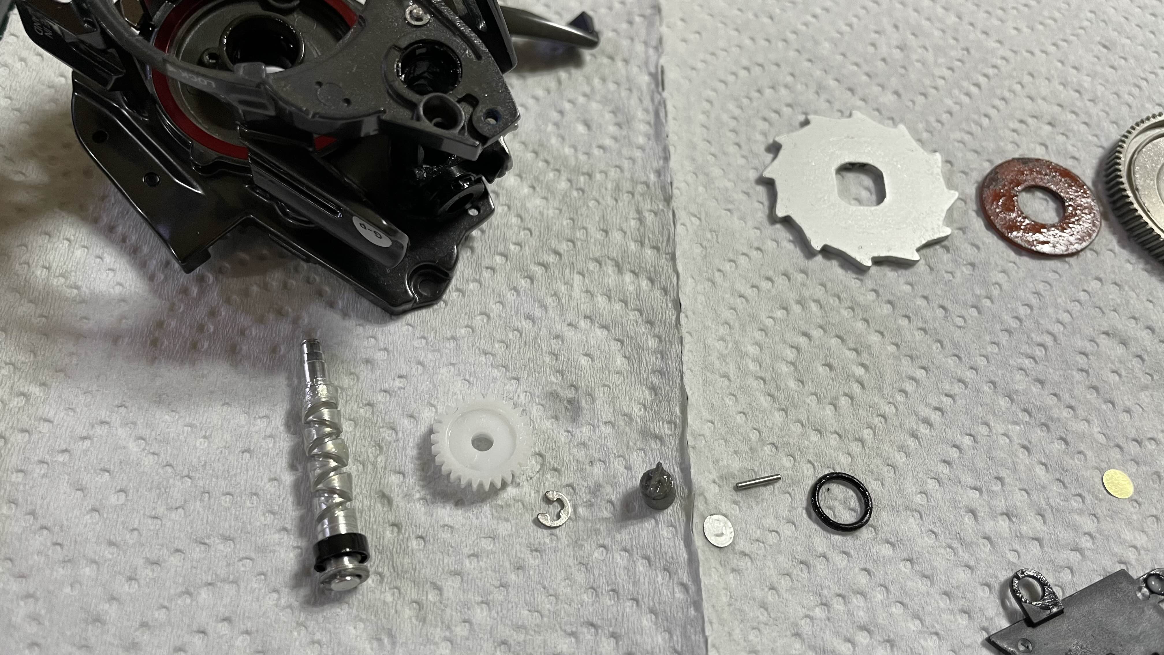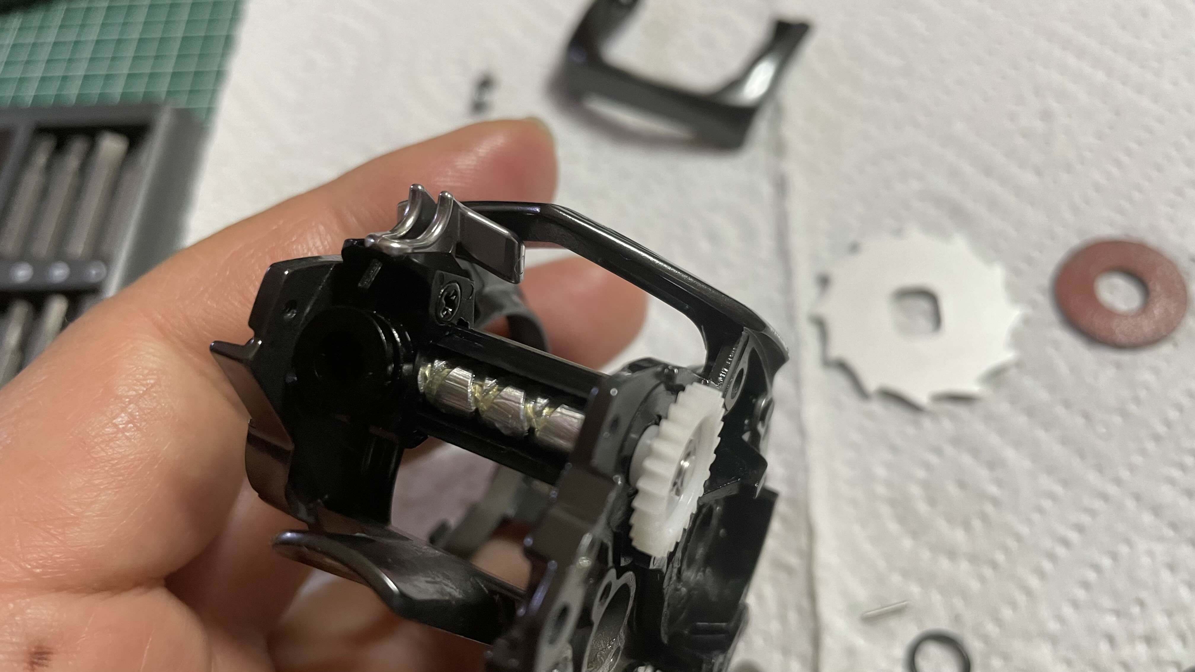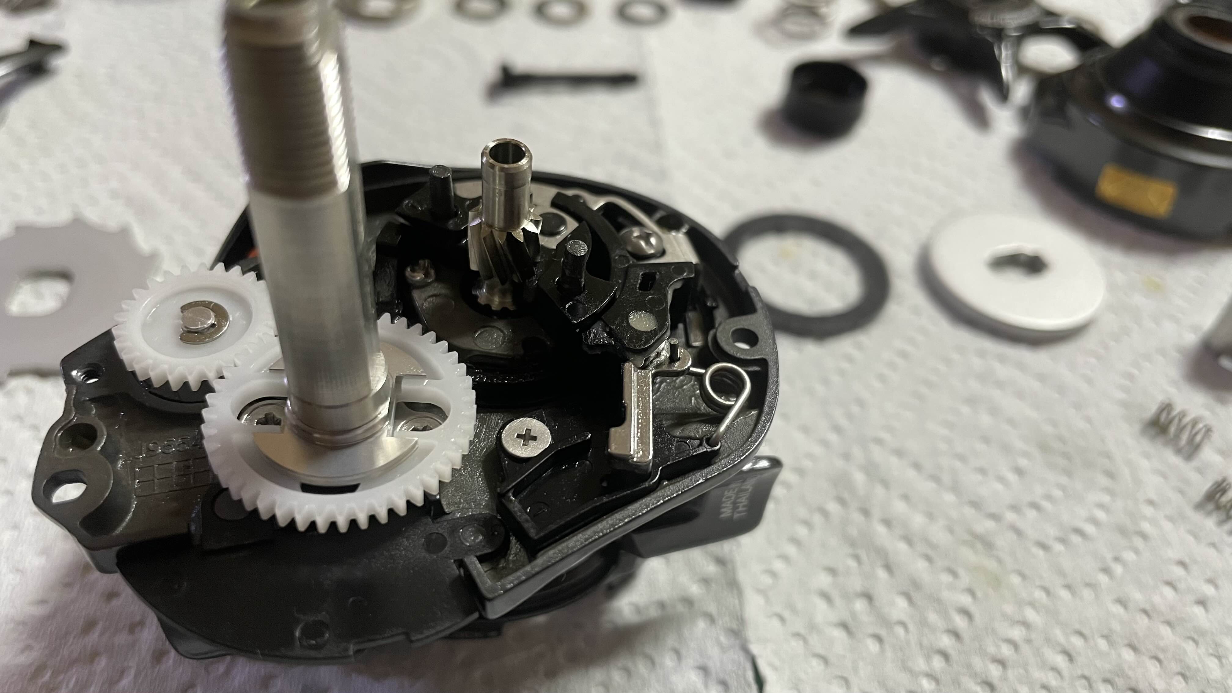 스풀 축이 들어가서 돌아가도록 해주는 피니언 기어는 위에 작은 스프링 두개를 빼고,