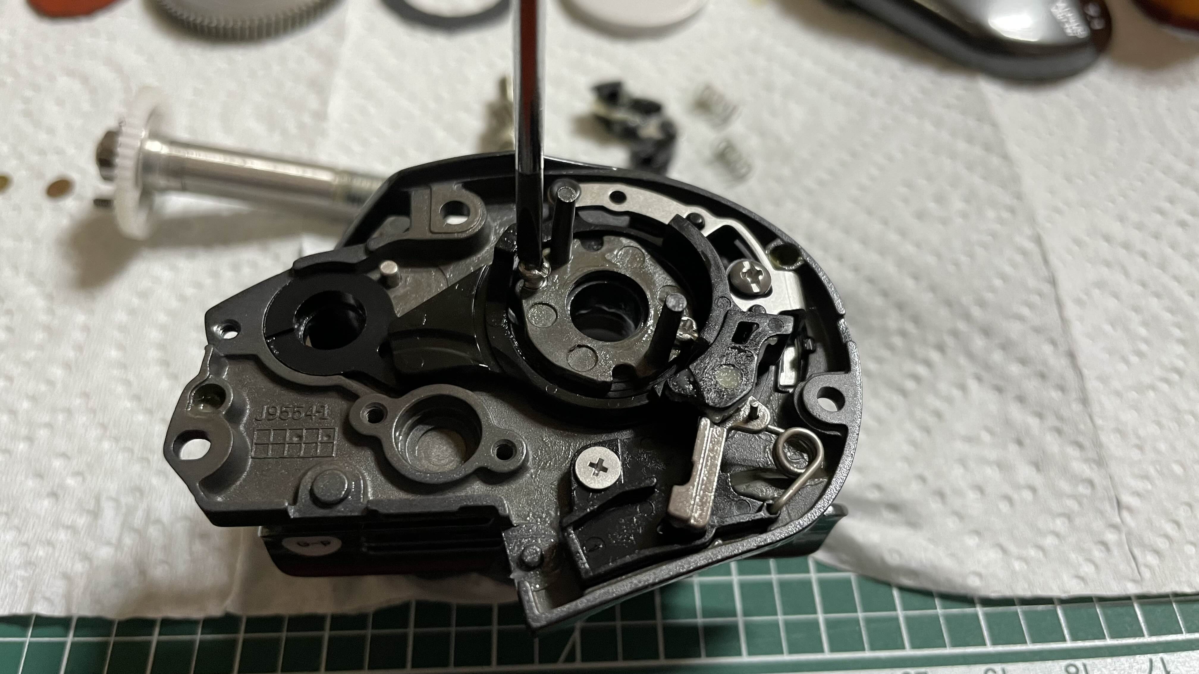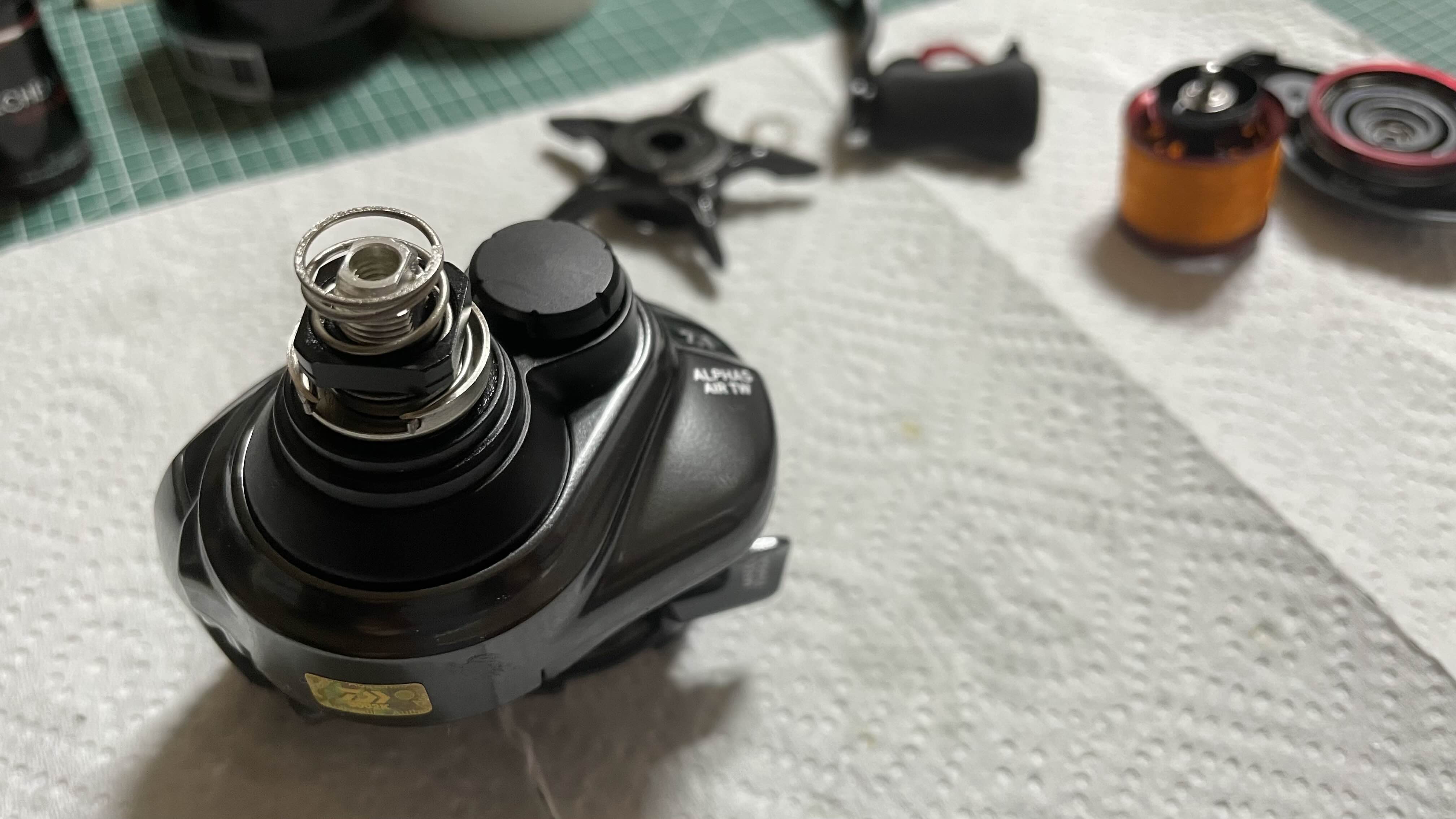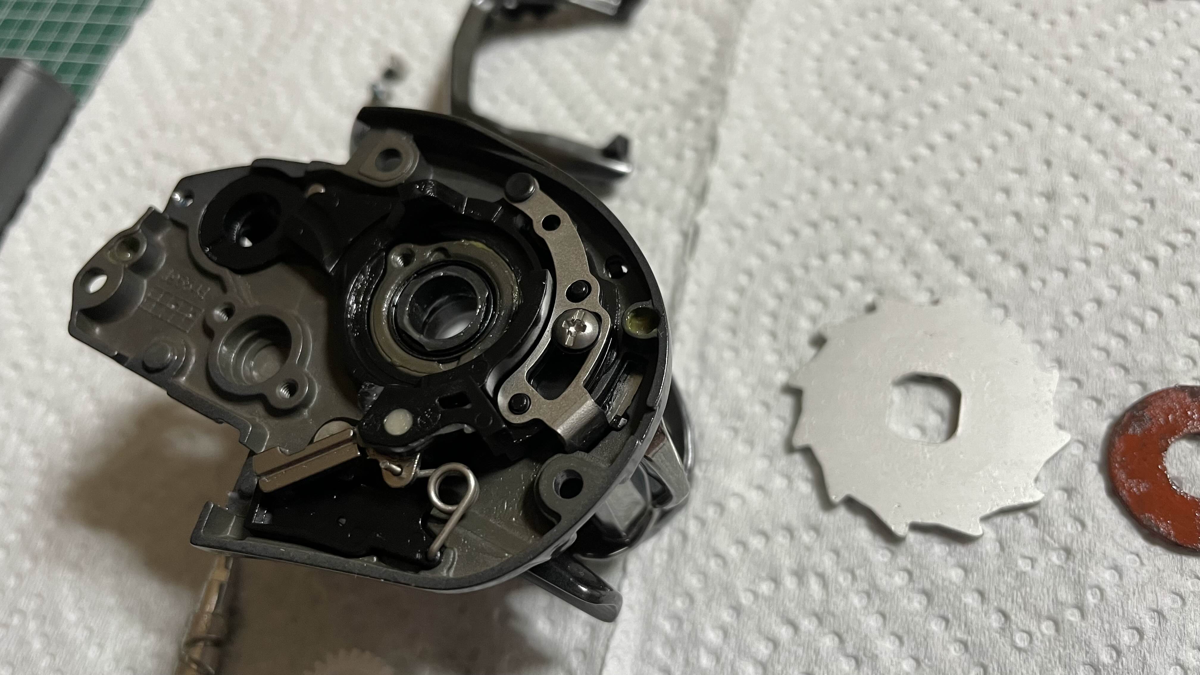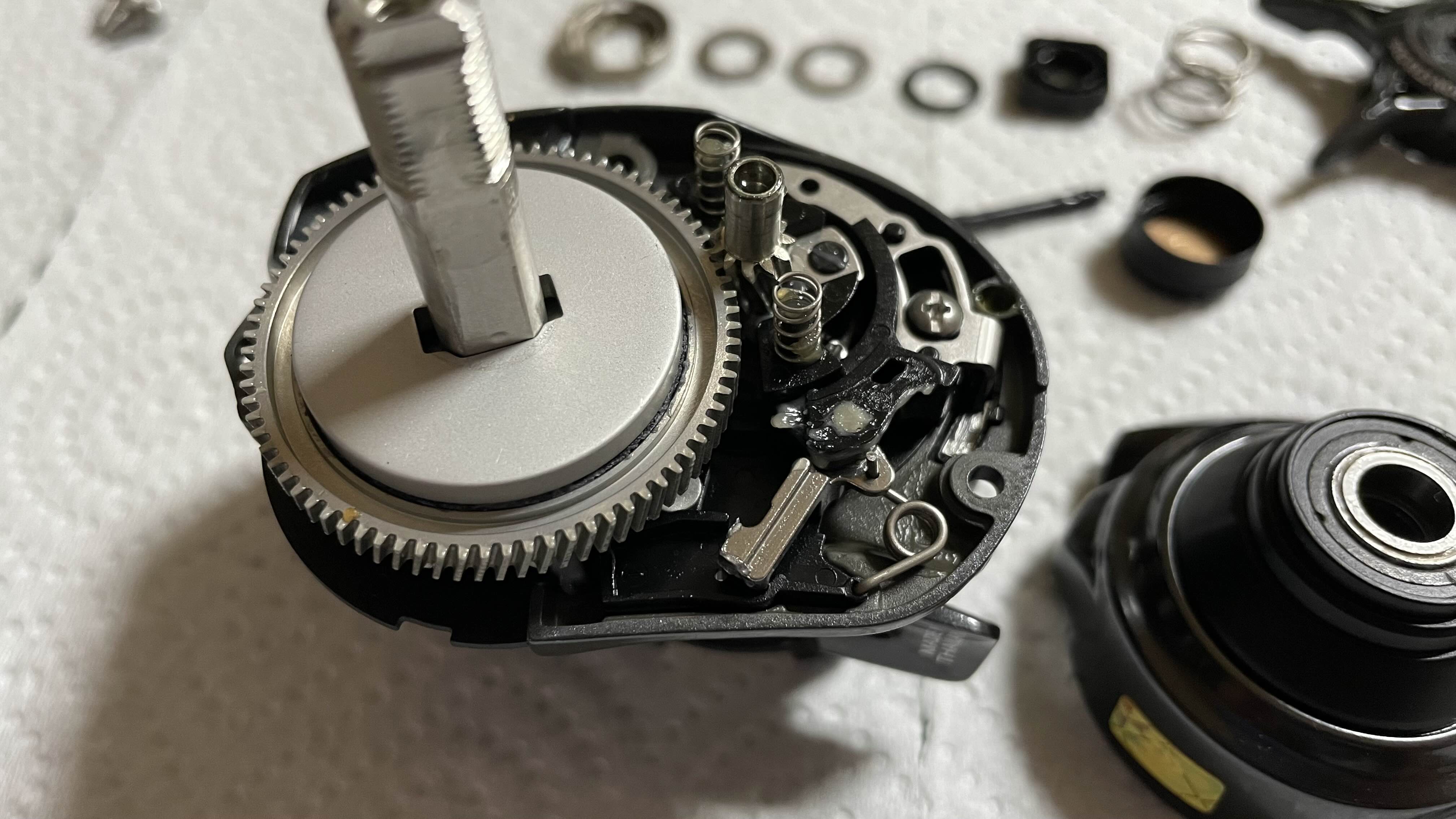 스풀 축이 들어가서 돌아가도록 해주는 피니언 기어는 위에 작은 스프링 두개를 빼고,