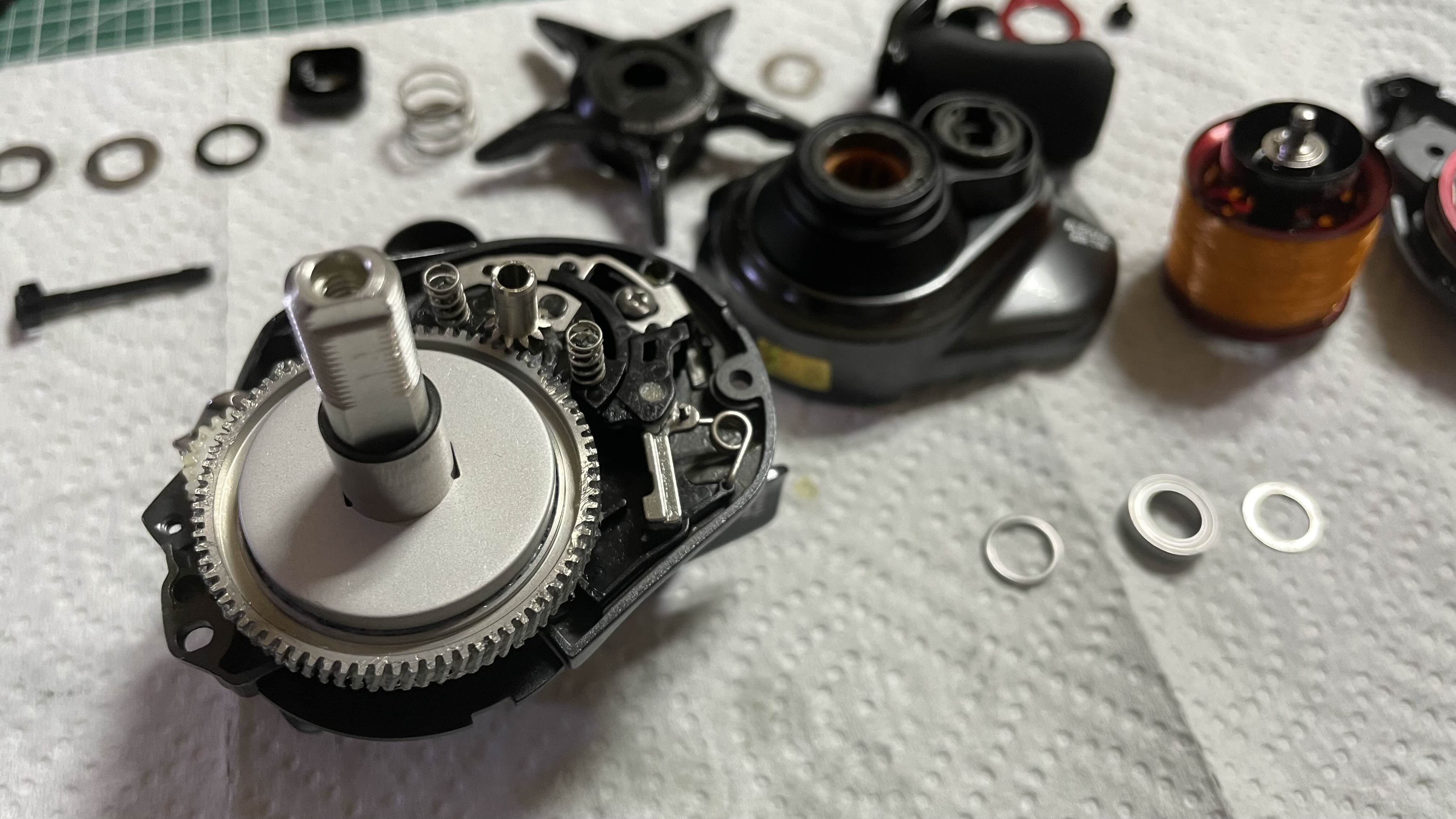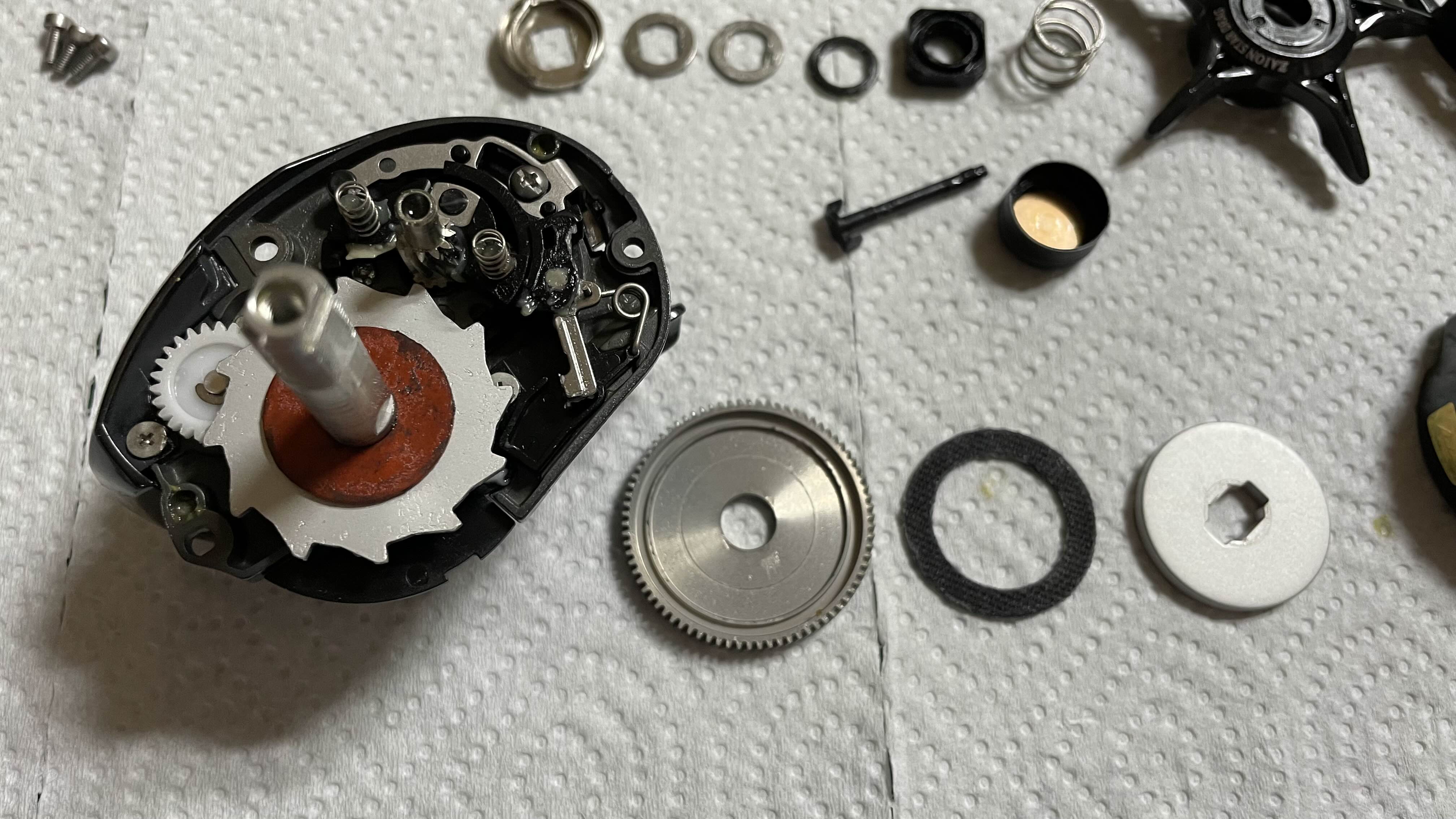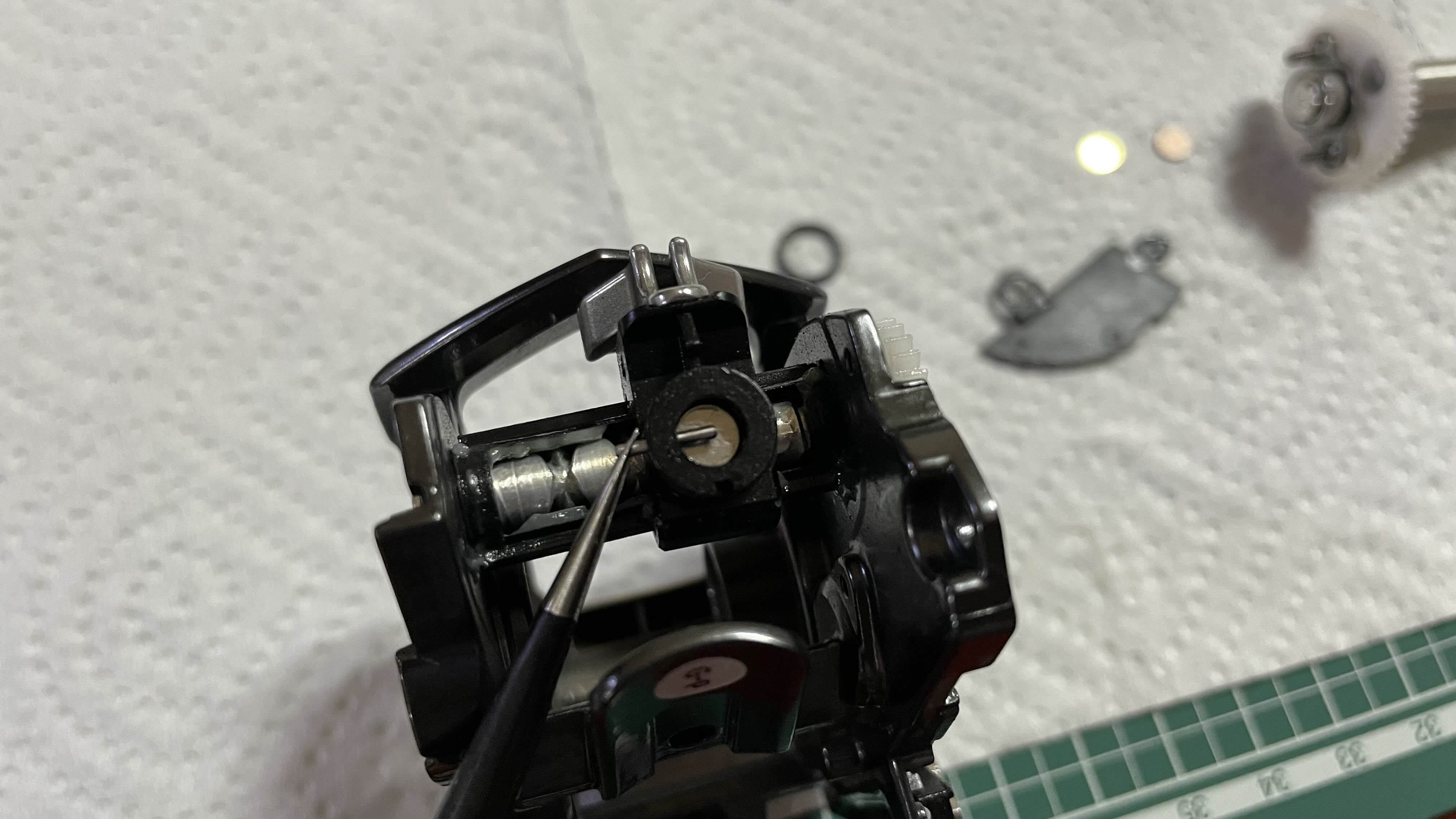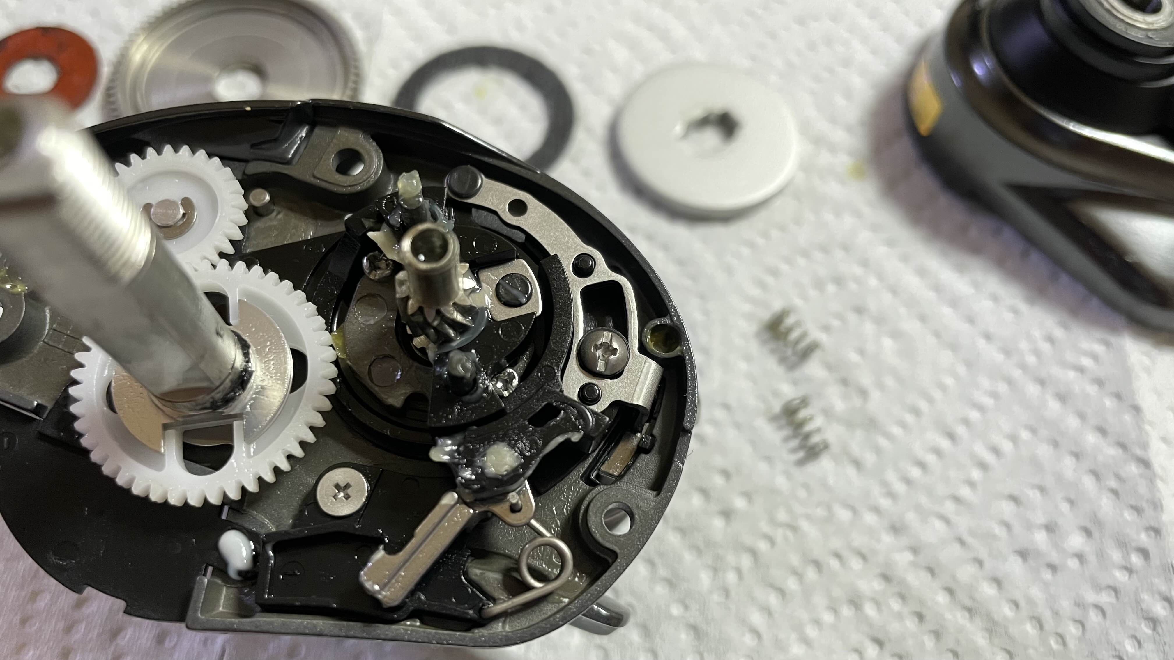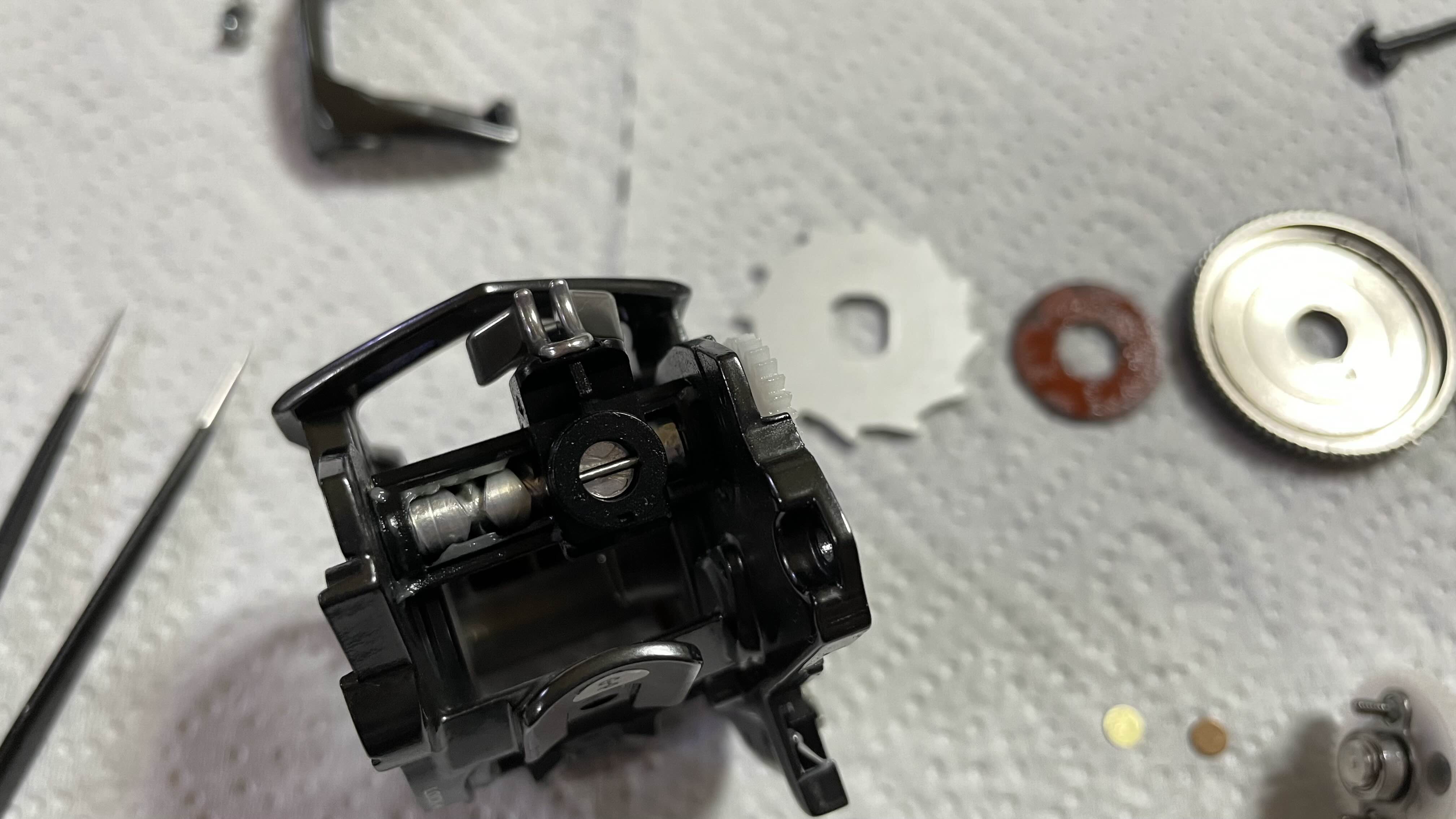 스풀 축이 들어가서 돌아가도록 해주는 피니언 기어는 위에 작은 스프링 두개를 빼고,
