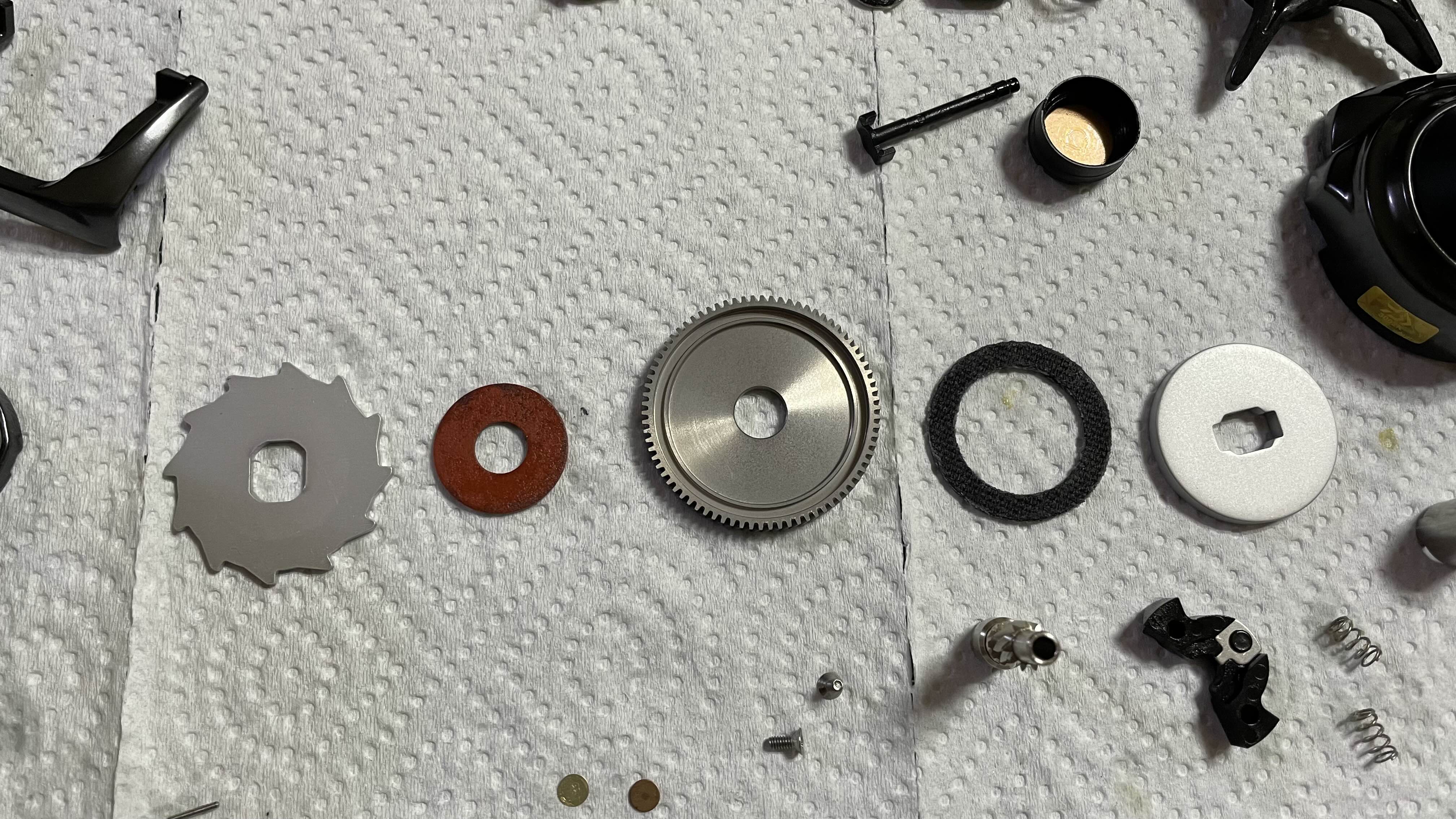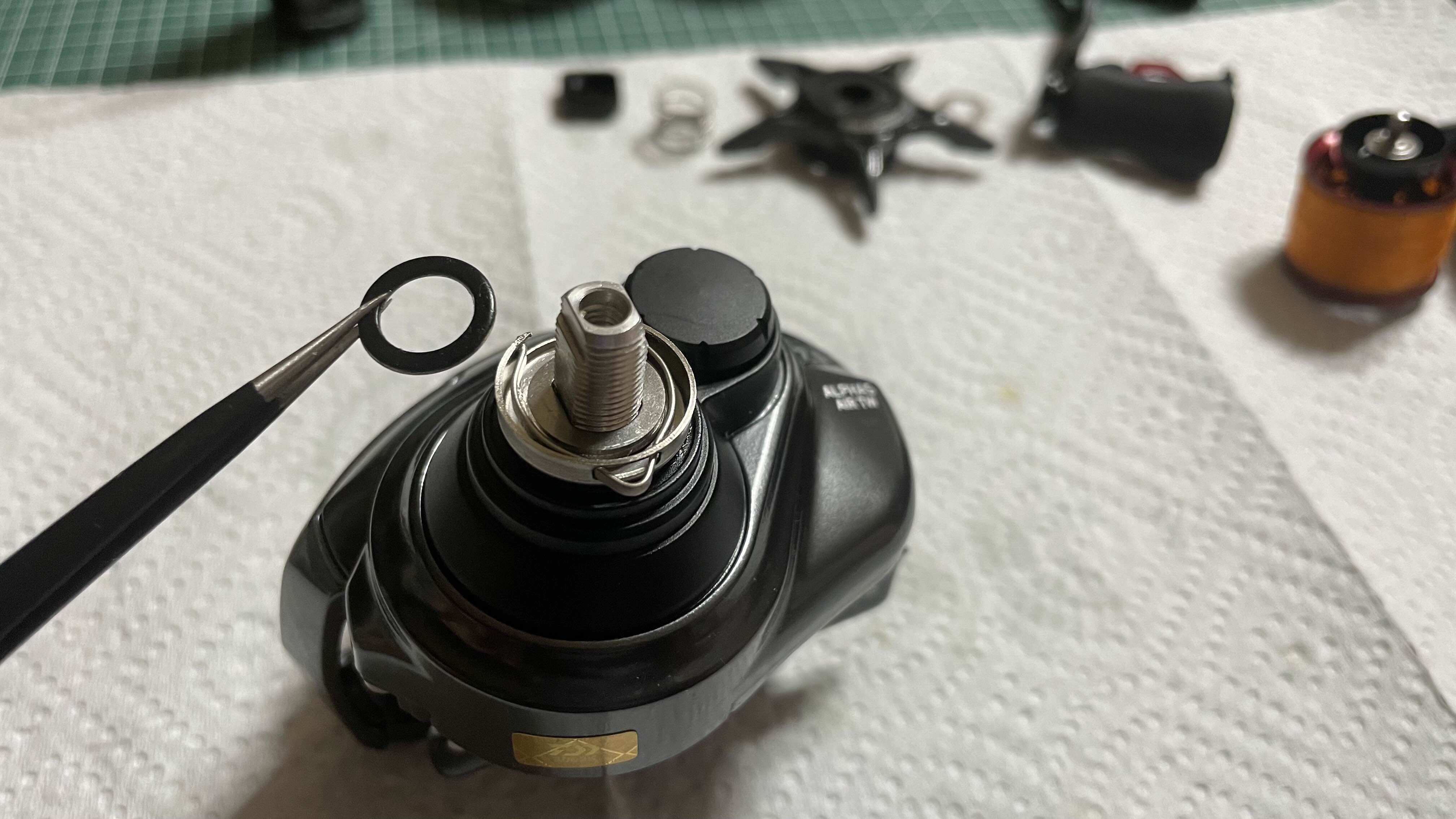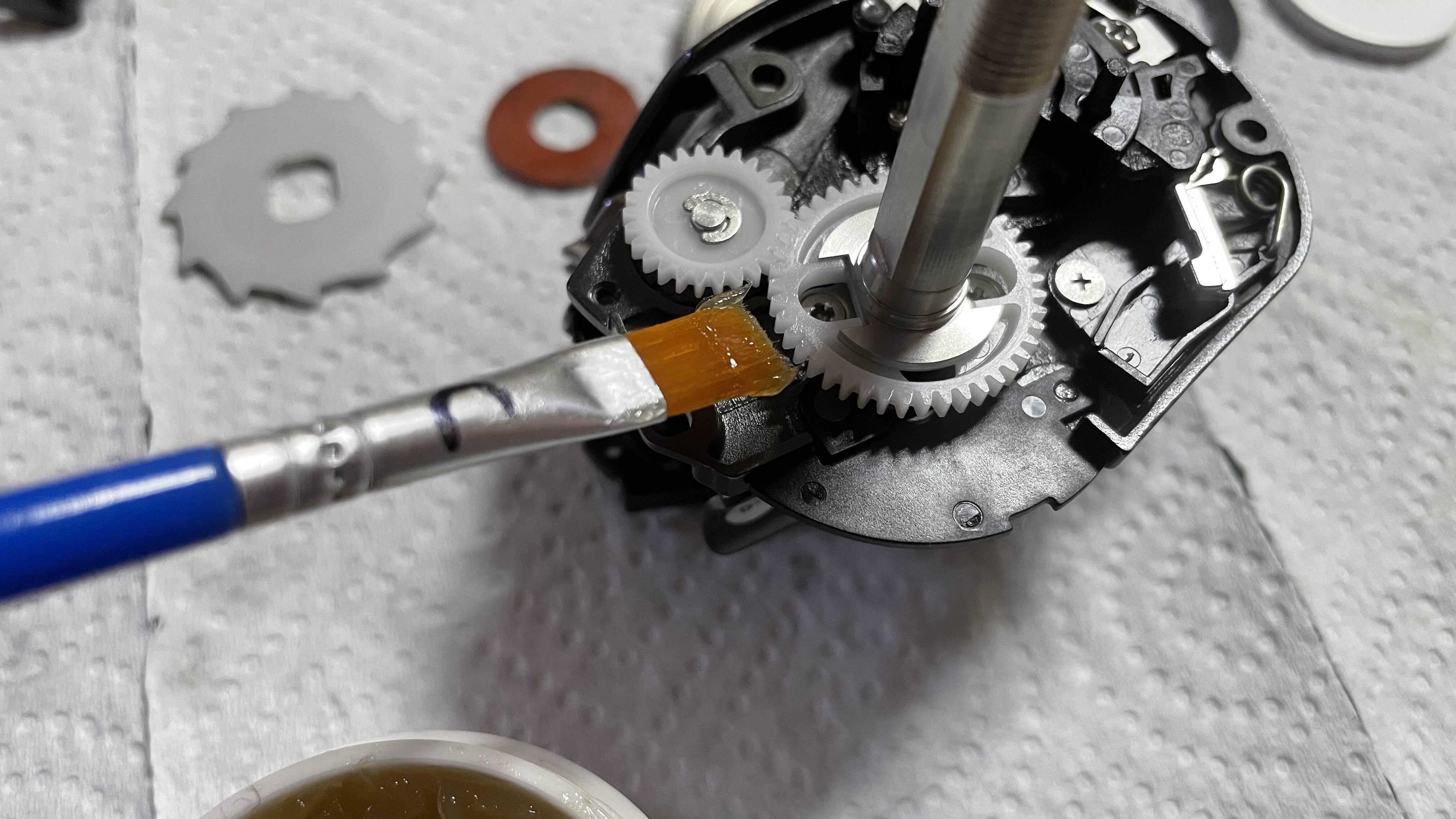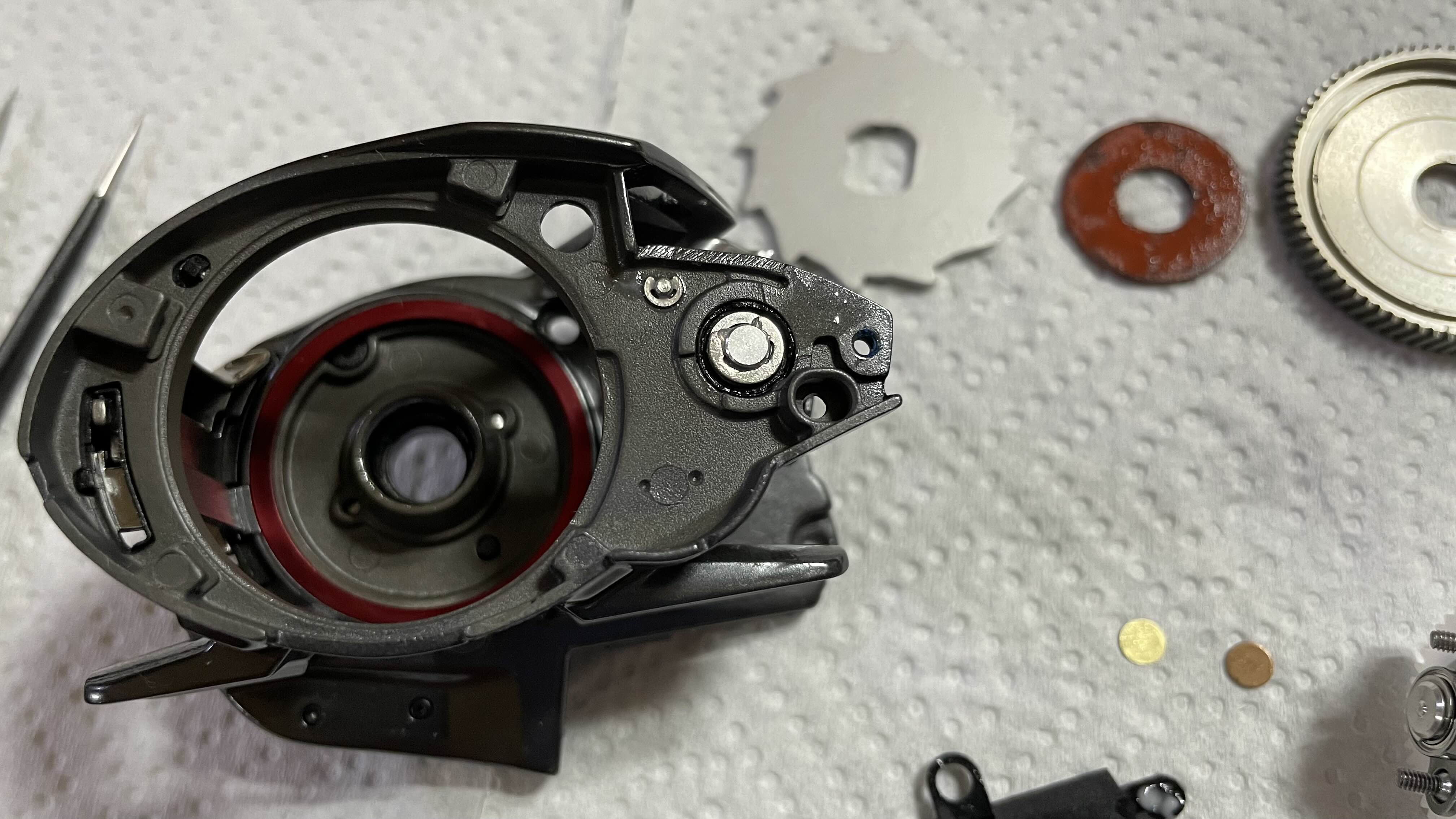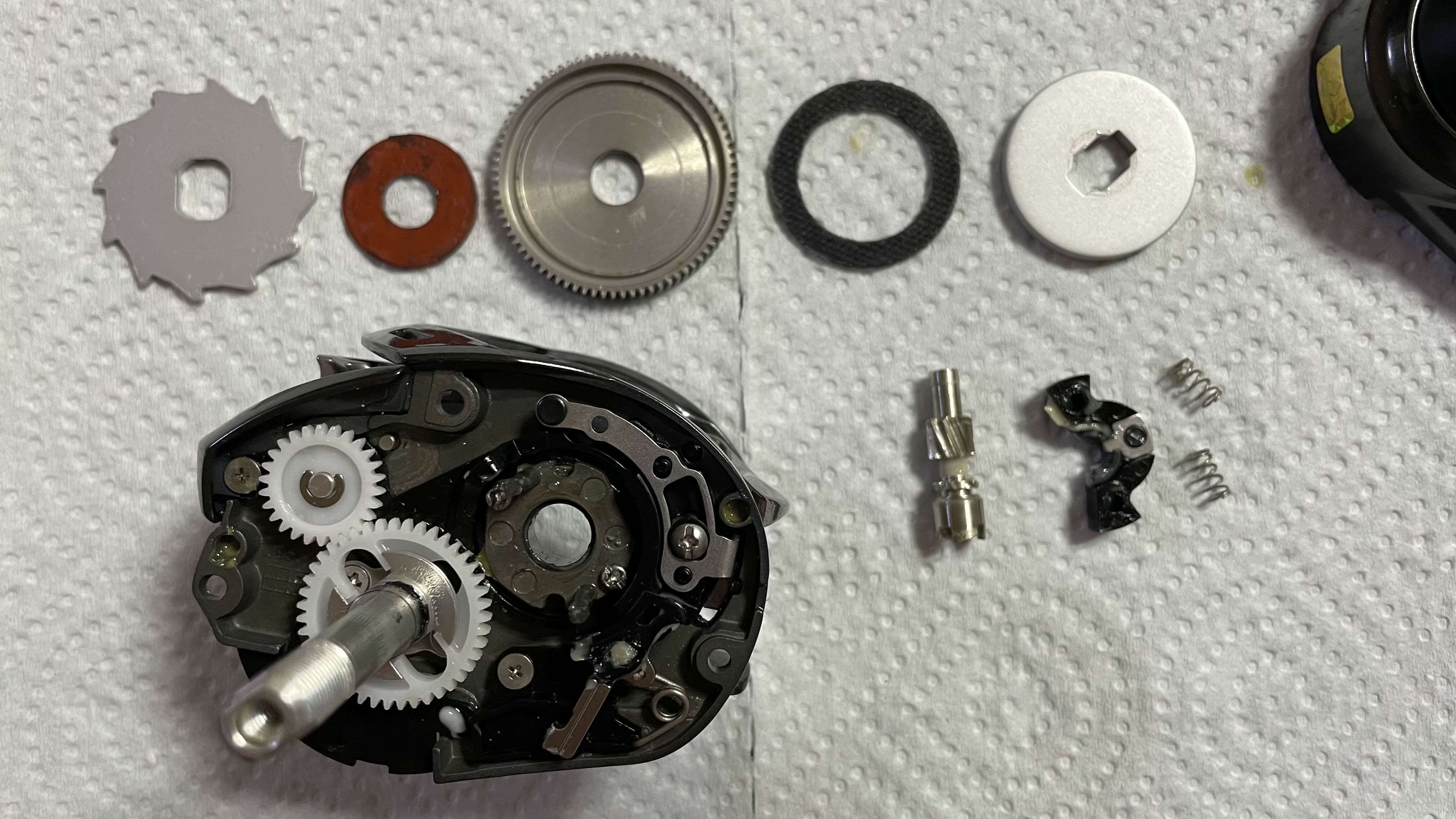 스풀 축이 들어가서 돌아가도록 해주는 피니언 기어는 위에 작은 스프링 두개를 빼고,