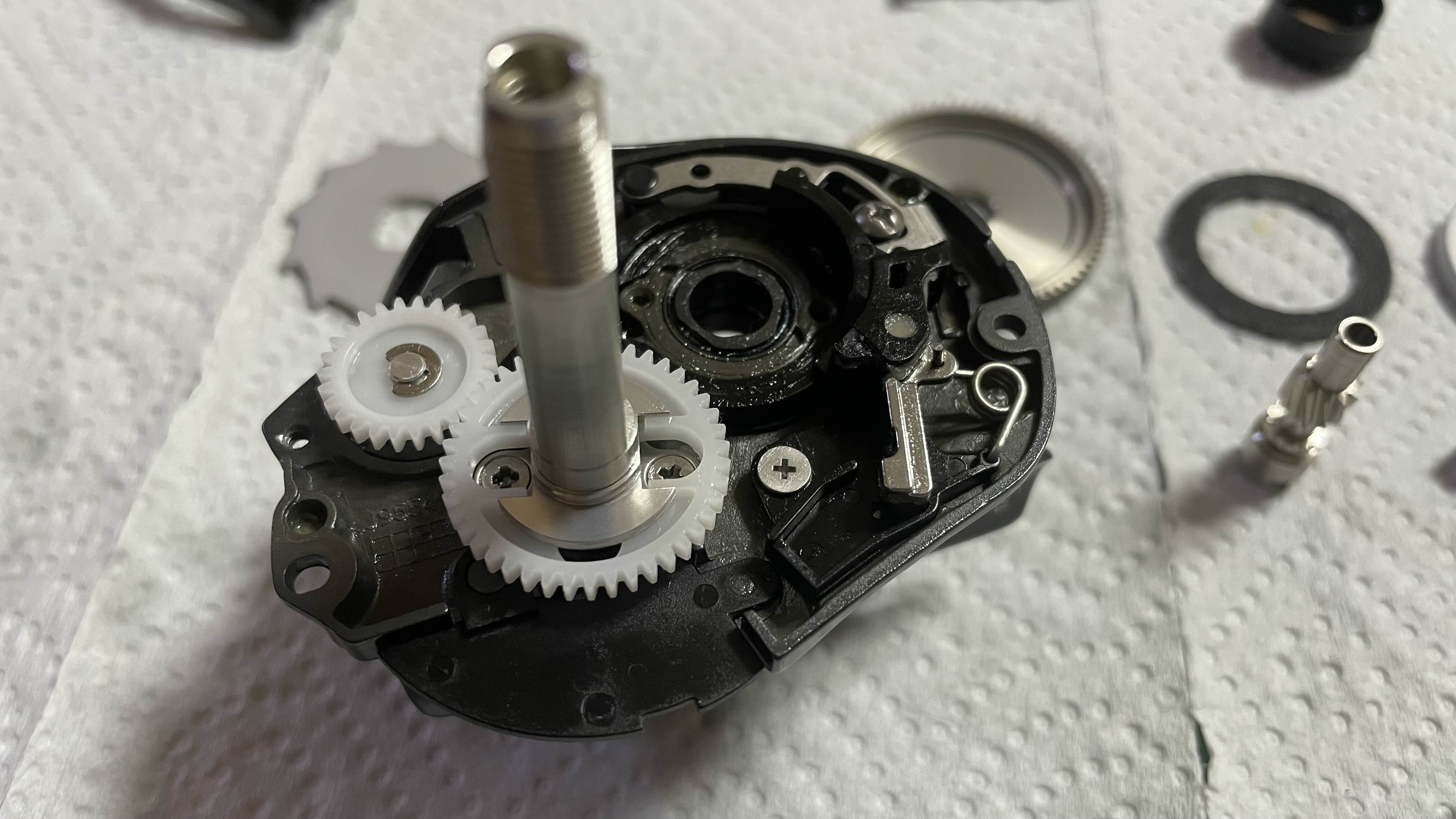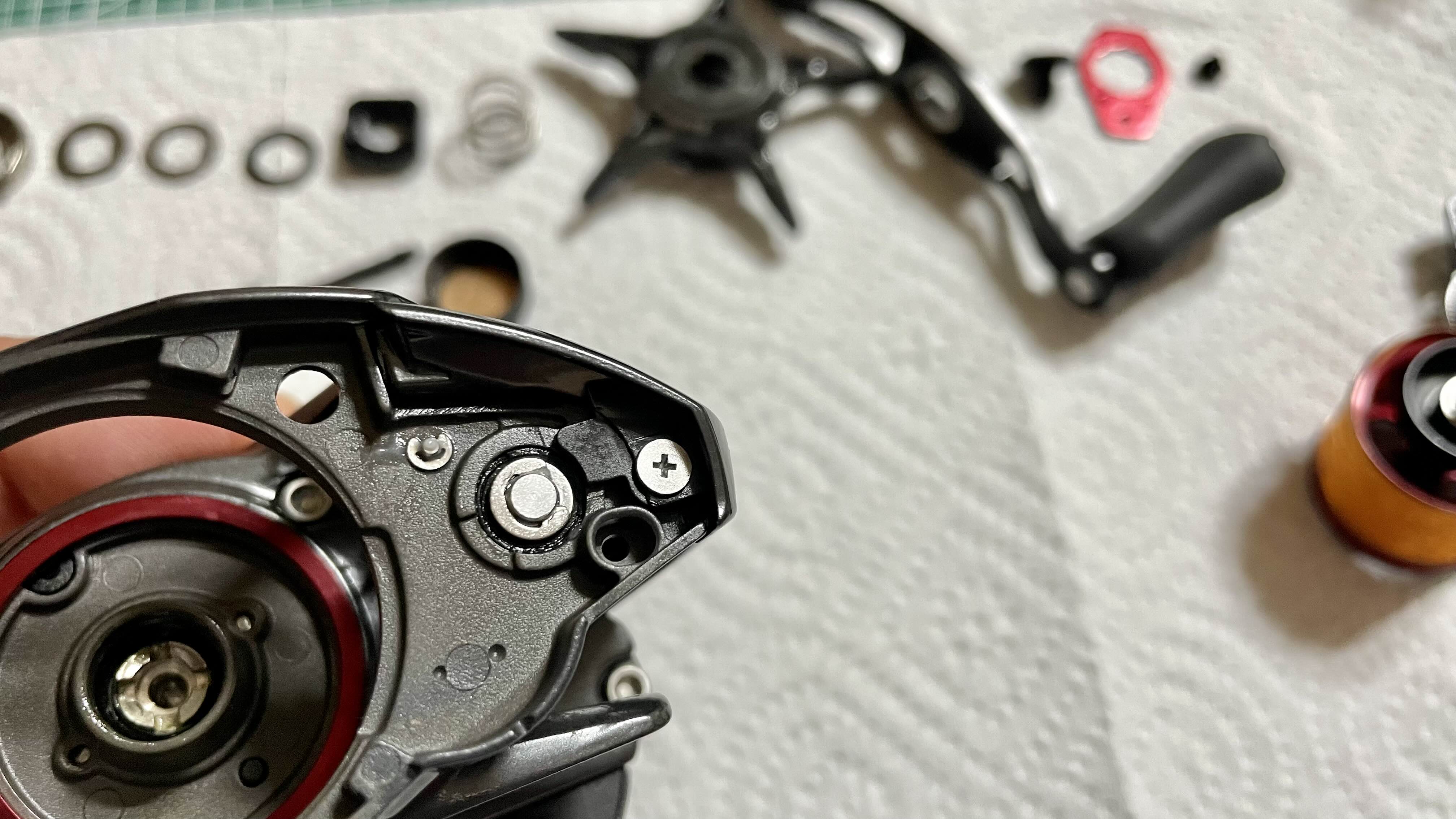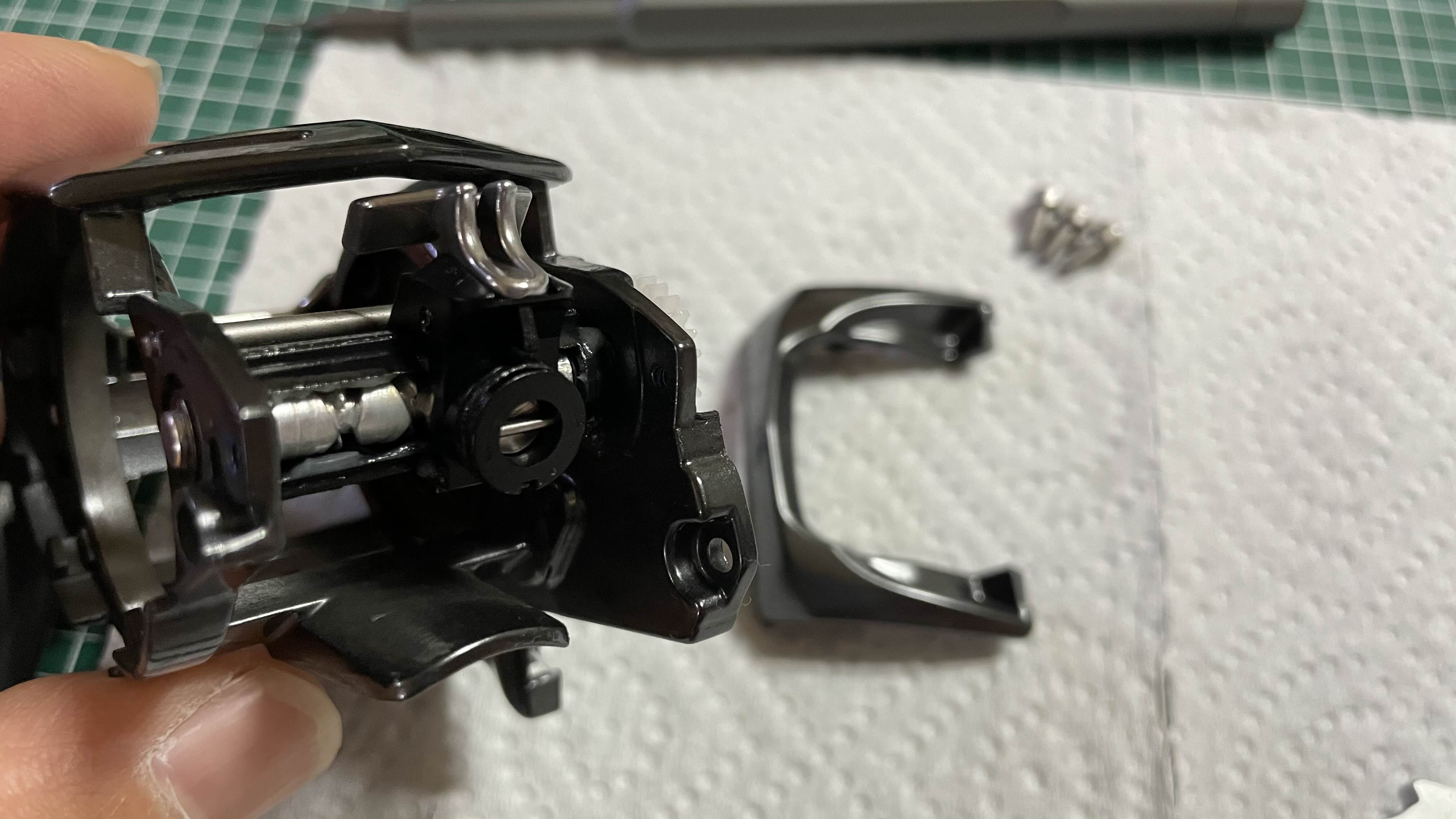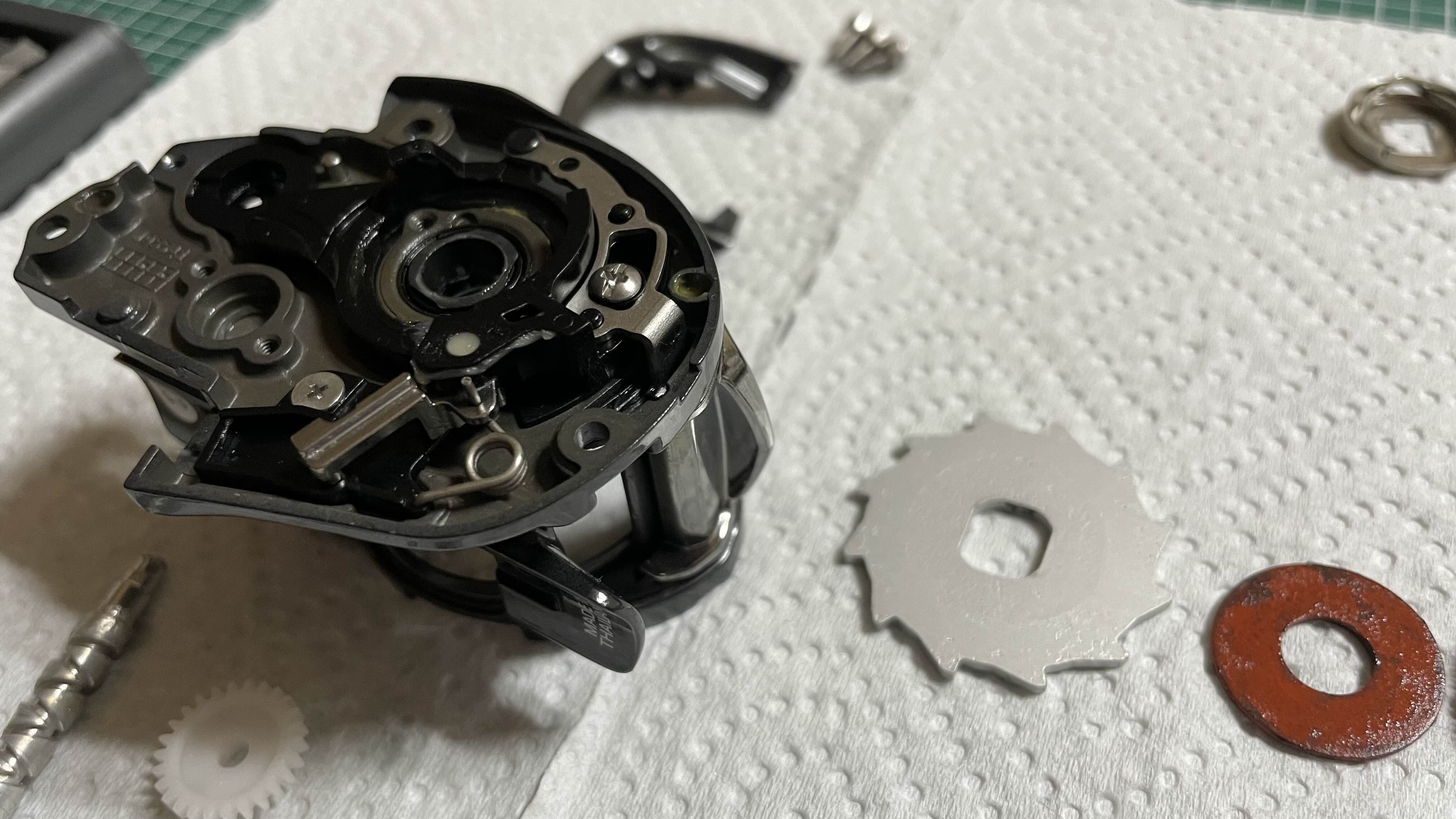 스풀 축이 들어가서 돌아가도록 해주는 피니언 기어는 위에 작은 스프링 두개를 빼고,