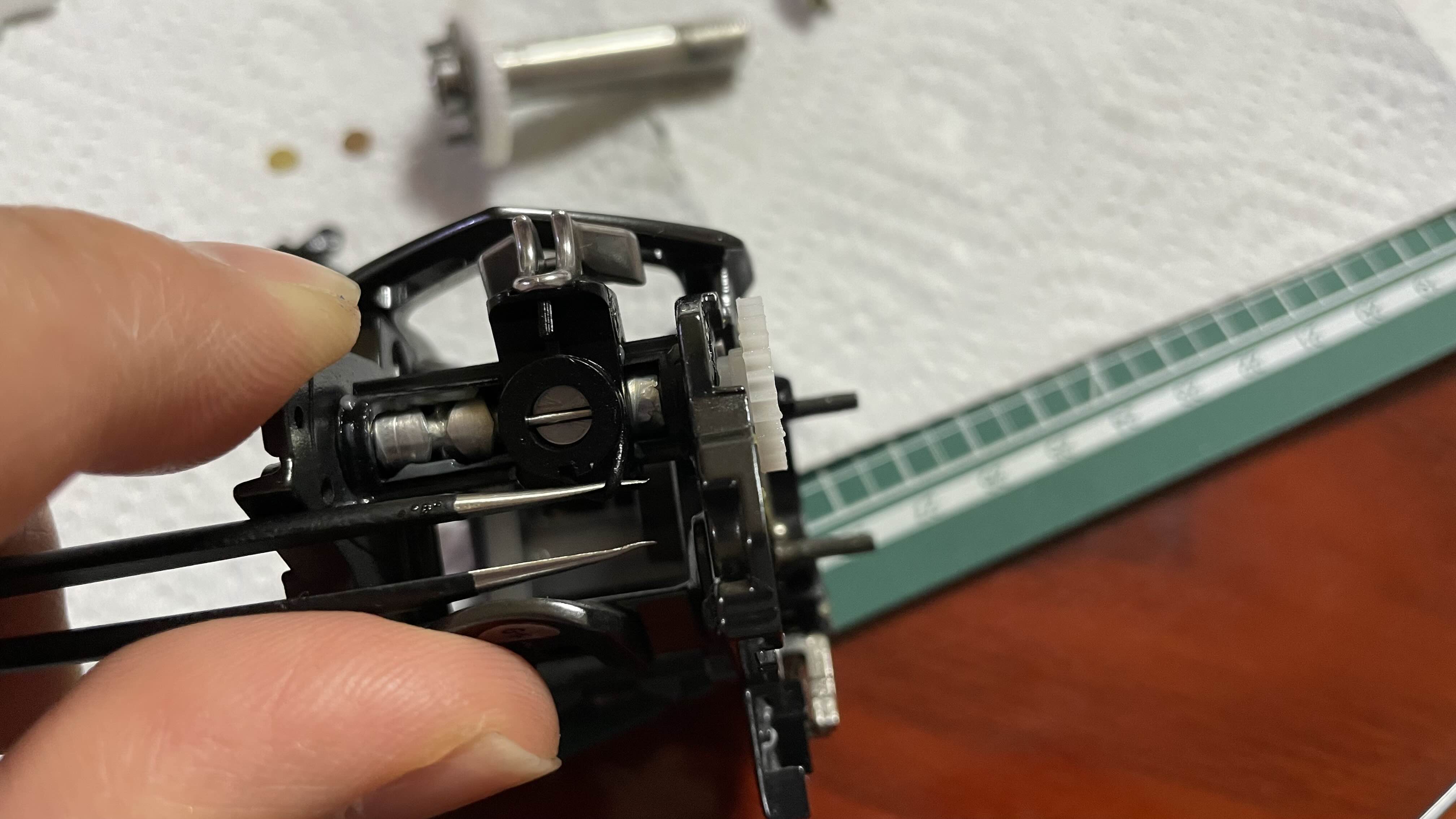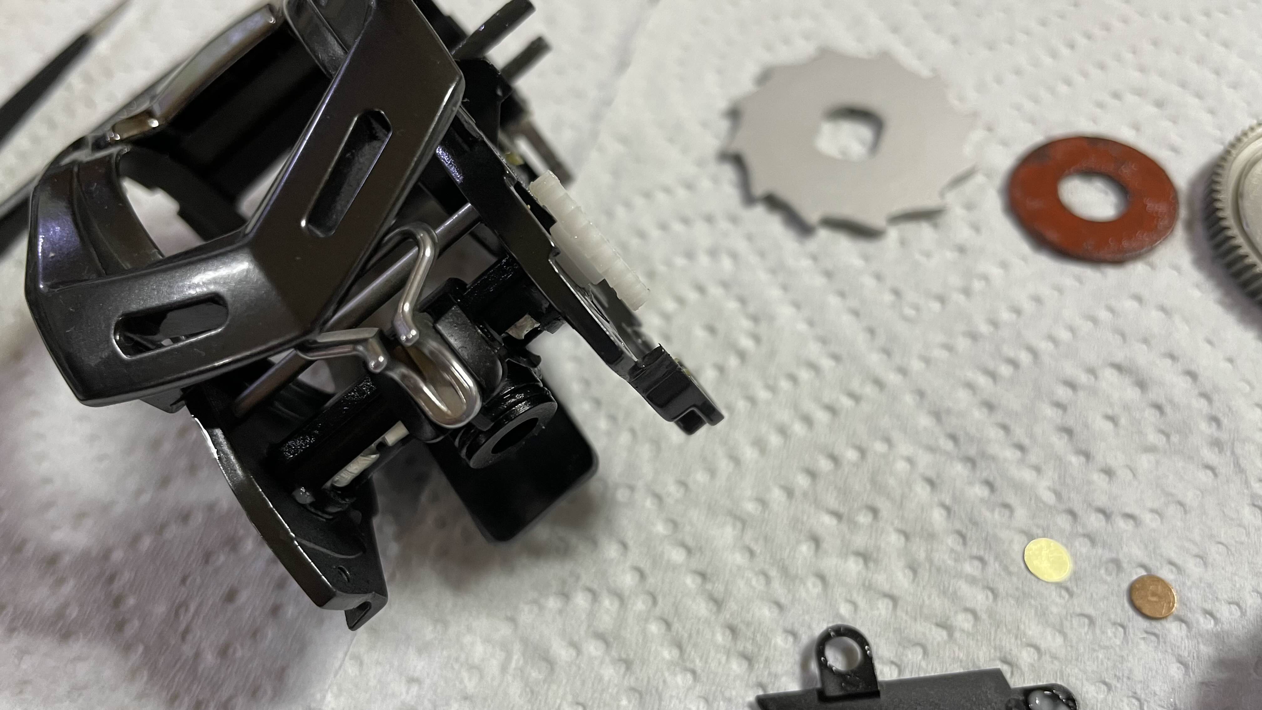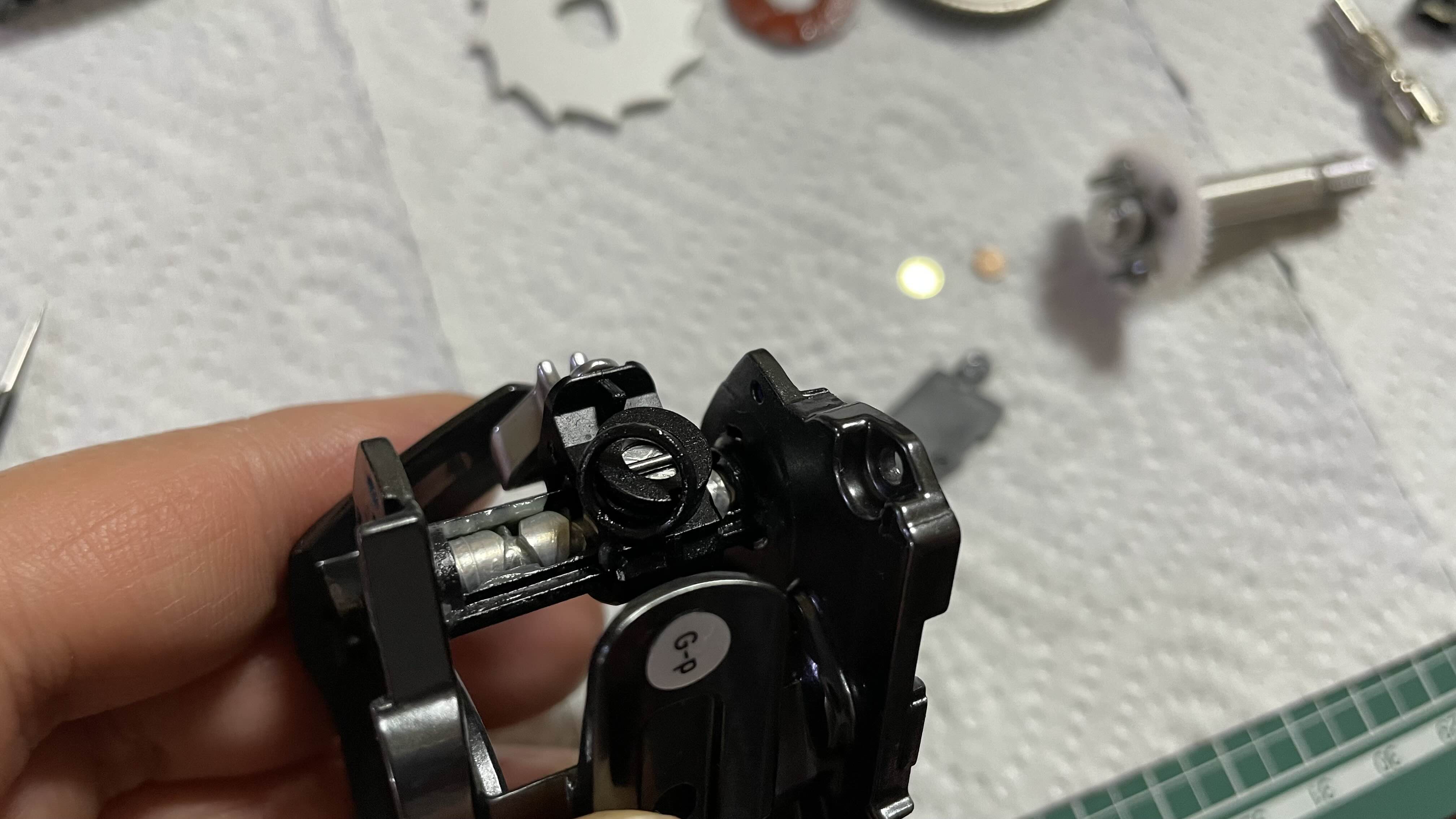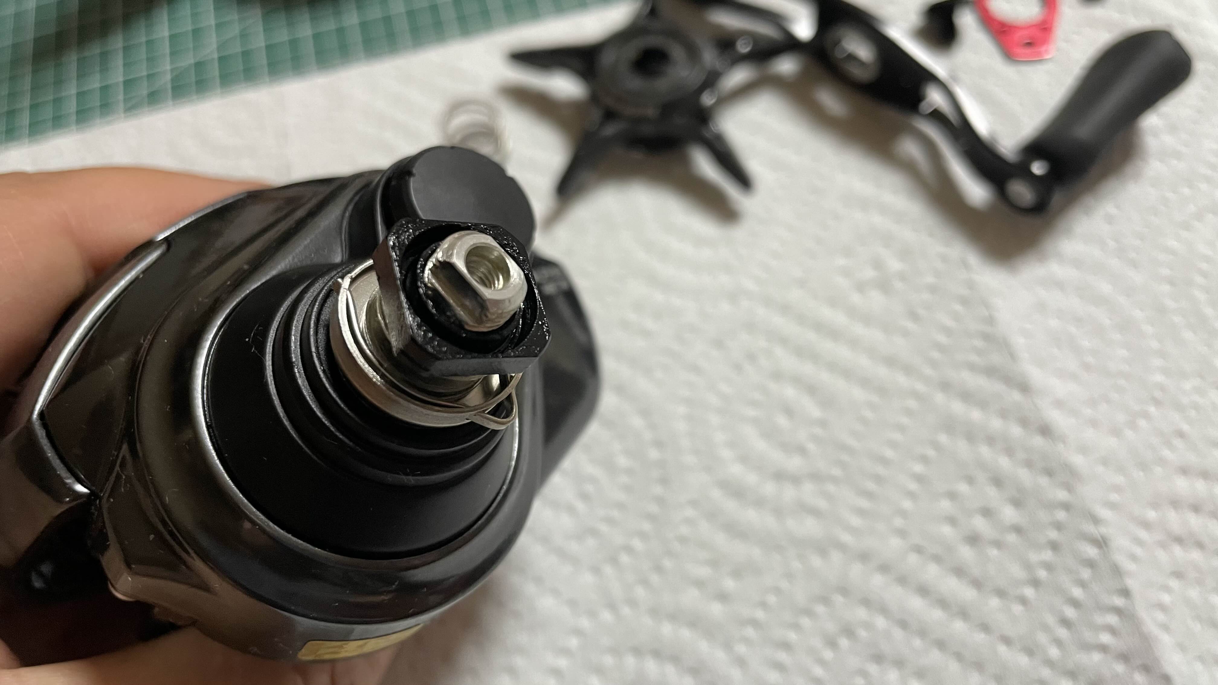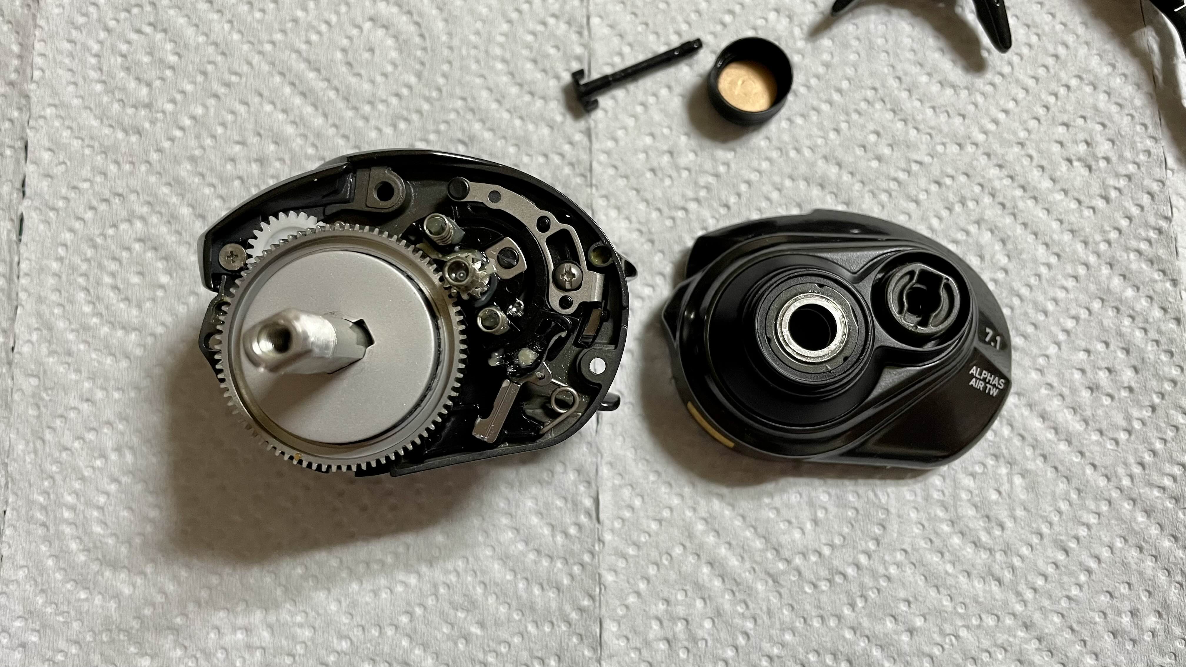 스풀 축이 들어가서 돌아가도록 해주는 피니언 기어는 위에 작은 스프링 두개를 빼고,