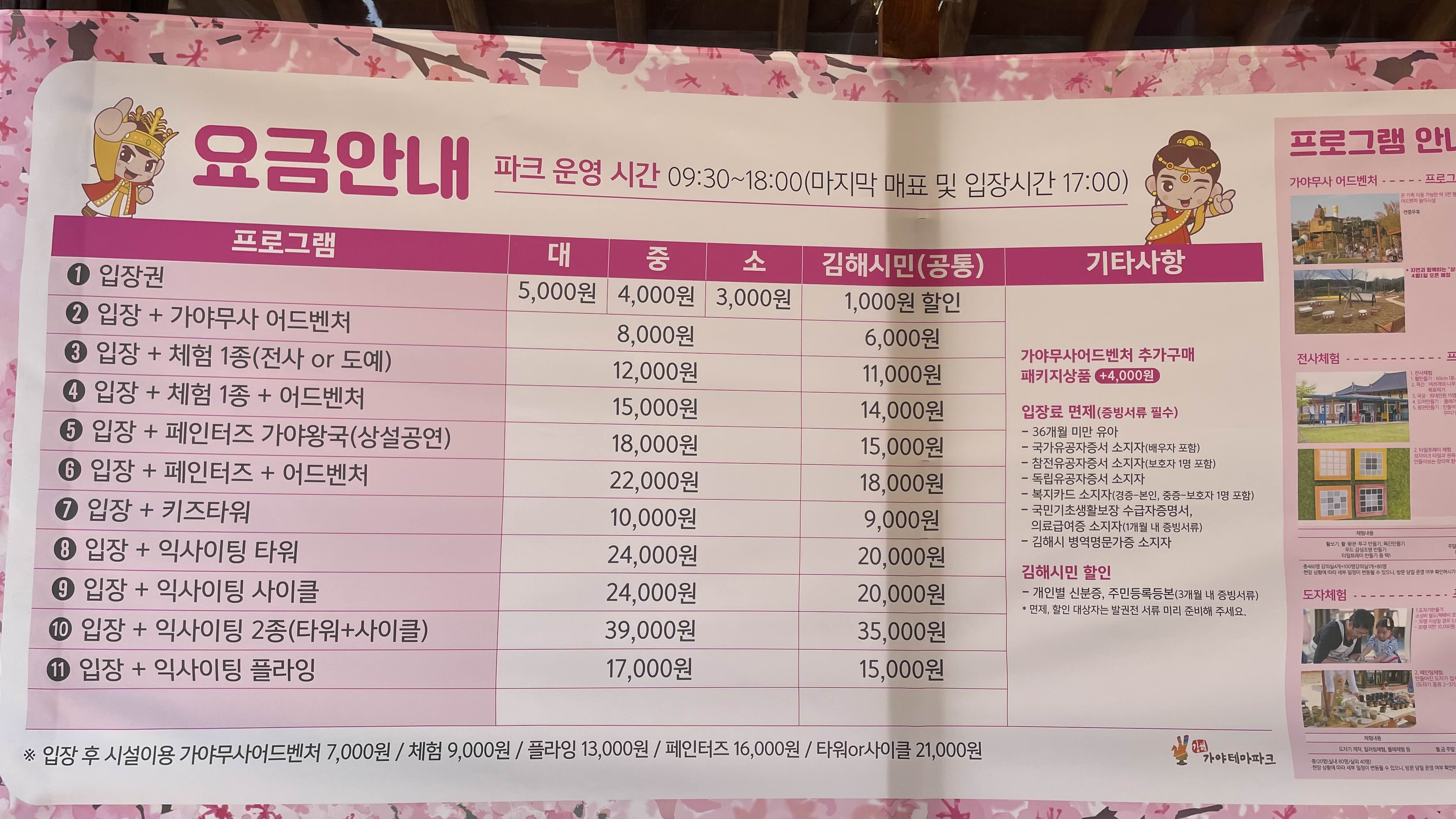 입장만 할 경우 성인 5천원이고, 김해시민은 모든 금액에 대해 1천원 할인이 적용됩니다.