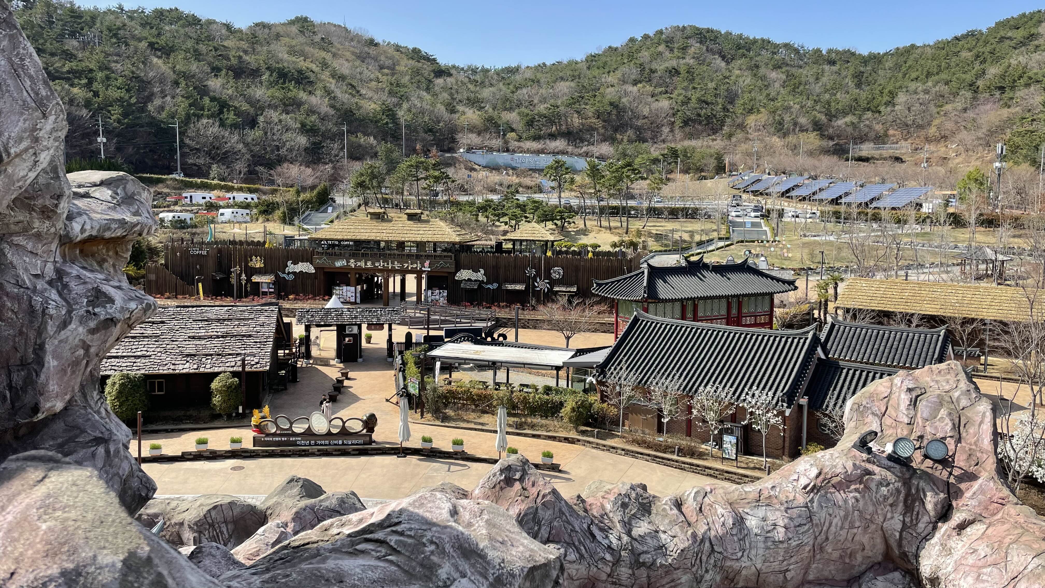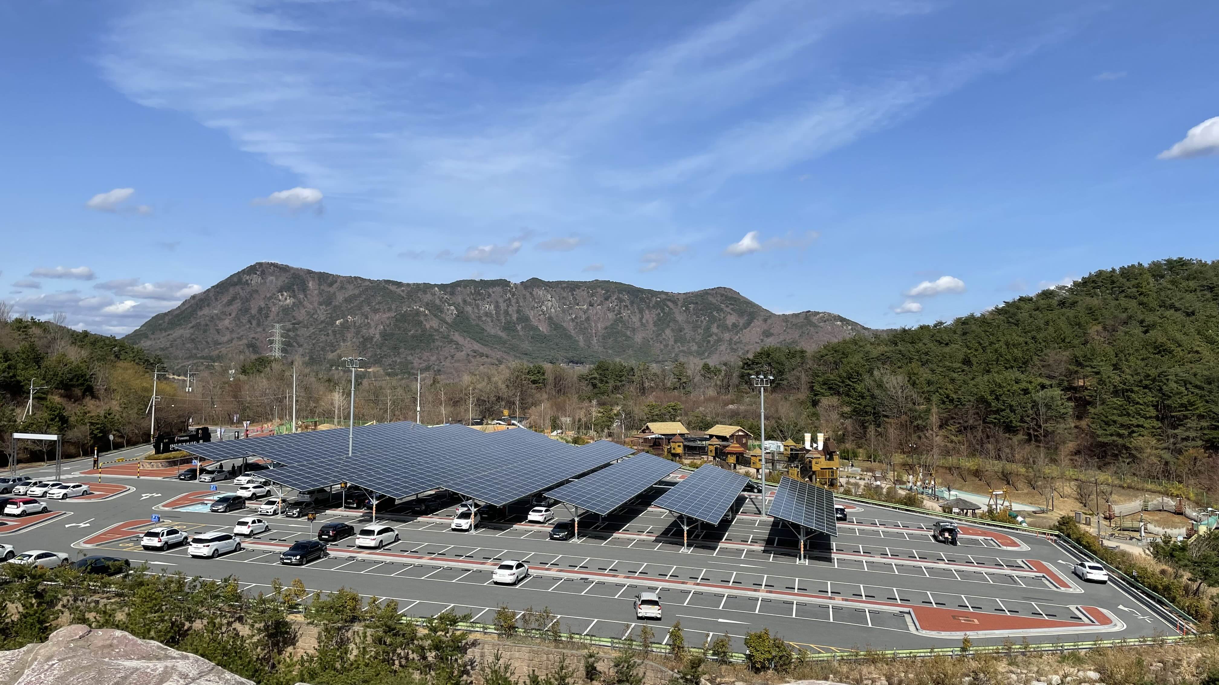 동쪽에는 태양광 패널이 설치된 넓은 주차장과 그 뒷편으로는 '가야무사 어드벤쳐' 가 보이네요.
