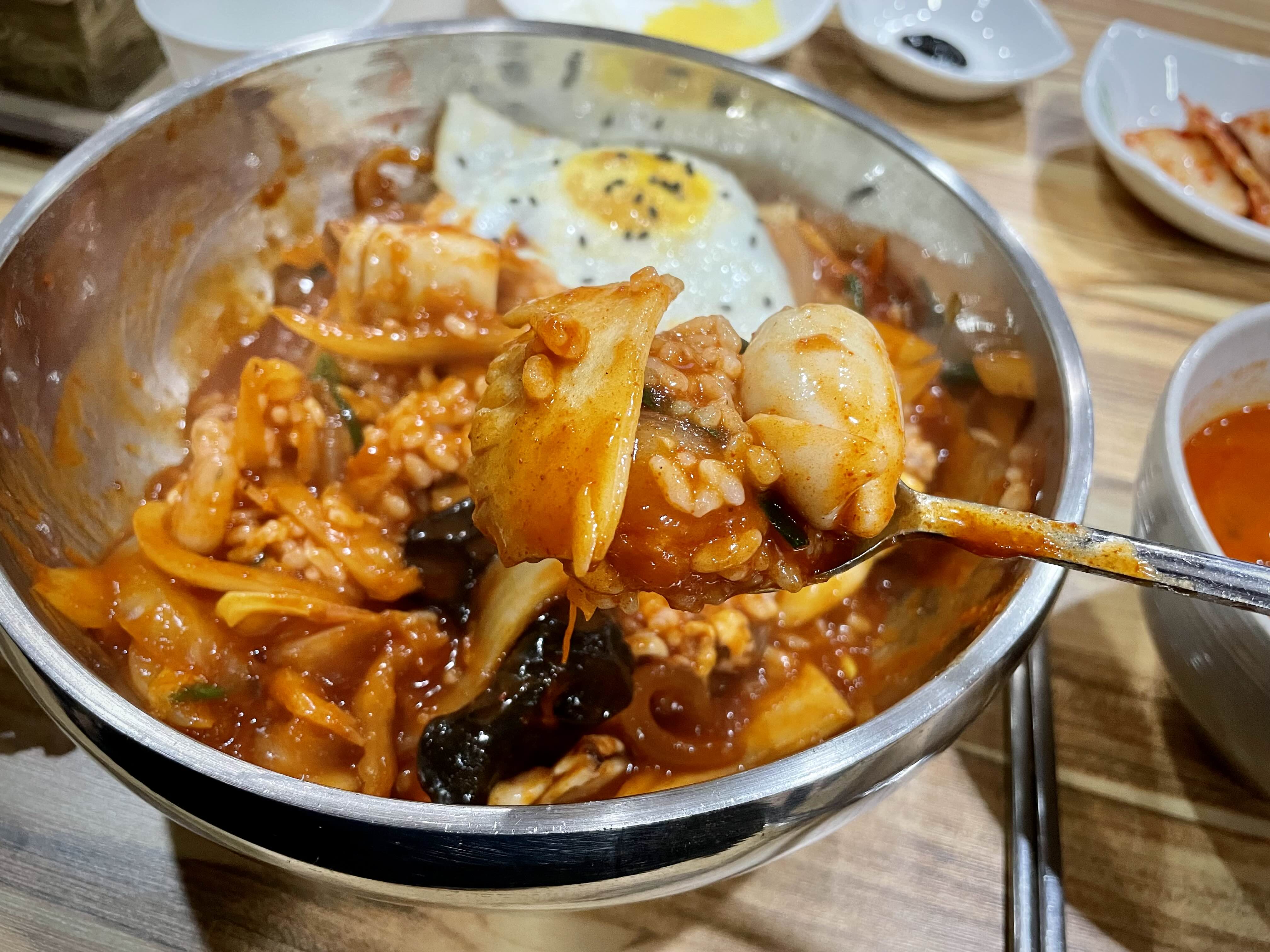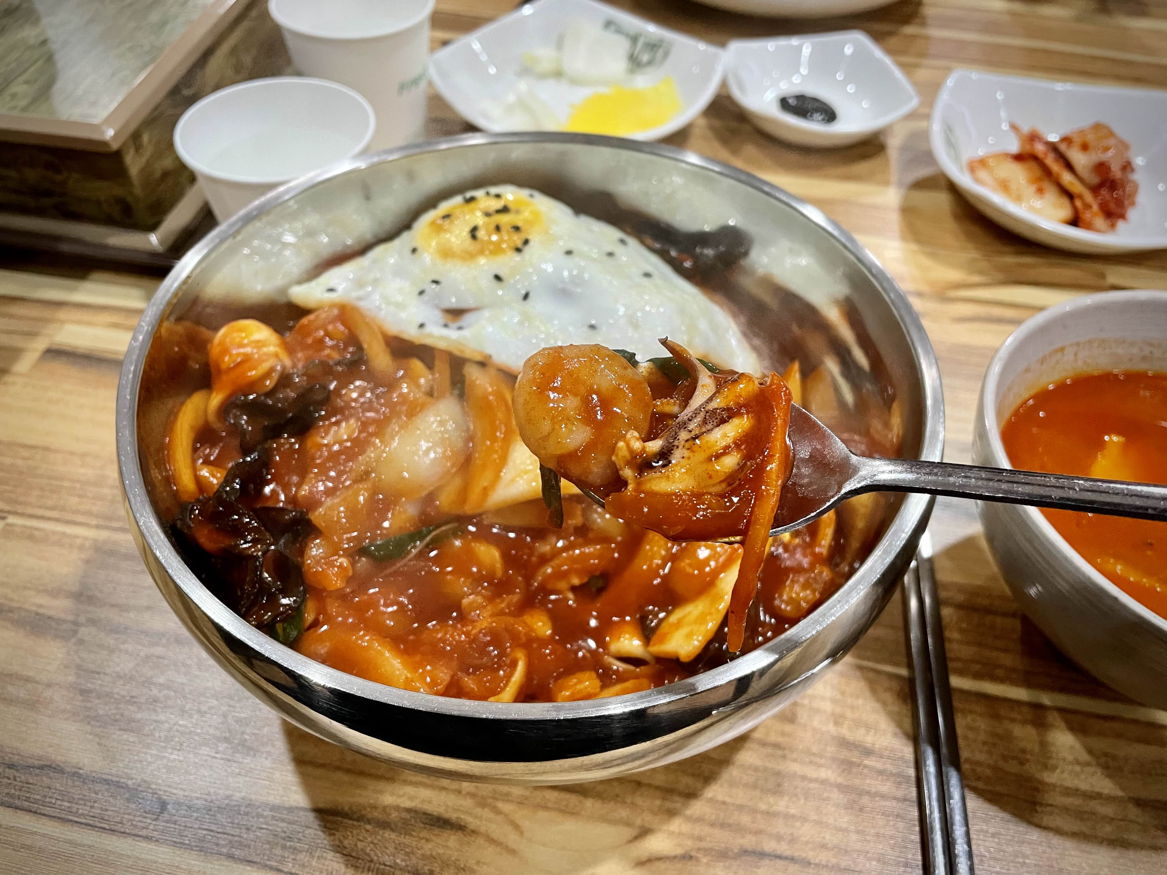 갖가지 해산물과 야채를 볶아서 살짝 매콤한 소스를 밥 위에 얹어서 나오는 메뉴입니다.