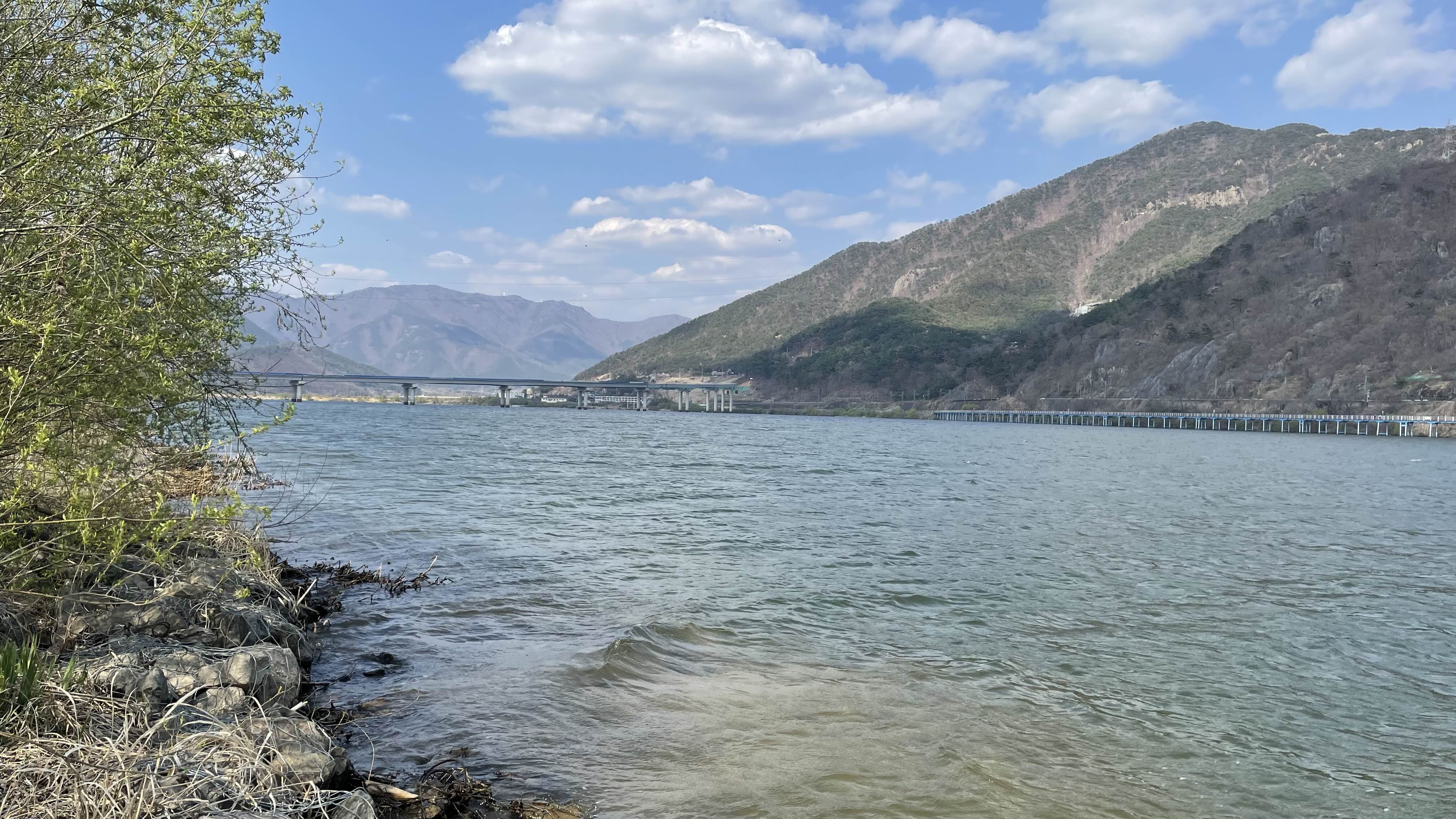 저 멀리 강을 가로 질러 양산과 김해를 잇는 다리 공사가 한창입니다.