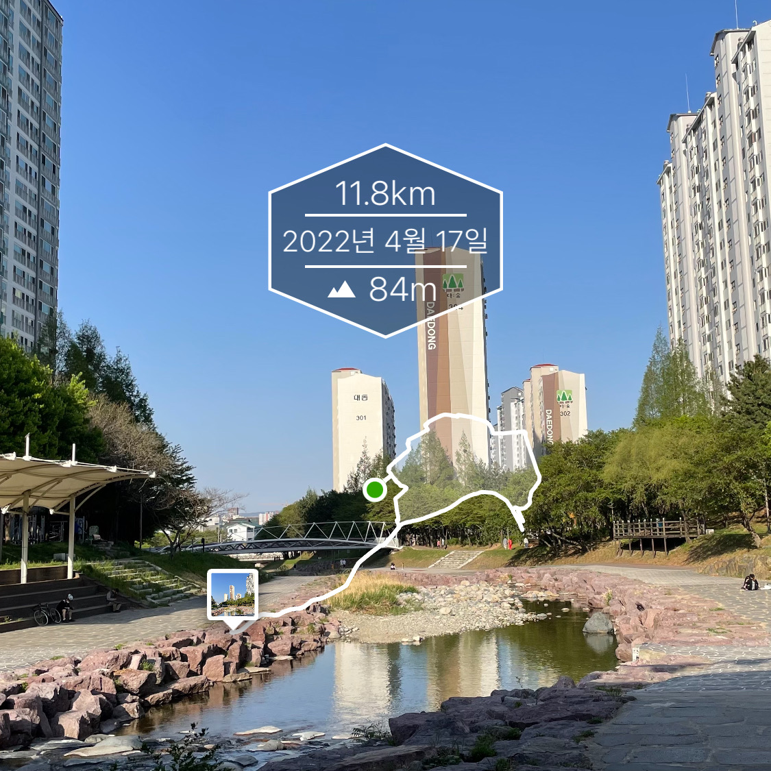 집에서 출발해 대청천 오르막길을 타고 끝까지 올라가서 한숨 돌리고 내려갑니다.